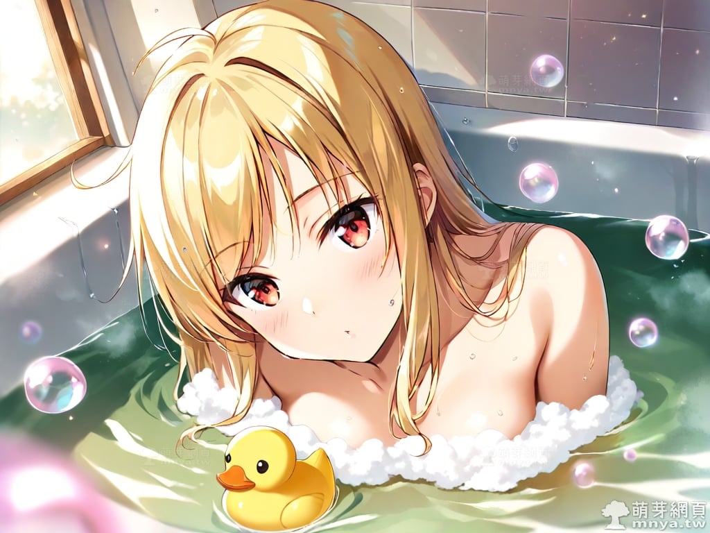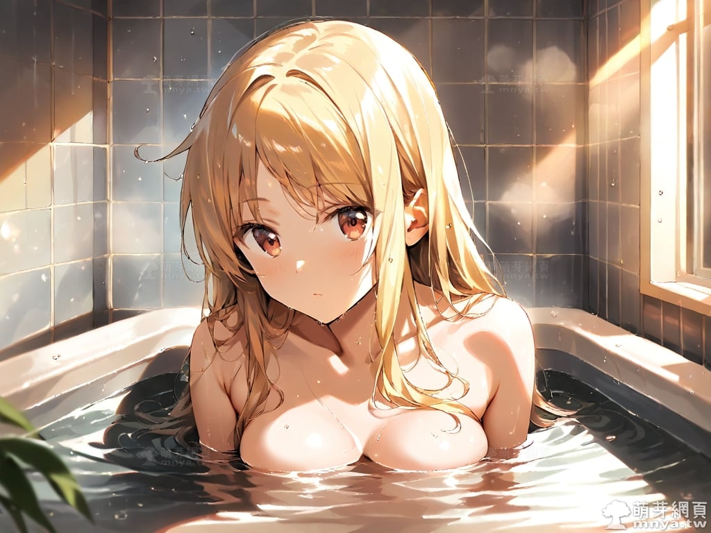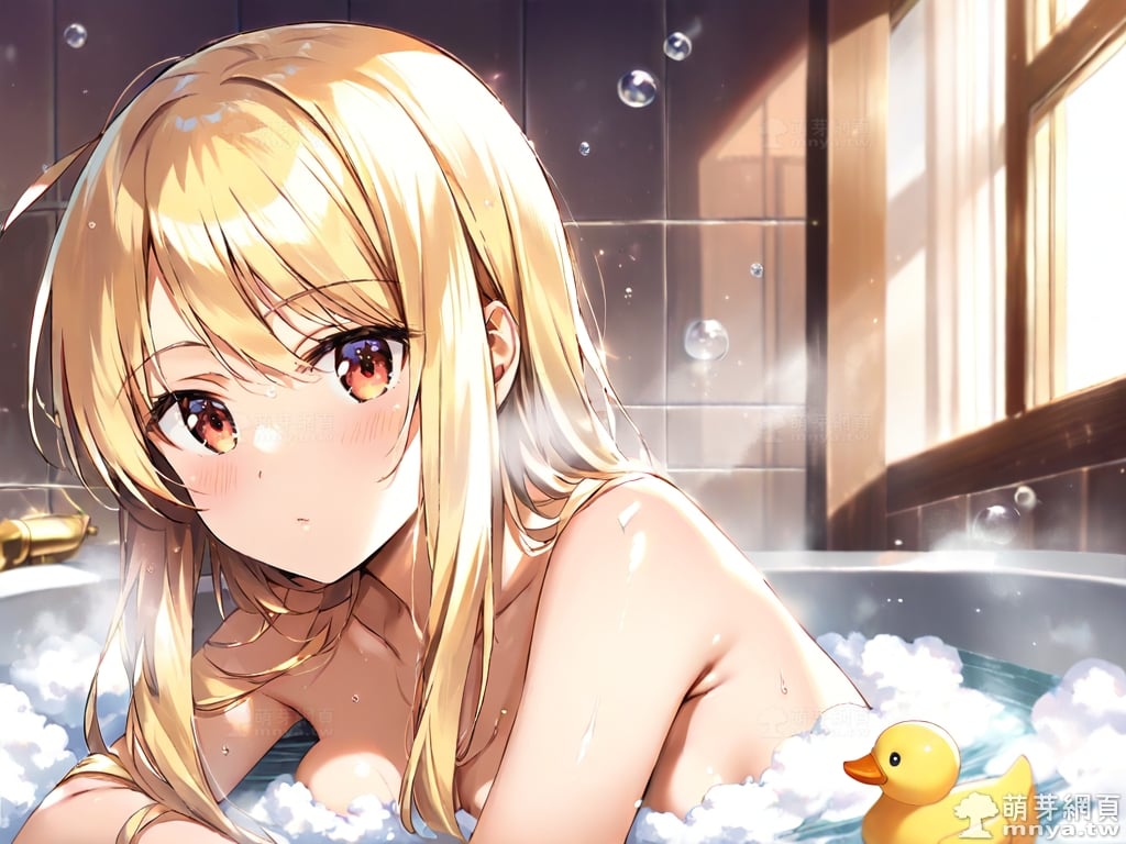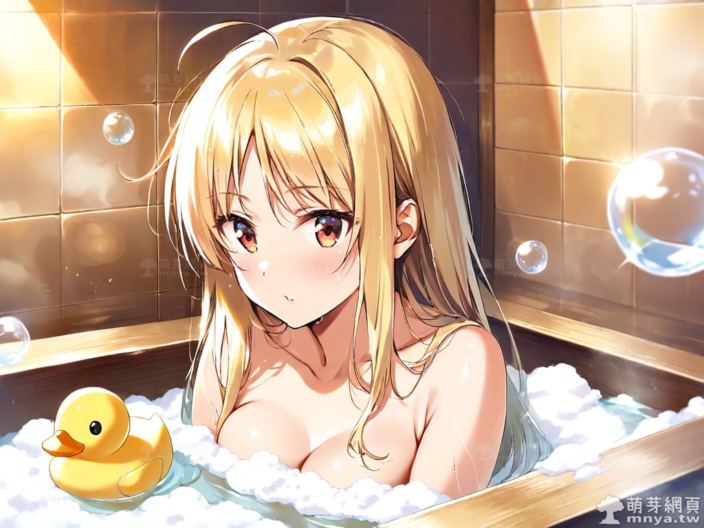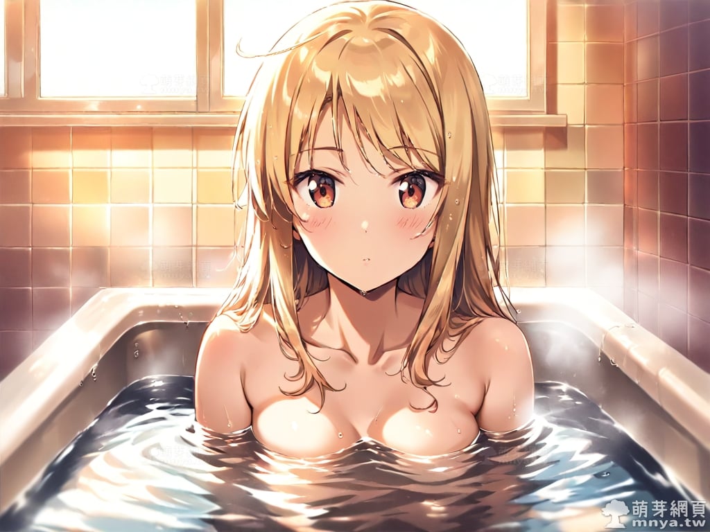 提詞文字:((masterpiece), (soft), (alluring), (high quality):1.3), (photorealistic:0.1), 1girl, solo, solo focus, (shiina mashiro:1.3), (sakura-sou no pet na kanojo), long hair, blonde hair, bangs, ahoge, red eyes, brown eyes, medium breasts, breasts, __bathe__.