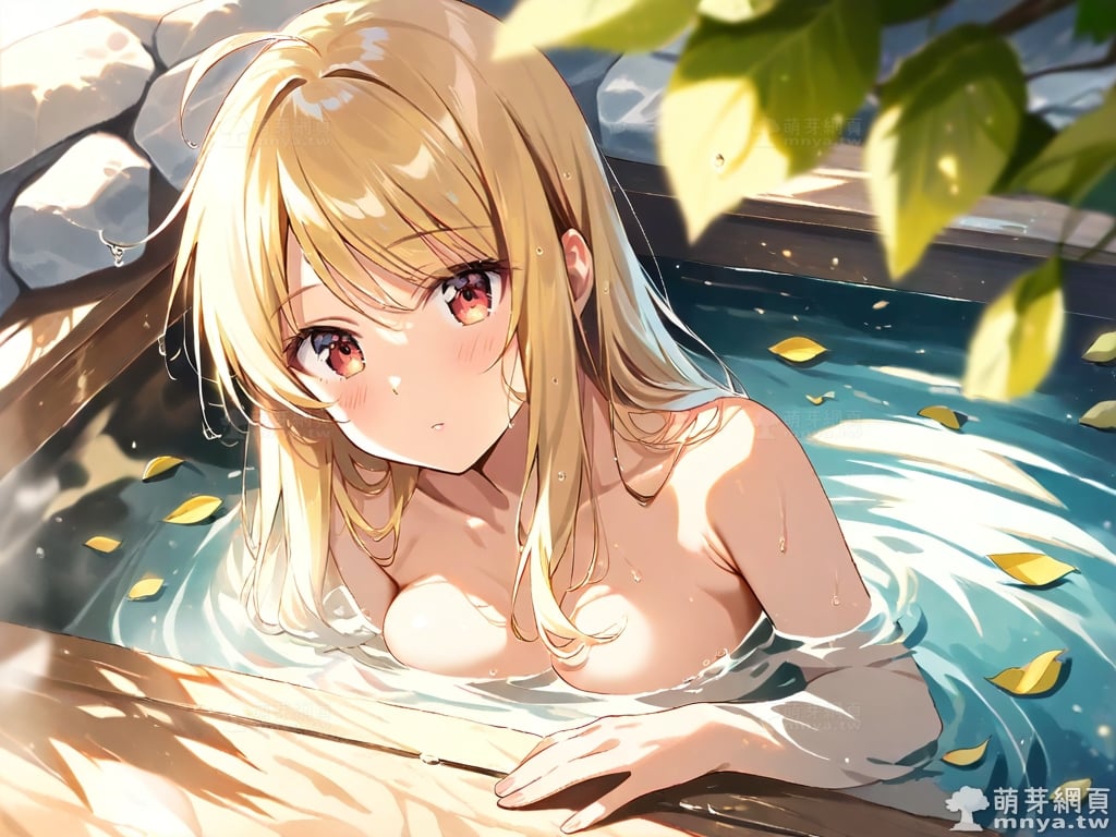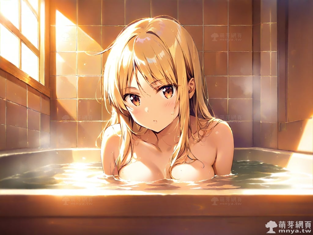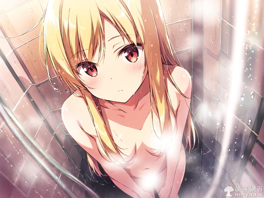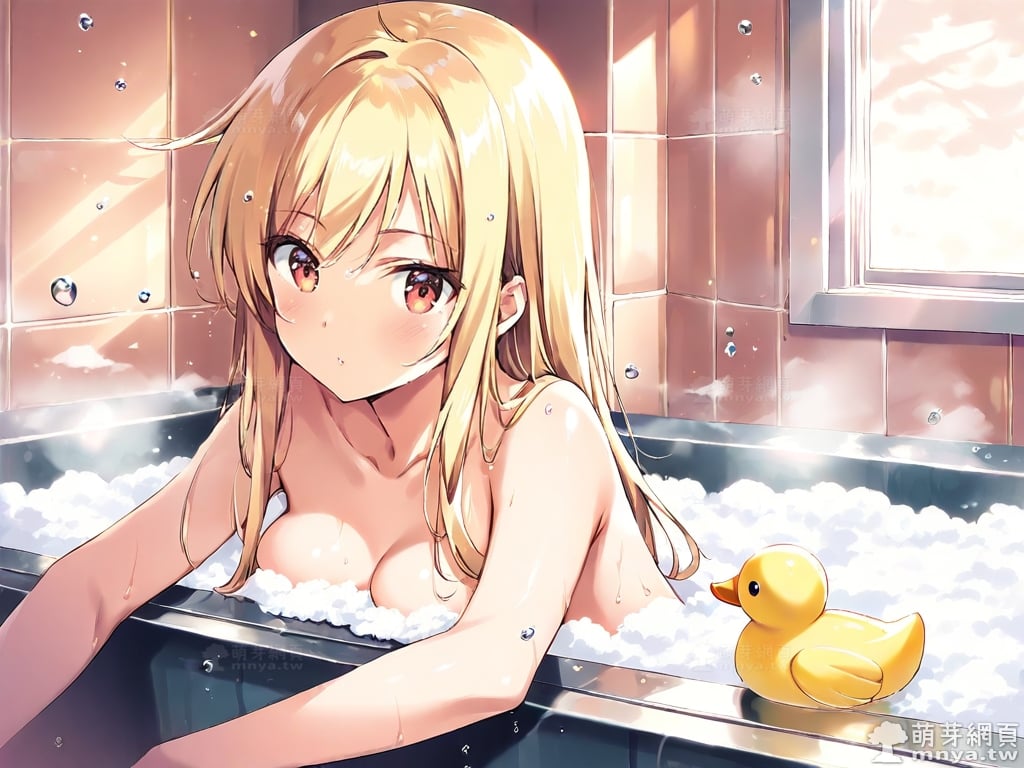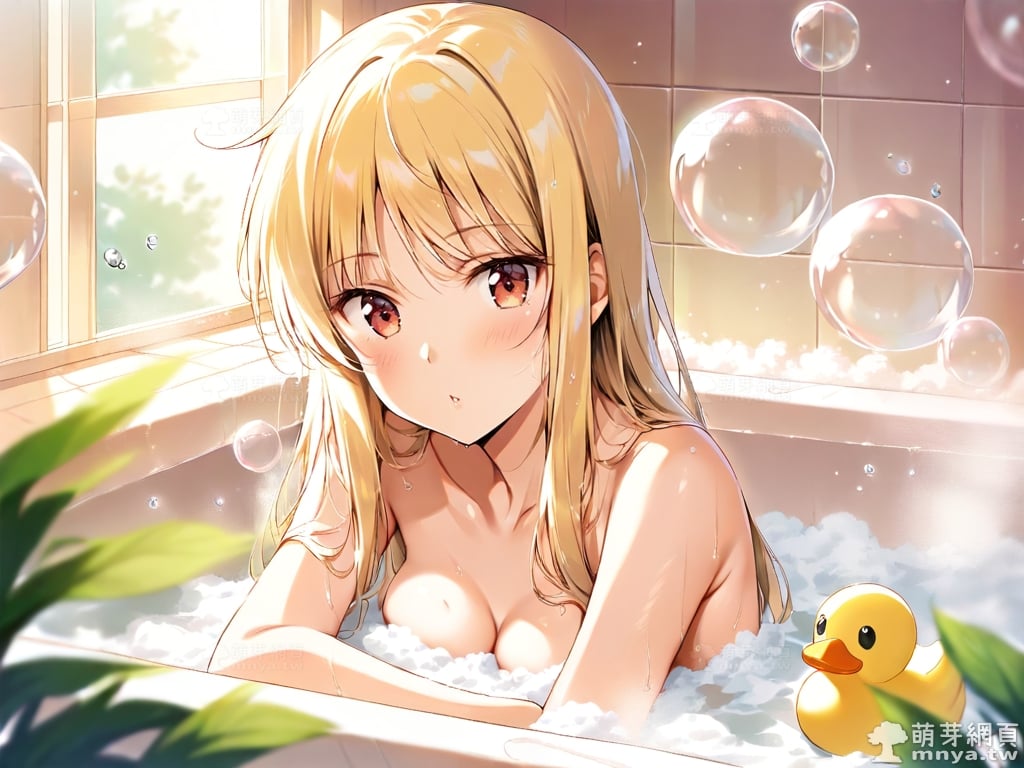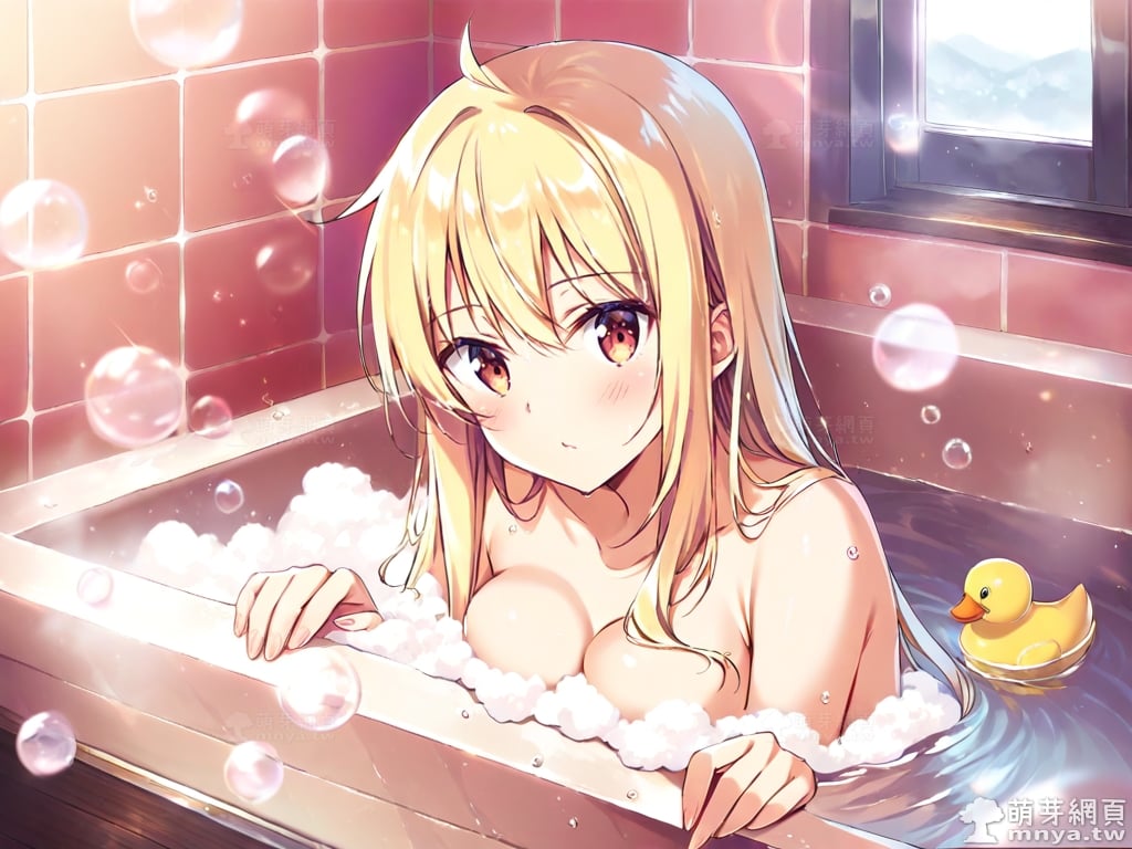 提詞文字:((masterpiece), (soft), (alluring), (high quality):1.3), (photorealistic:0.1), 1girl, solo, solo focus, (shiina mashiro:1.3), (sakura-sou no pet na kanojo), long hair, blonde hair, bangs, ahoge, red eyes, brown eyes, medium breasts, breasts, __bathe__.