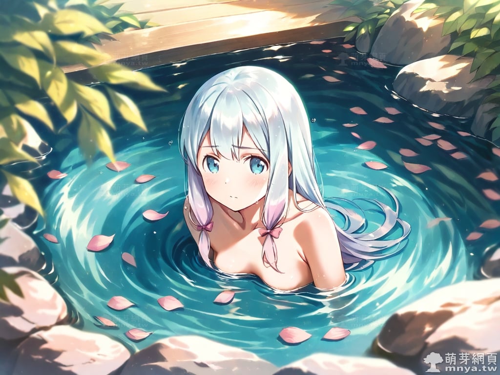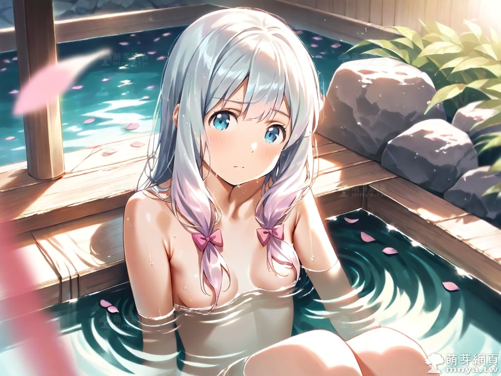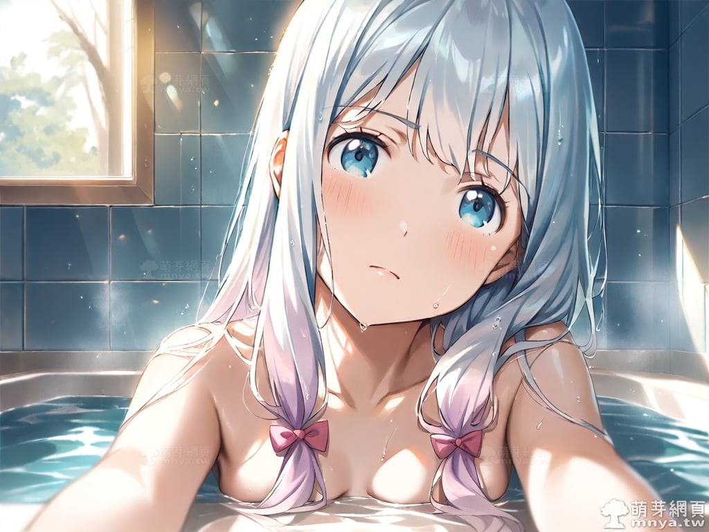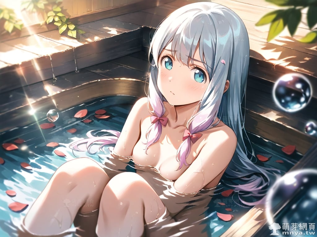 提詞文字:((masterpiece), (soft), (alluring), (high quality):1.3), (photorealistic:0.1), 1girl, solo, solo focus, (izumi sagiri:1.3), (eromanga sensei), long hair, white hair, blue eyes, small breasts, breasts, __bathe__.