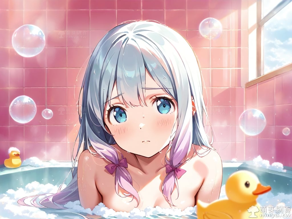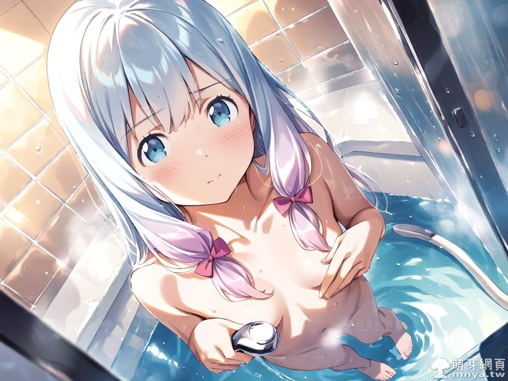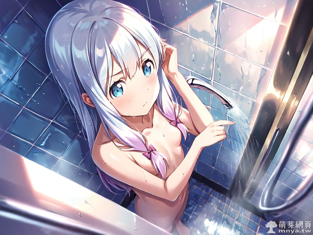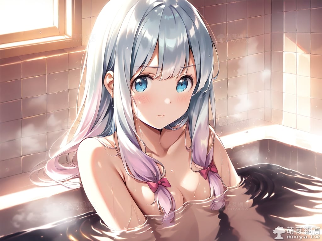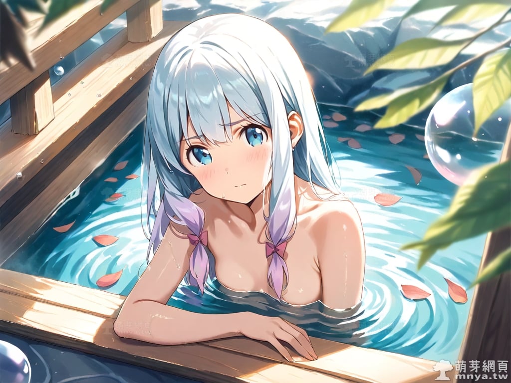 提詞文字:((masterpiece), (soft), (alluring), (high quality):1.3), (photorealistic:0.1), 1girl, solo, solo focus, (izumi sagiri:1.3), (eromanga sensei), long hair, white hair, blue eyes, small breasts, breasts, __bathe__.