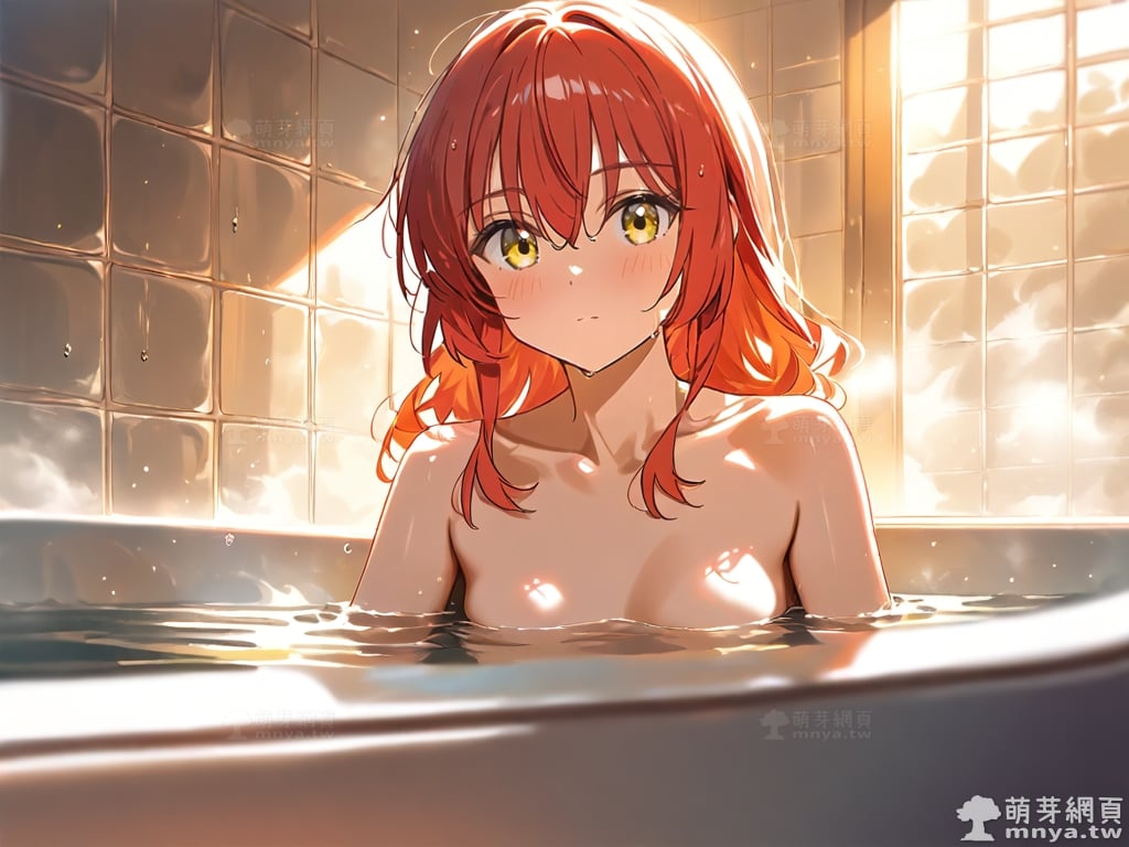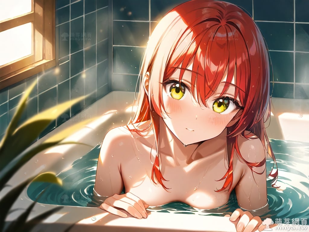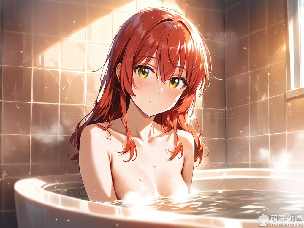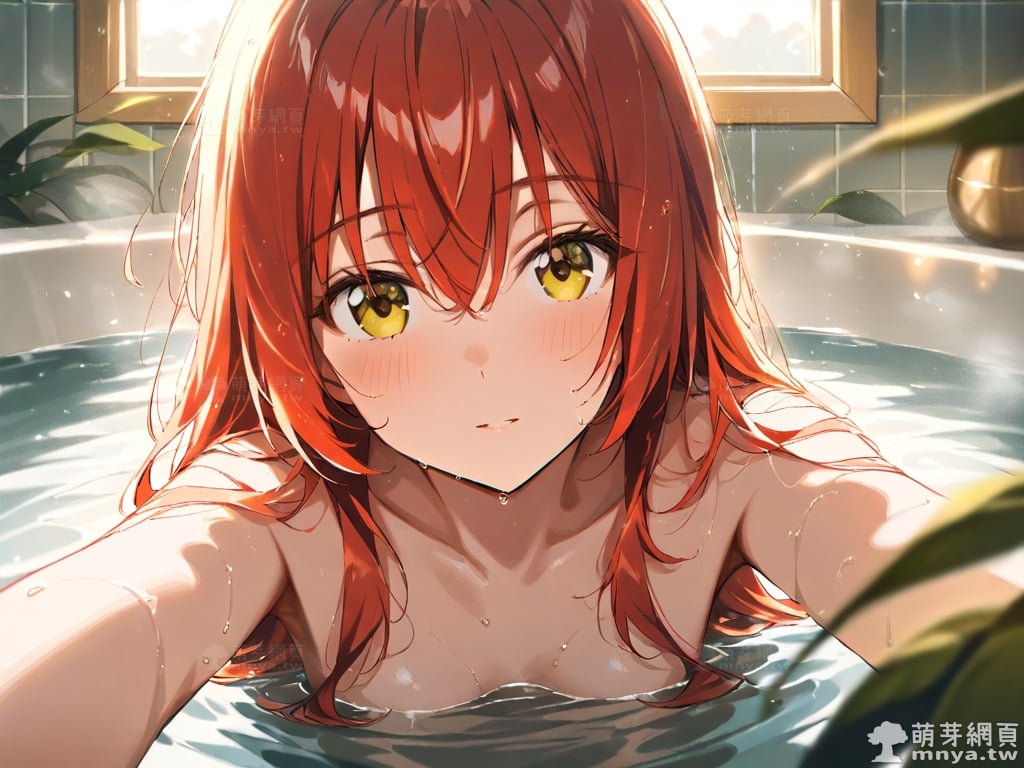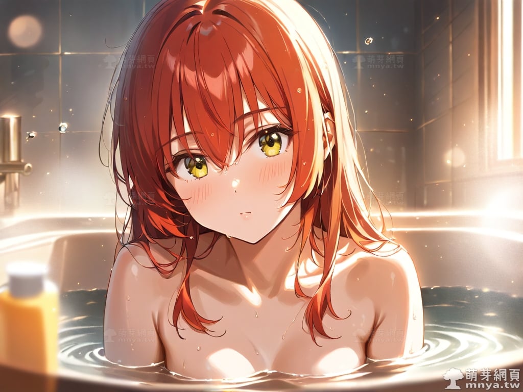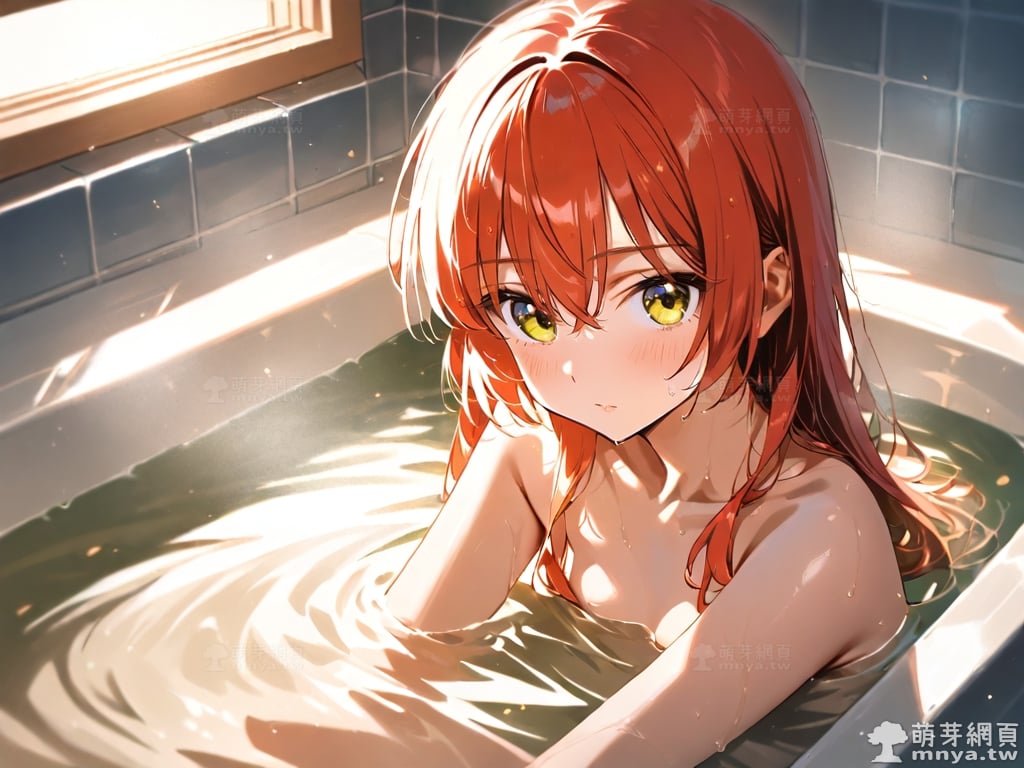 提詞文字:((masterpiece), (soft), (alluring), (high quality):1.3), (photorealistic:0.1), 1girl, solo, solo focus, (kita ikuyo:1.3), (bocchi the rock!), long hair, red hair, bangs, hair between eyes, yellow eyes, small breasts, breasts, __bathe__.