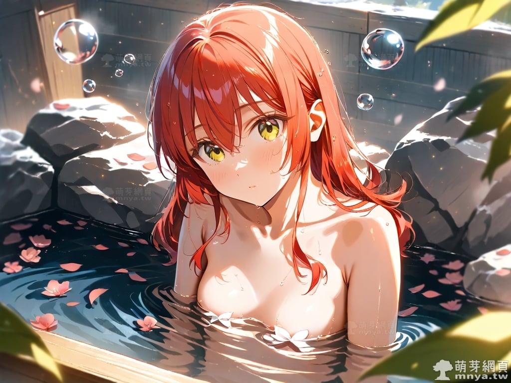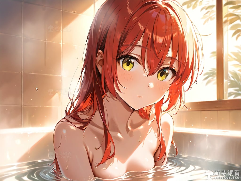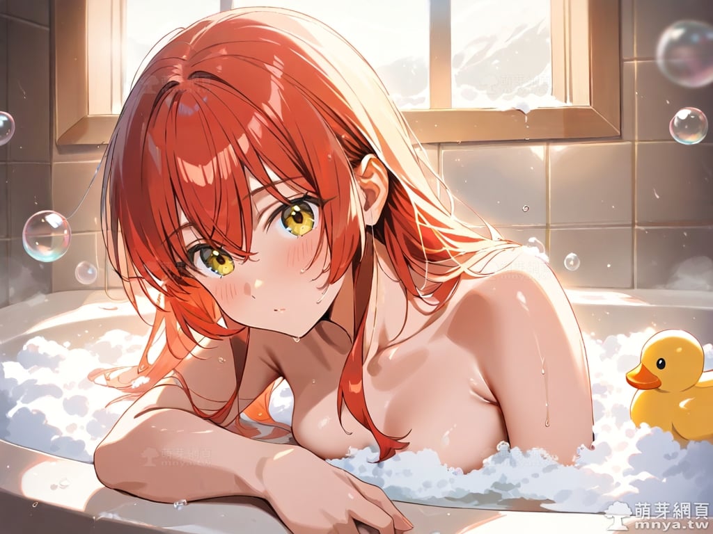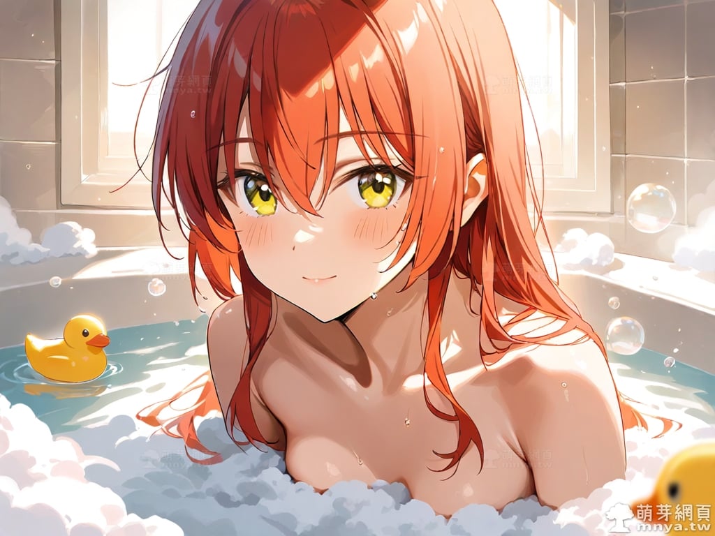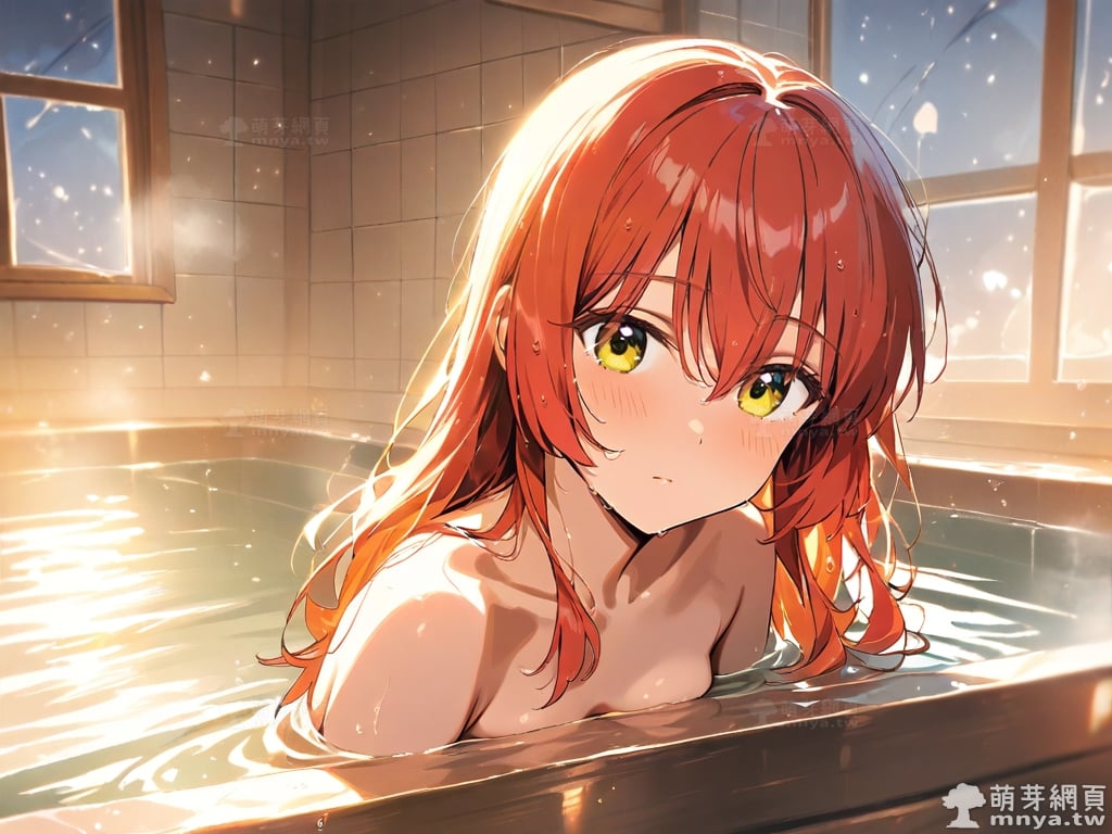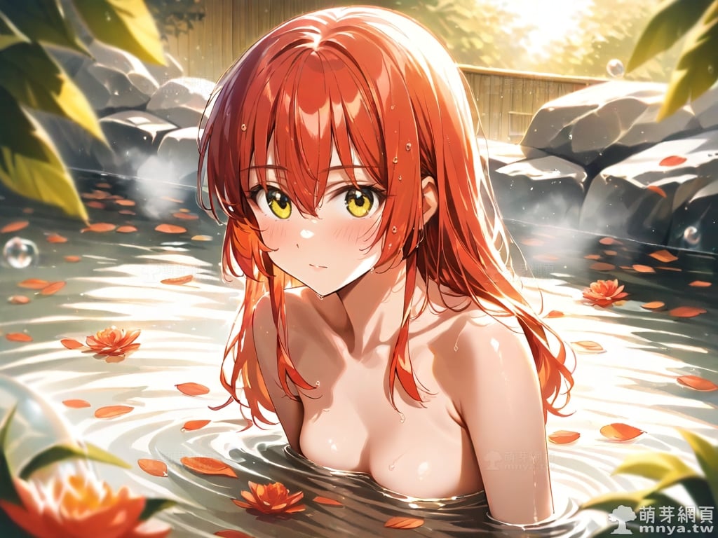 提詞文字:((masterpiece), (soft), (alluring), (high quality):1.3), (photorealistic:0.1), 1girl, solo, solo focus, (kita ikuyo:1.3), (bocchi the rock!), long hair, red hair, bangs, hair between eyes, yellow eyes, small breasts, breasts, __bathe__.