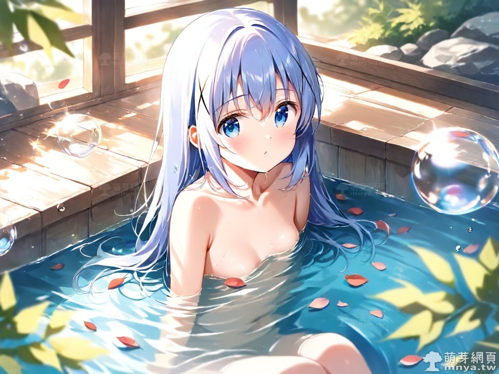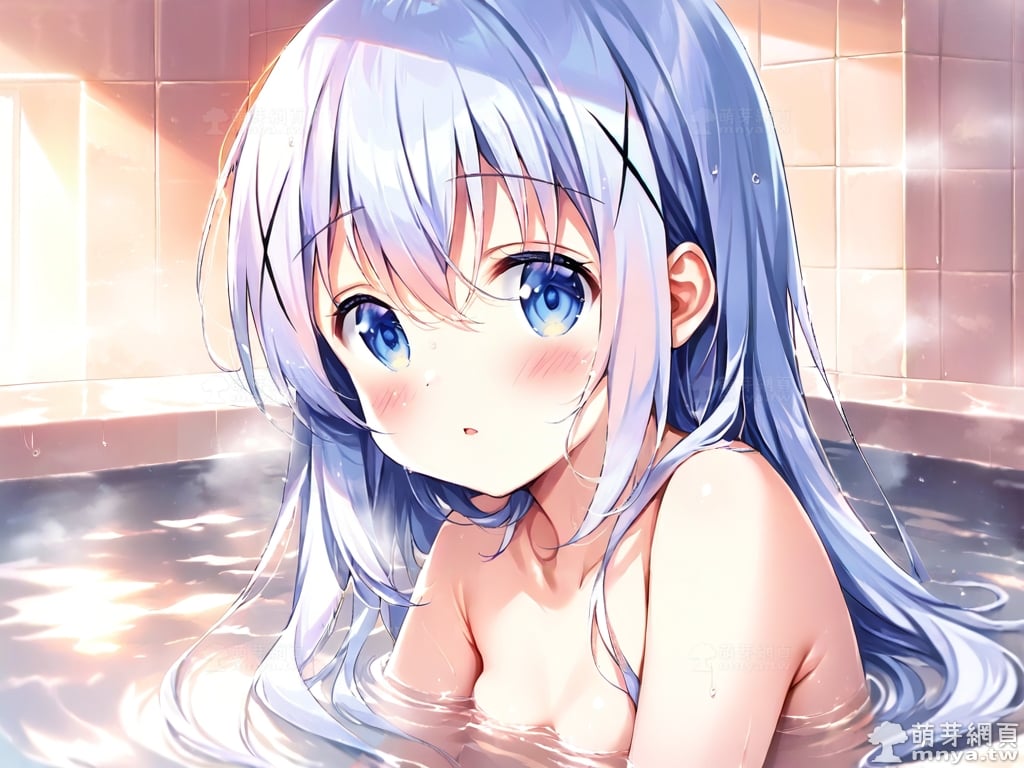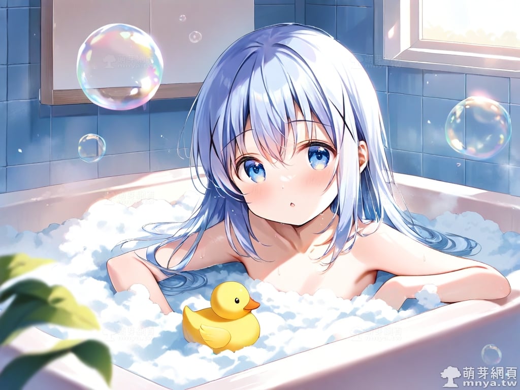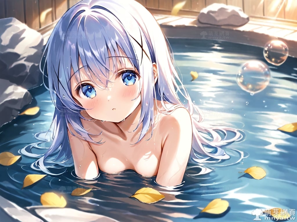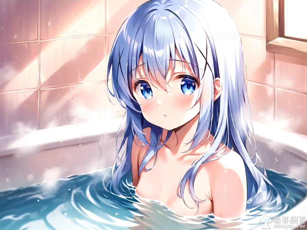 提詞文字:((masterpiece), (soft), (alluring), (high quality):1.3), (photorealistic:0.1), 1girl, solo, solo focus, (kafuu chino:1.3), (gochuumon wa usagi desu ka?), loli, long hair, blue hair, hair between eyes, blue eyes, small breasts, breasts, __bathe__.