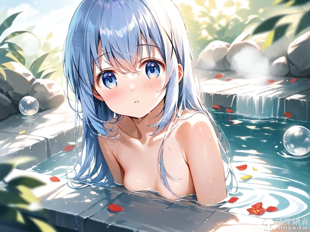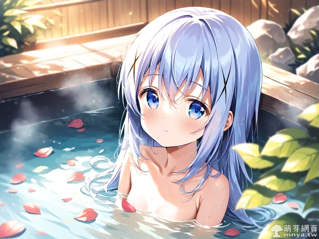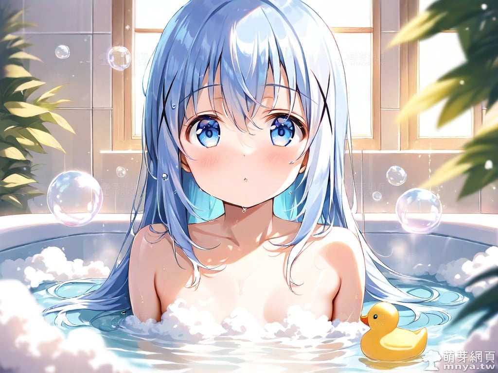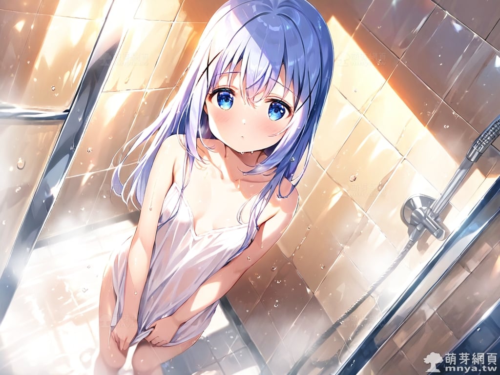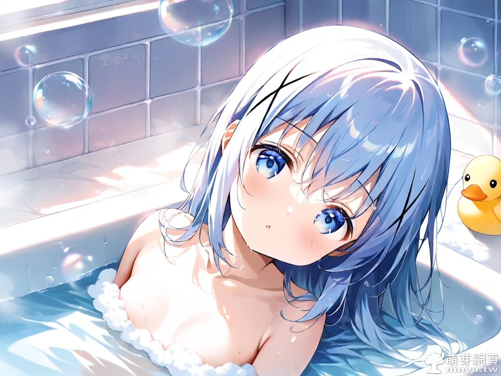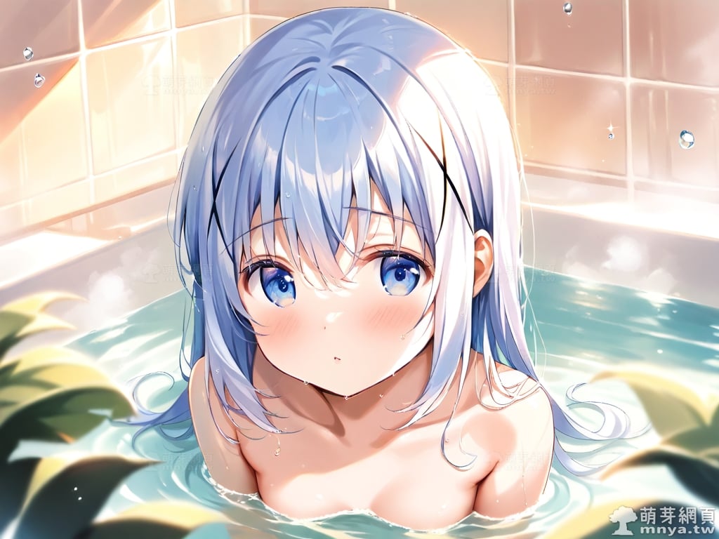 提詞文字:((masterpiece), (soft), (alluring), (high quality):1.3), (photorealistic:0.1), 1girl, solo, solo focus, (kafuu chino:1.3), (gochuumon wa usagi desu ka?), loli, long hair, blue hair, hair between eyes, blue eyes, small breasts, breasts, __bathe__.