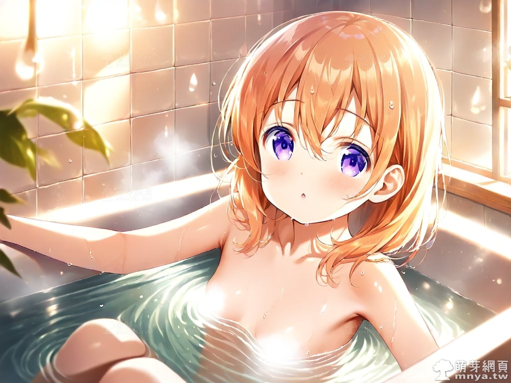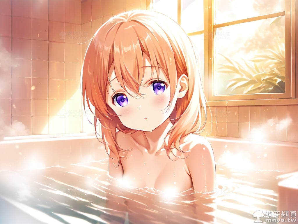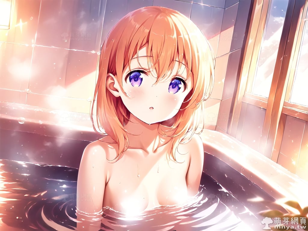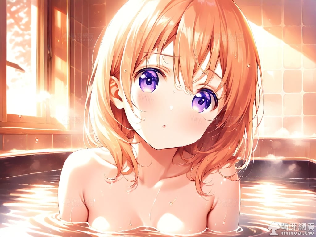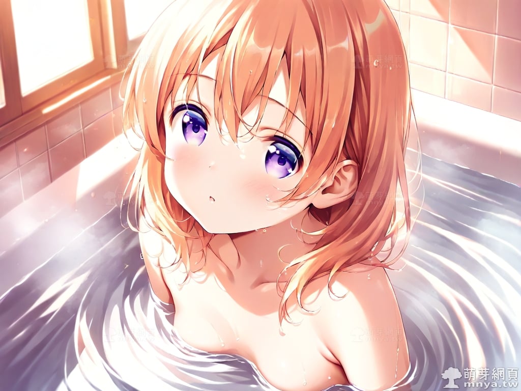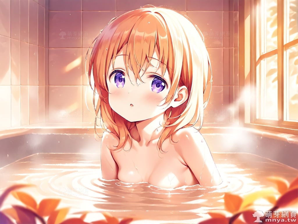 提詞文字:((masterpiece), (soft), (alluring), (high quality):1.3), (photorealistic:0.1), 1girl, solo, solo focus, (hoto cocoa:1.3), (gochuumon wa usagi desu ka?), loli, medium hair, orange hair, hair between eyes, purple eyes, small breasts, breasts, __bathe__.