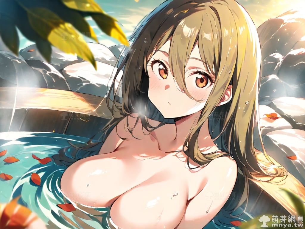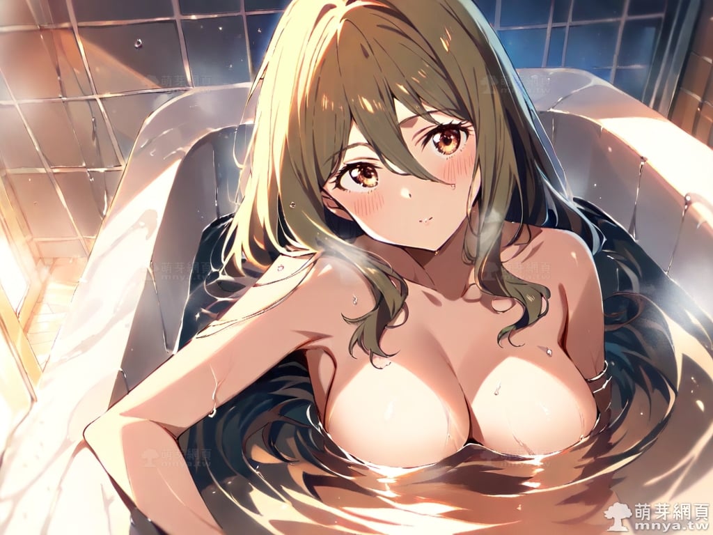 提詞文字:((masterpiece), (soft), (alluring), (high quality):1.3), 1girl, solo, solo focus, (nakahara mizuki:1.5), (lycoris recoil:1.5), long hair, brown hair, hair between eyes, brown eyes, large breasts, breasts, __bathe__.