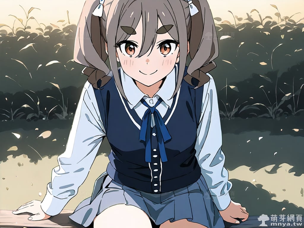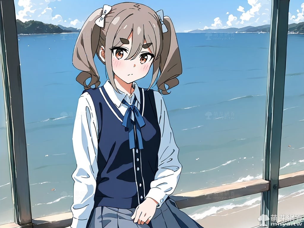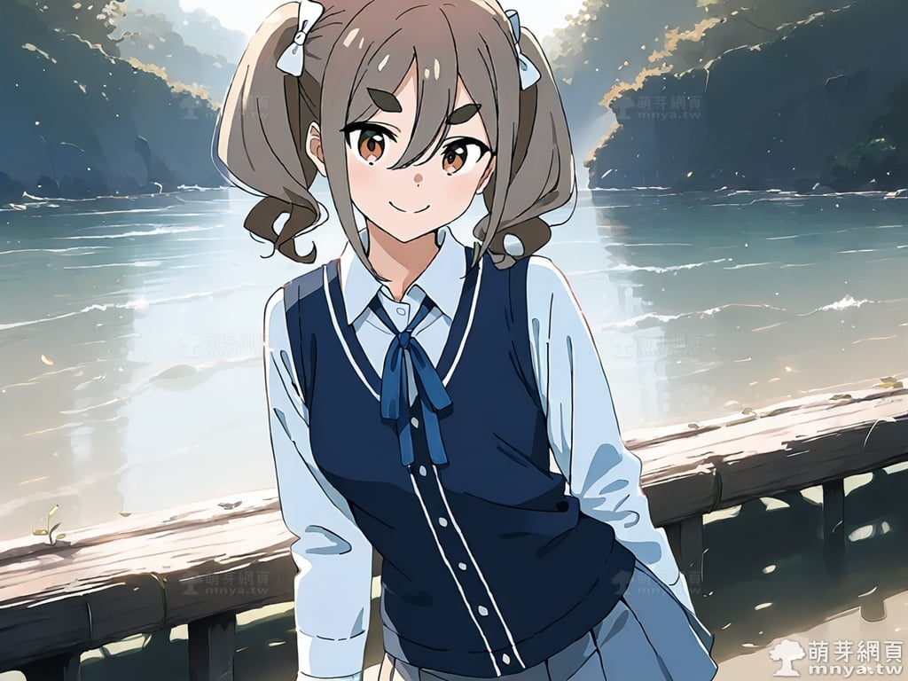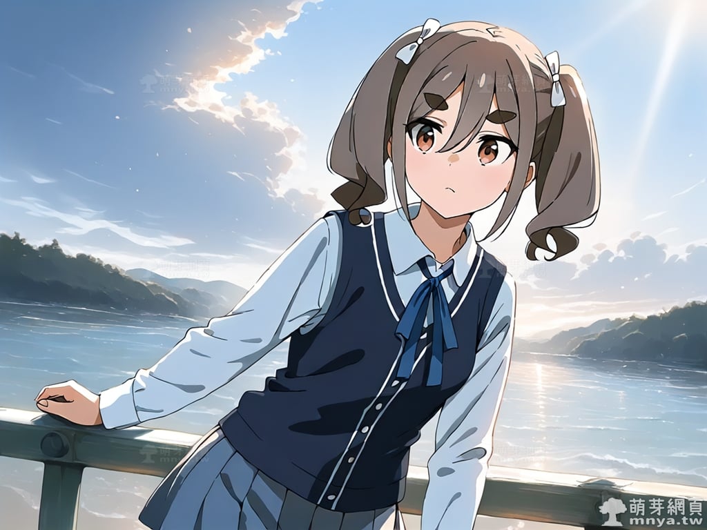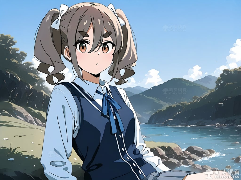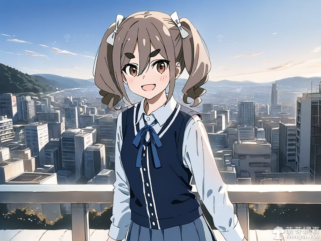 提詞文字:((masterpiece), (high quality), (high score), (great score):1.2), (photorealistic:0.5), 1girl, solo, (kiriyama an:1.3), __posture__, upper body, brown hair, twintails, bangs, hair bow, white bow, bow, hair between eyes, brown eyes, thick eyebrows, ribbon, blue ribbon, neck ribbon, short eyebrows, skirt, white shirt, pleated skirt, shirt, collared shirt, grey skirt, long sleeves, dress shirt, school uniform, blue skirt, sweater vest, black vest, small breasts, breasts, cowboy shot, __looking__, __expression__, __background__. <lora:kiriyama_an_XL:1>
