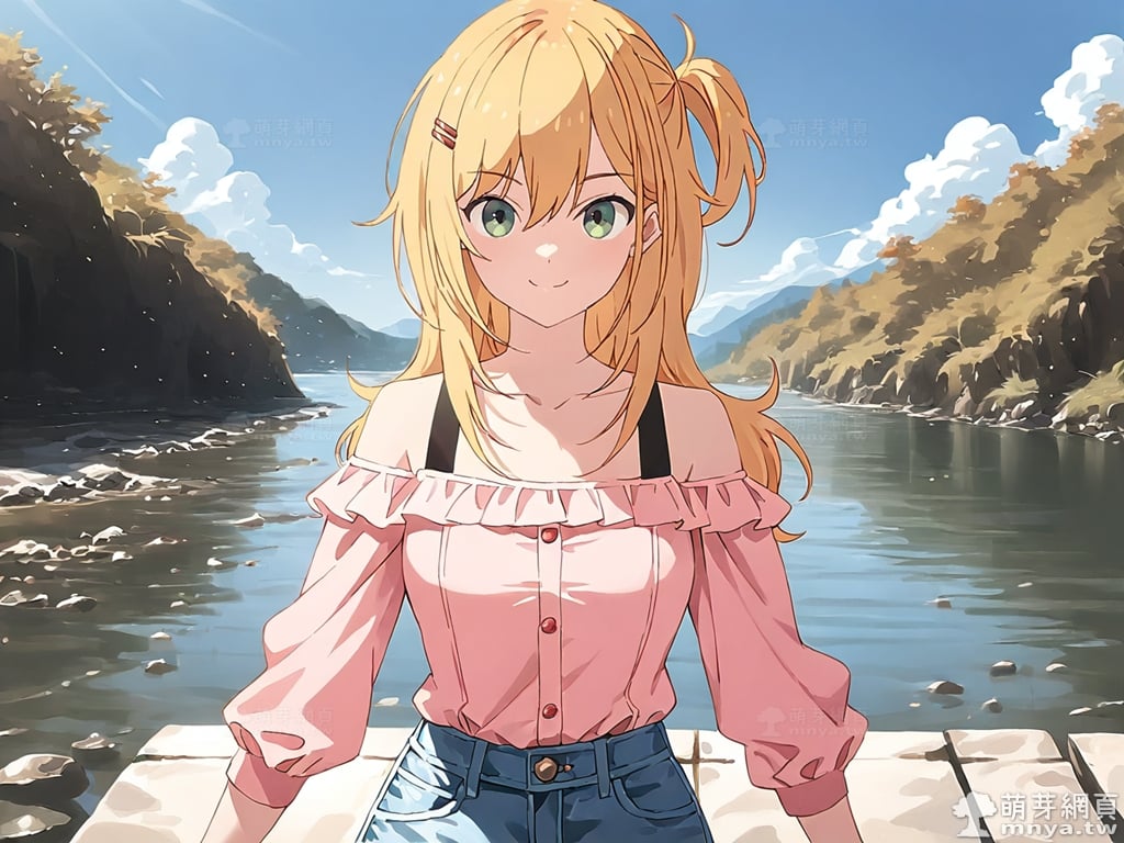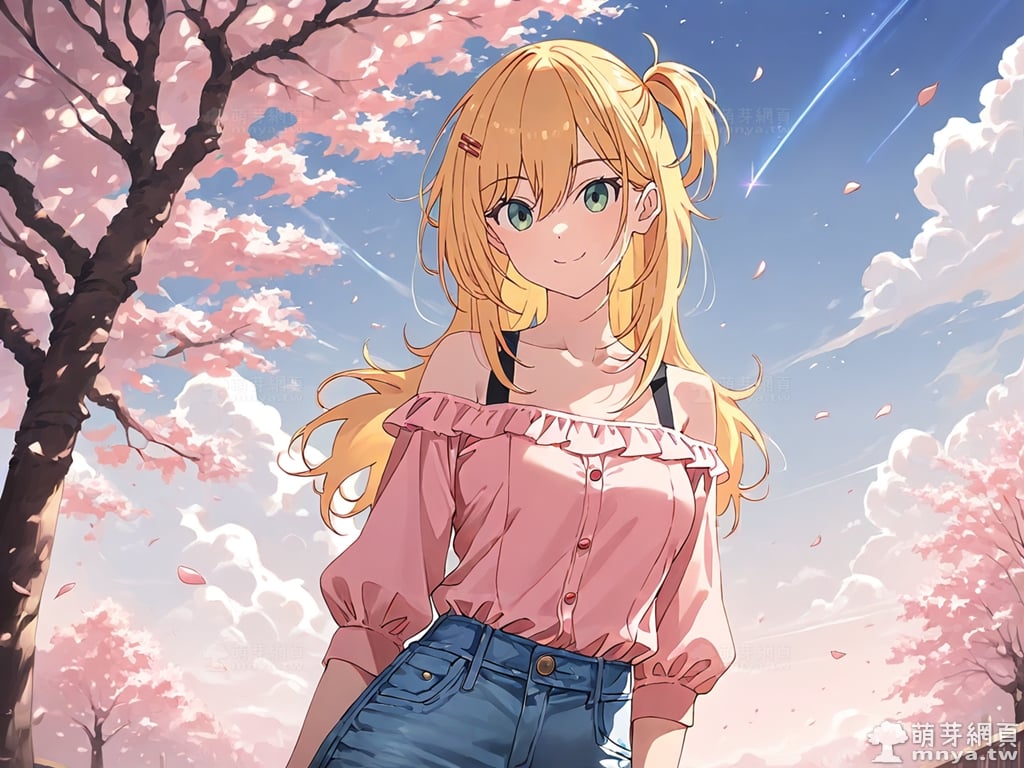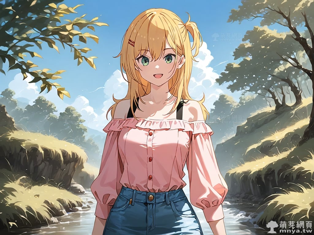 提詞文字:((masterpiece), (high quality), (high score), (great score):1.2), (photorealistic:0.5), 1girl, solo, (hoshi nana:1.3), __posture__, upper body, long hair, blonde hair, one side up, hair ornament, = hair ornament, hairclip, bangs, hair between eyes, green eyes, shirt, off-shoulder shirt, blue skirt, skirt, denim skirt, long sleeves, bare shoulders, off shoulder, pink shirt, collarbone, puffy sleeves, pencil skirt, denim, red footwear, medium breasts, breasts, cowboy shot, __looking__, __expression__, __background__. <lora:hoshi_nana_XL:1>
