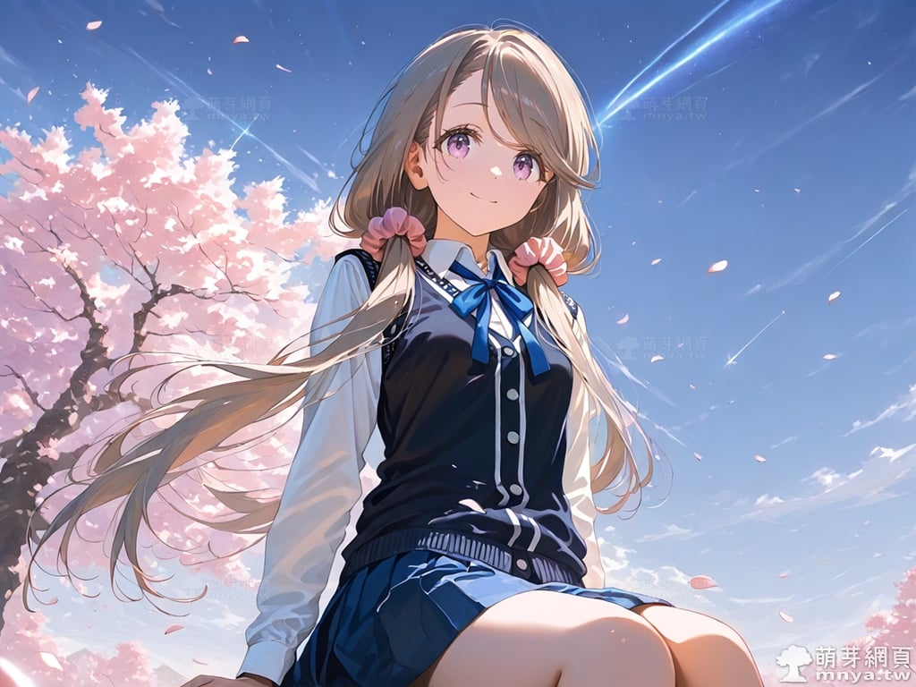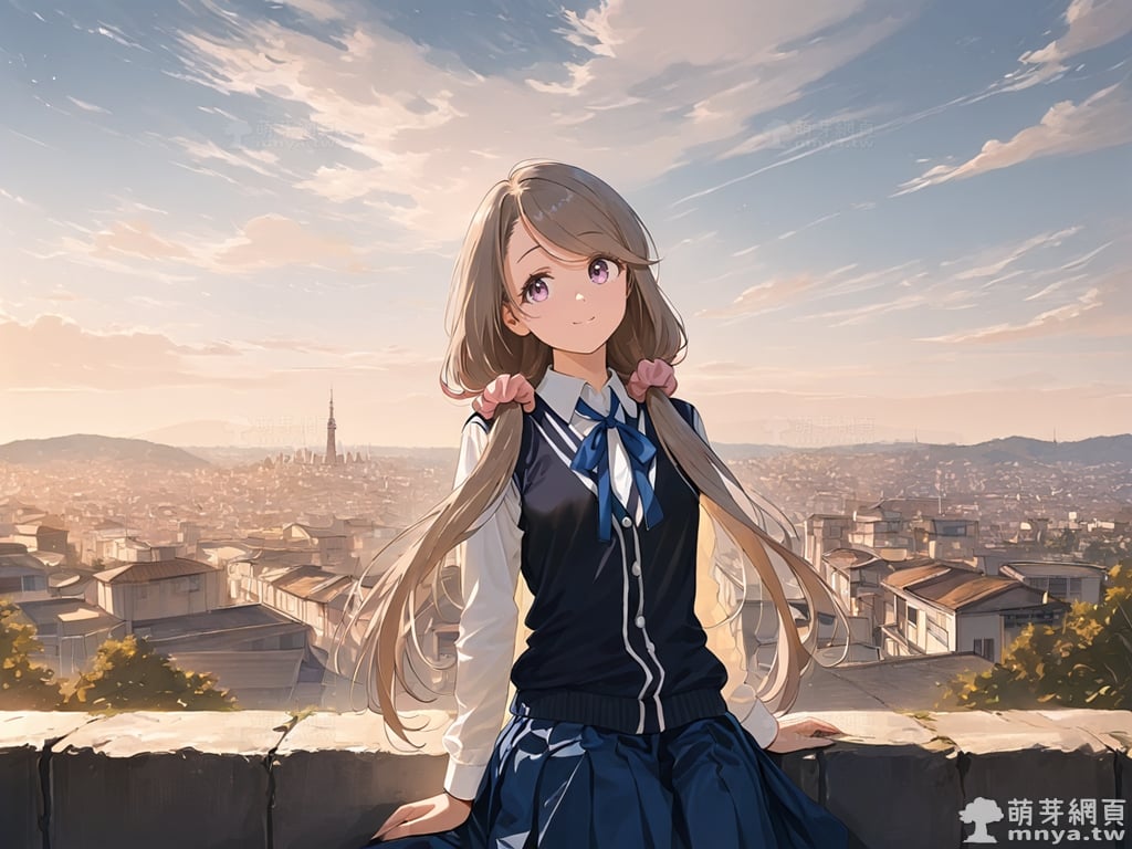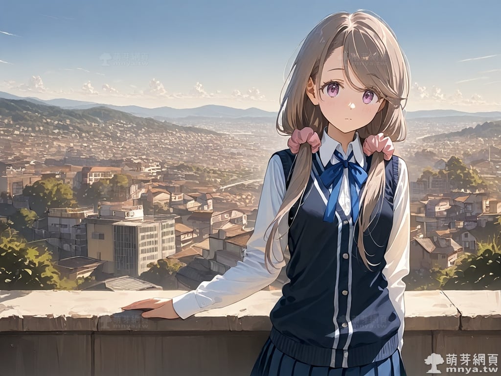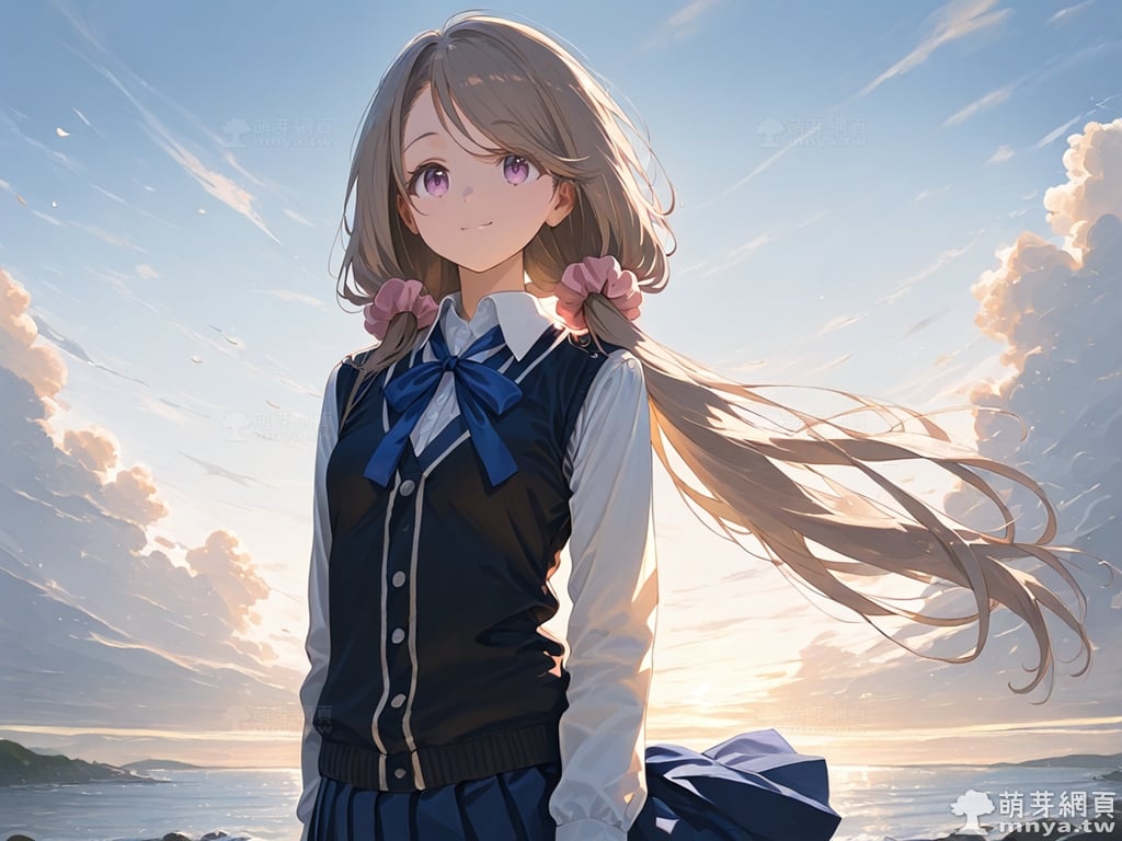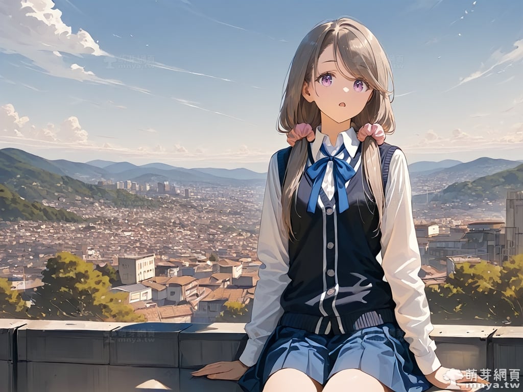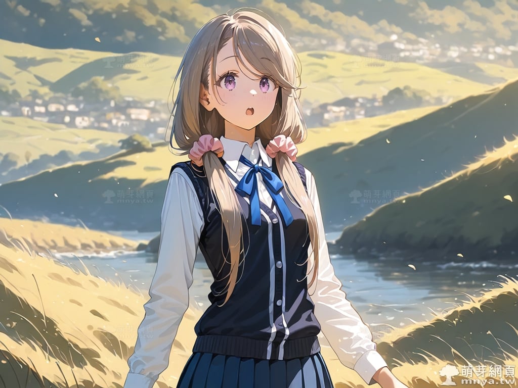 提詞文字:((masterpiece), (high quality), (high score), (great score):1.2), (photorealistic:0.5), 1girl, solo, (shikishima sakurako:1.3), __posture__, upper body, long hair, very long hair, grey hair, brown hair, low twintails, twintails, scrunchie, hair scrunchie, pink scrunchie, swept bangs, bangs, purple eyes, ribbon, blue ribbon, neck ribbon, skirt, shirt, white shirt, pleated skirt, collared shirt, long sleeves, dress shirt, school uniform, blue skirt, vest, sweater vest, black vest, small breasts, breasts, cowboy shot, __looking__, __expression__, __background__. <lora:shikishima_sakurako_XL:1>