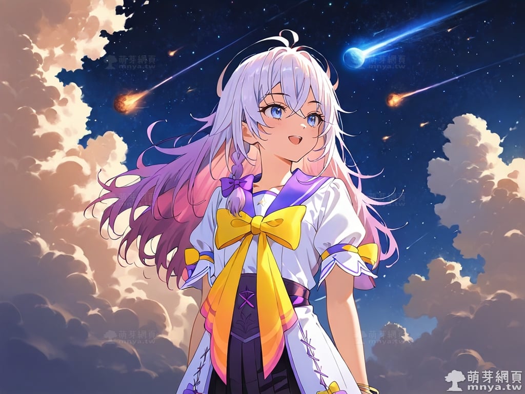 __background__:outdoors, starry sky, night sky, sunset\nnight, night sky, cloudy sky, meteor, planet, cloud, star (sky), (starry sky:1.2)\n(outdoors), day, blue sky, cloud, nature, tree\noutdoors, day, blue sky, cloud, water\noutdoors, day, grass\ncherry blossoms, tree, outdoors, shooting star, petals, cloud\noutdoors, city, cityscape, scenery, building