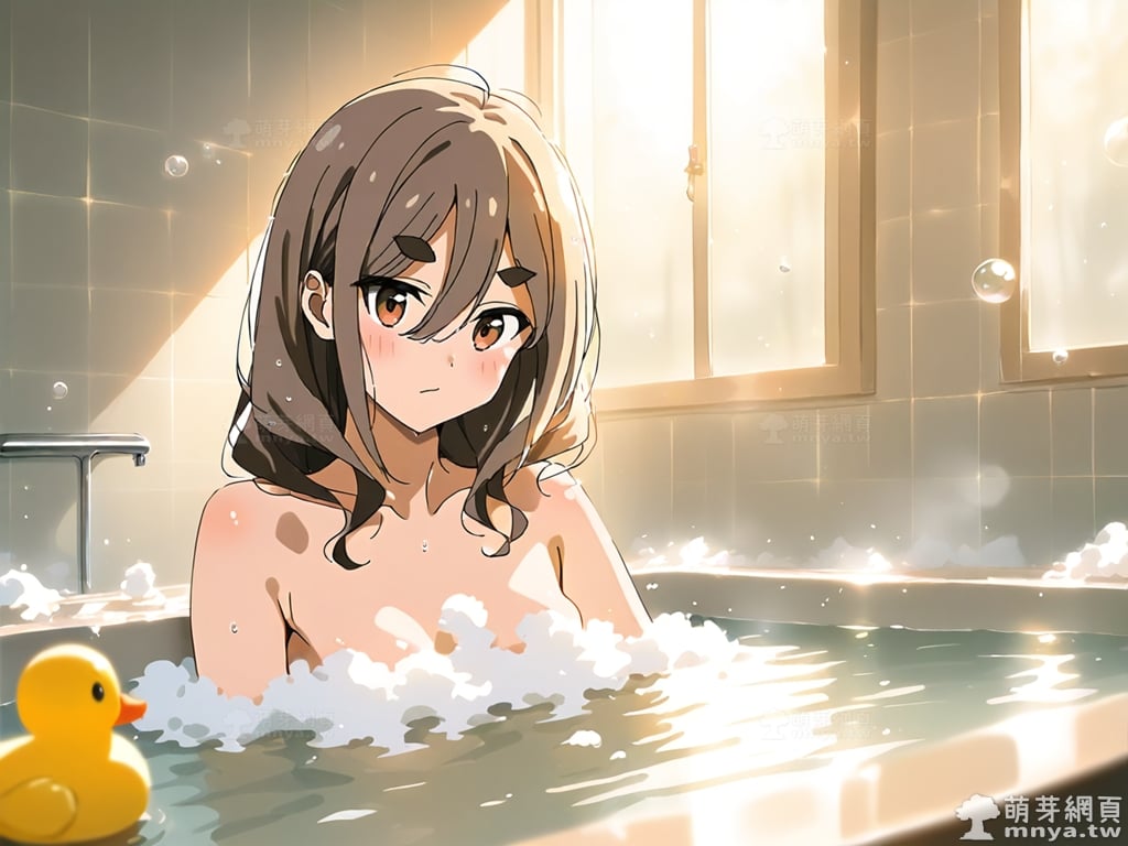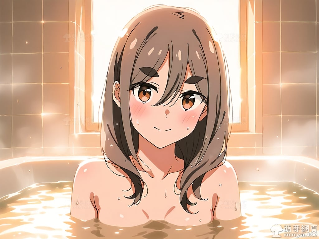 提詞文字:((masterpiece), (soft), (alluring), (high quality):1.3), (photorealistic:0.5), 1girl, solo, solo focus, (kiriyama an:1.3), brown hair, bangs, hair between eyes, brown eyes, thick eyebrows, small breasts, breasts, __bathe__. <lora:kiriyama_an_XL:1>