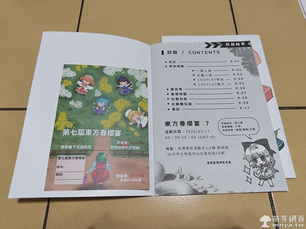 2025 年 5 月 17 日星期六「東方春櫻宴 7」在台北市士林區劍潭青年活動中心二樓群英堂舉行,這是一場東方 Project 的 Only 同人活動,吸引了無數東方眾齊聚一堂,場內共有 96 個社團攤位,從熟悉的創作圈常客到首次登場的新面孔,整體氣氛熱鬧非凡。主辦方用心策劃,讓人從踏進會場那刻就能感受到濃濃的幻想鄉氛圍。無論是資深粉絲還是第一次參加的新人,都能在這裡找到屬於自己的樂趣與感動。活動時間從早上 8:30 社團入場開始,接續到 COSER 與一般觀眾的進場,會場不僅有攤位販售及交流,更安排了一系列精彩節目,包含「騷靈三姊妹的東方音樂」、午後的「東方知識大問答」與「煉獄的招待狀」遊戲挑戰,以及 COSER 大合照與最後壓軸的「針妙丸的萬寶抽獎」。第一次參加像「東方春櫻宴 7」這樣的小型同人展,蠻有趣的。入場前購入場刊(入場費)新台幣 200 元。