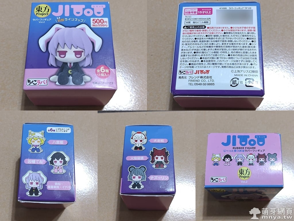 ▲ 另一盒開箱是「東方Project じとっと Vol.2」,新台幣 90 元,該系列以特有的「ジト目」(半睜眼)表情呈現,彩盒設計簡潔可愛,期待中獎角色!Vol.2 的主題為「妖獸」角色,收錄了以下六位來自《東方Project》的角色:因幡てゐ(因幡帝)、鈴仙・優曇華院・イナバ(鈴仙·優曇華院·因幡)、ナズーリン(娜茲琳)、火焔猫燐(火焰貓燐)、八雲藍(八雲藍)與犬走椛(犬走椛) 。