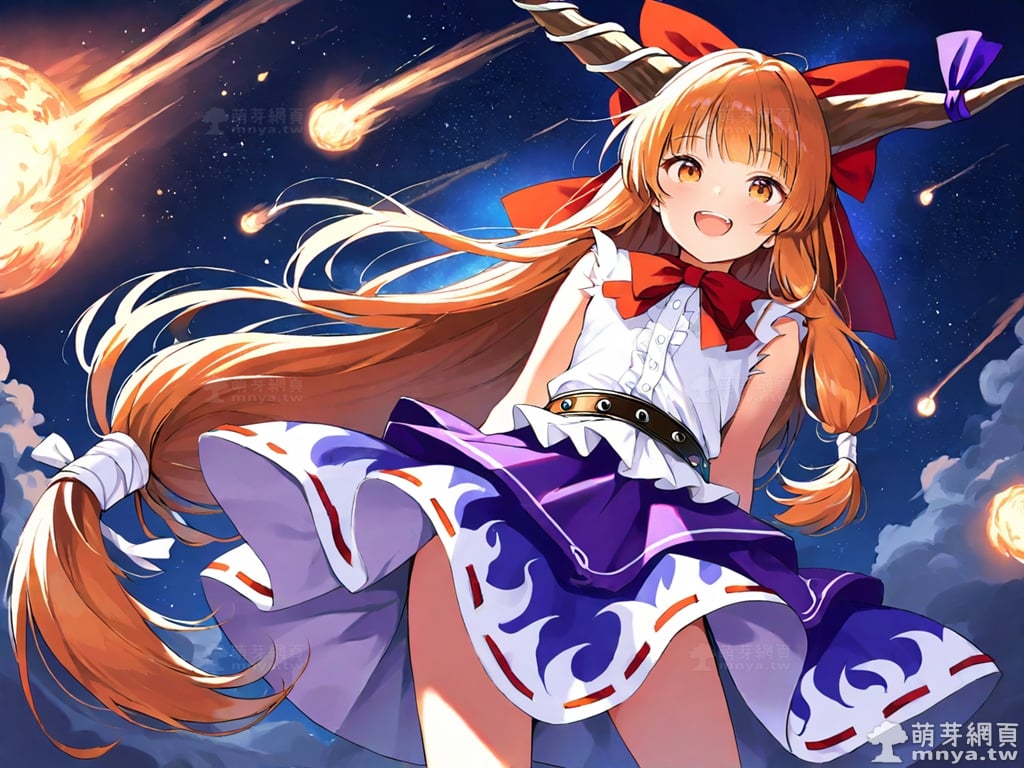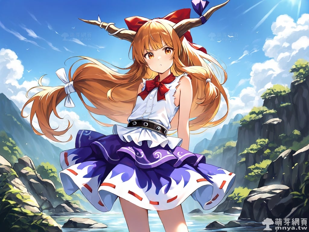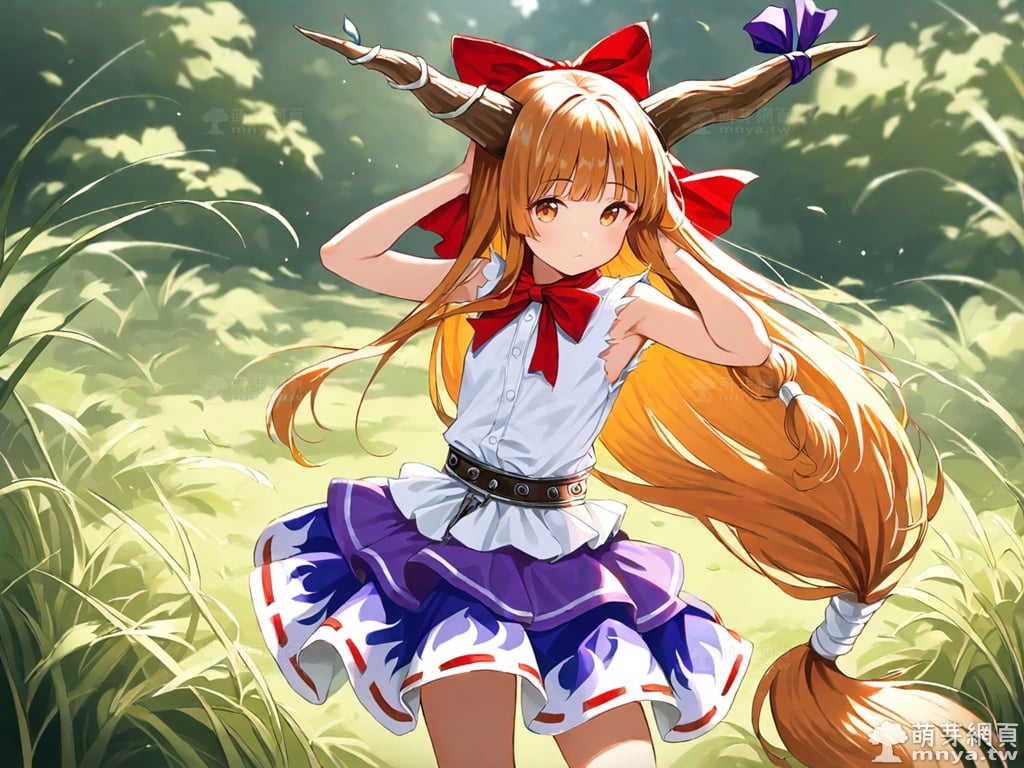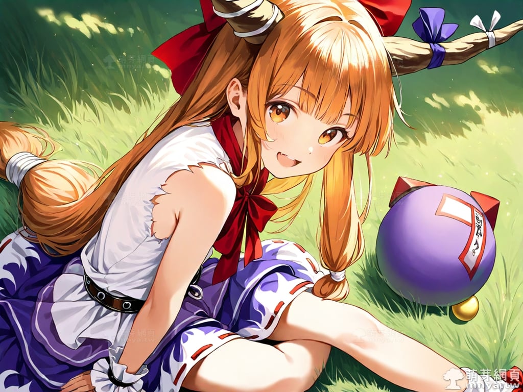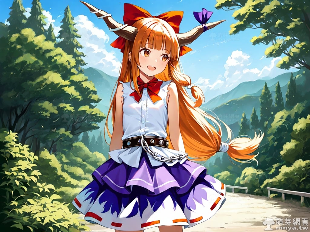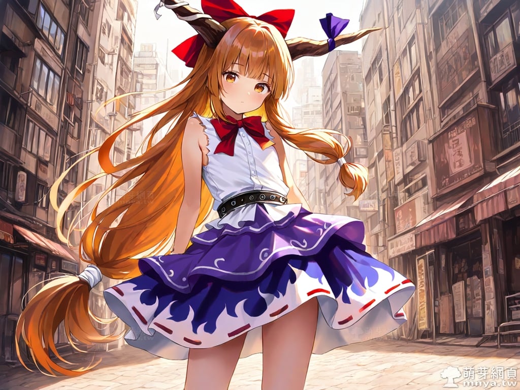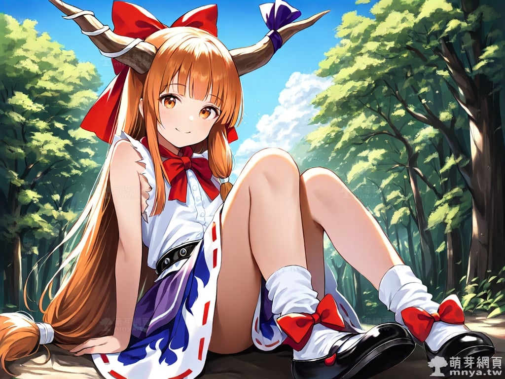 提詞文字:(masterpiece), (high quality), (high score), (great score), (year 2020), (kawaii), (loli), (photorealistic:0.1), 1girl, solo, (ibuki suika), touhou, __posture__, long hair, very long hair, low-tied long hair, orange hair, sidelocks, red bow, hair bow, bow, bangs, horns, horn ribbon, horn ornament, oni horns, orange eyes, skirt, shirt, purple skirt, white shirt, footwear bow, sleeveless, ribbon, sleeveless shirt, black footwear, shoes, ribbon-trimmed skirt, socks, red bowtie, bowtie, torn clothes, white socks, small breasts, breasts, cowboy shot, __looking__, __expression__, __background__.