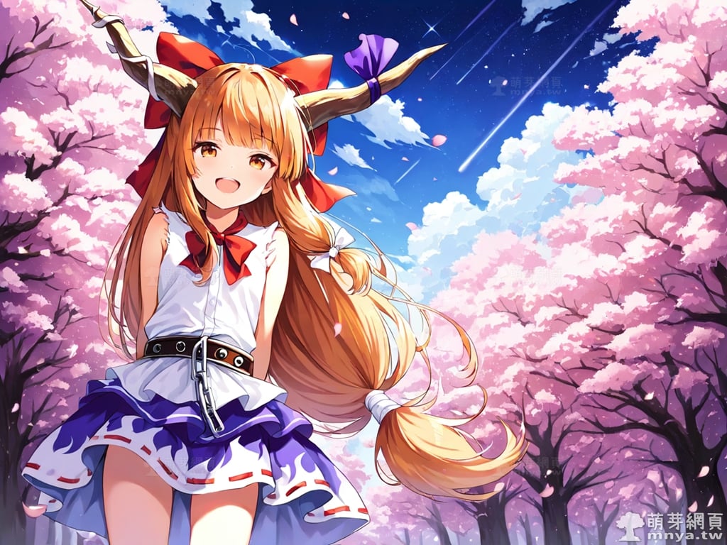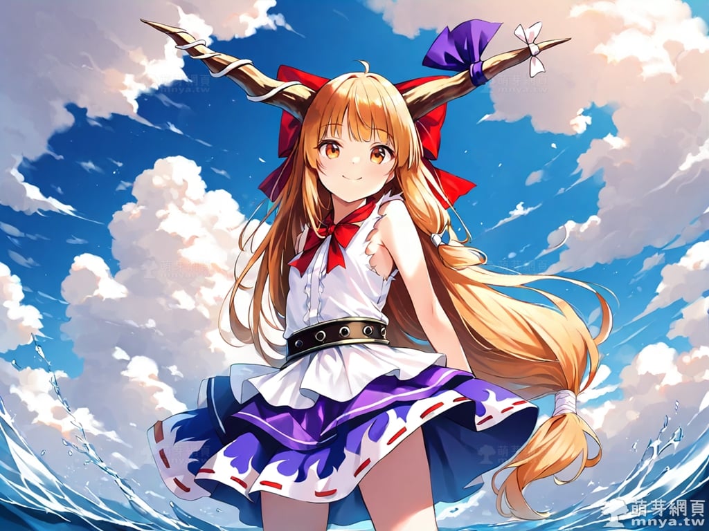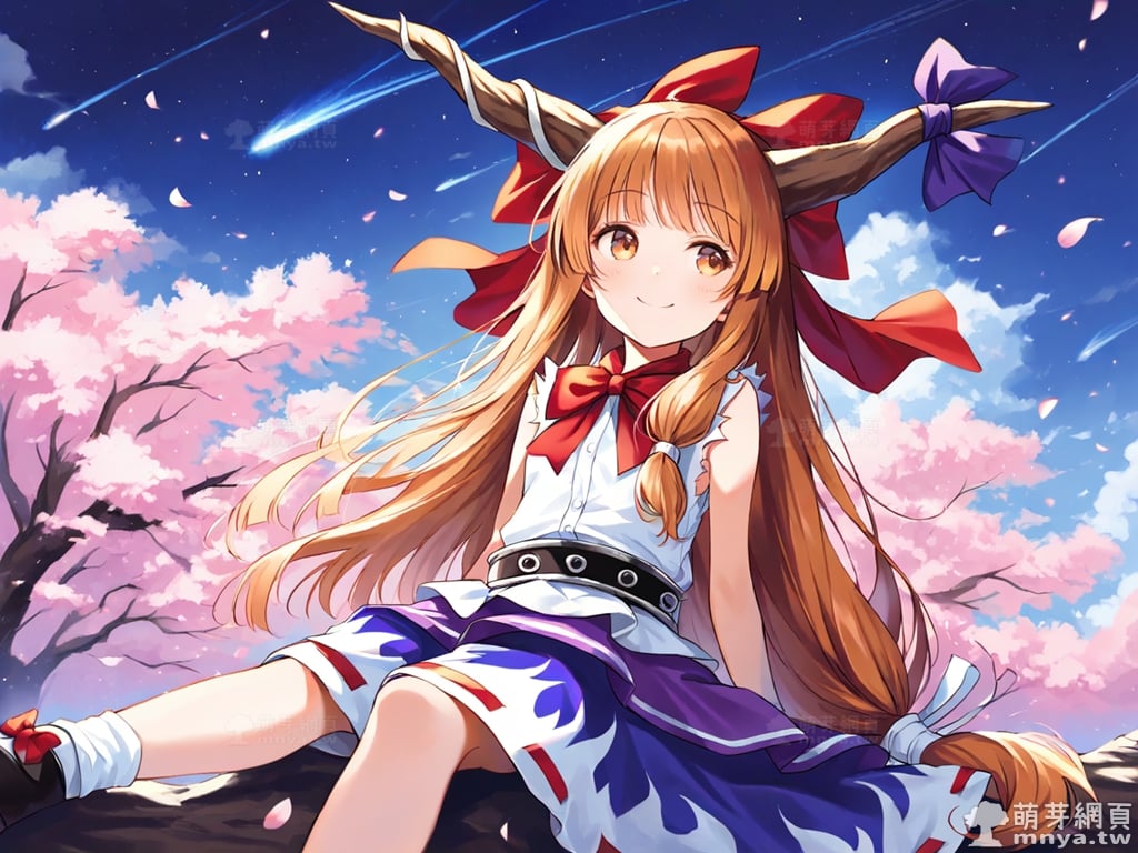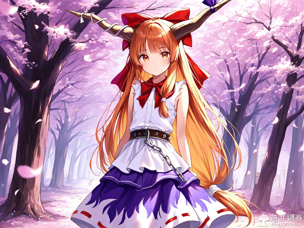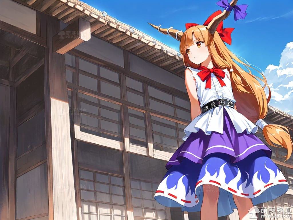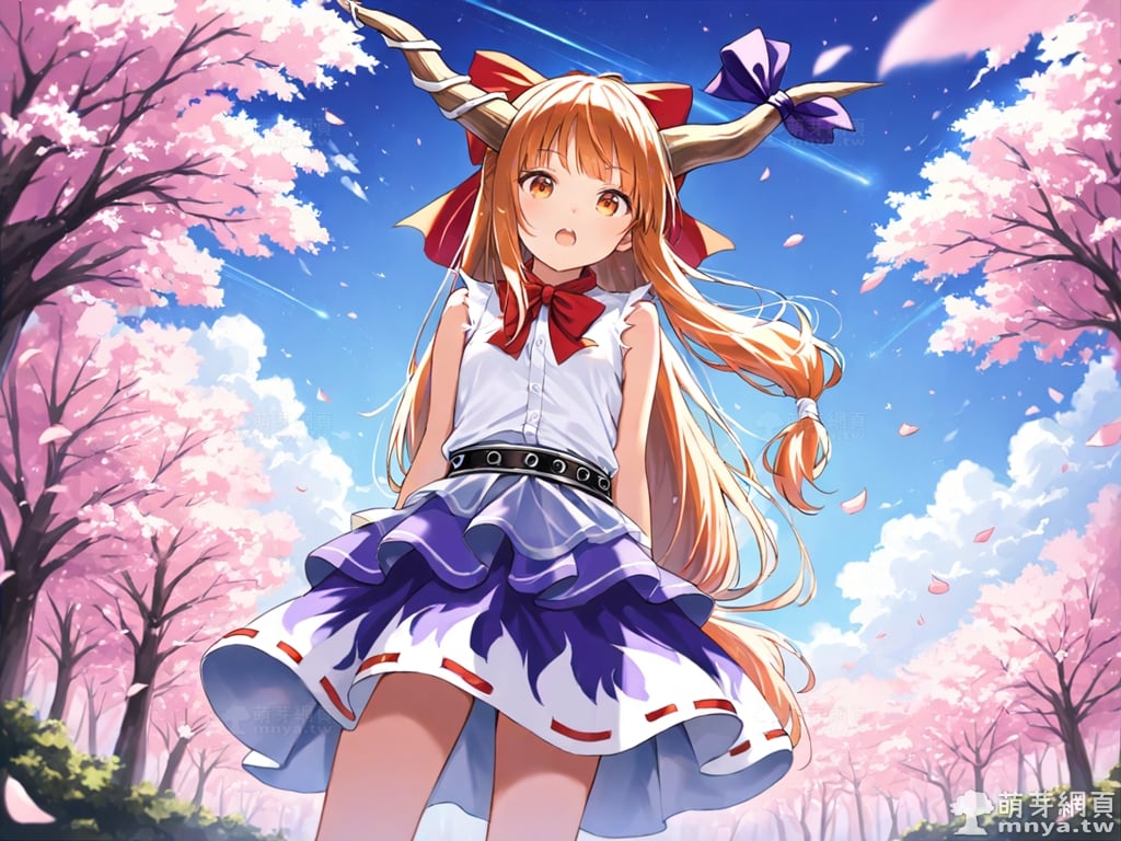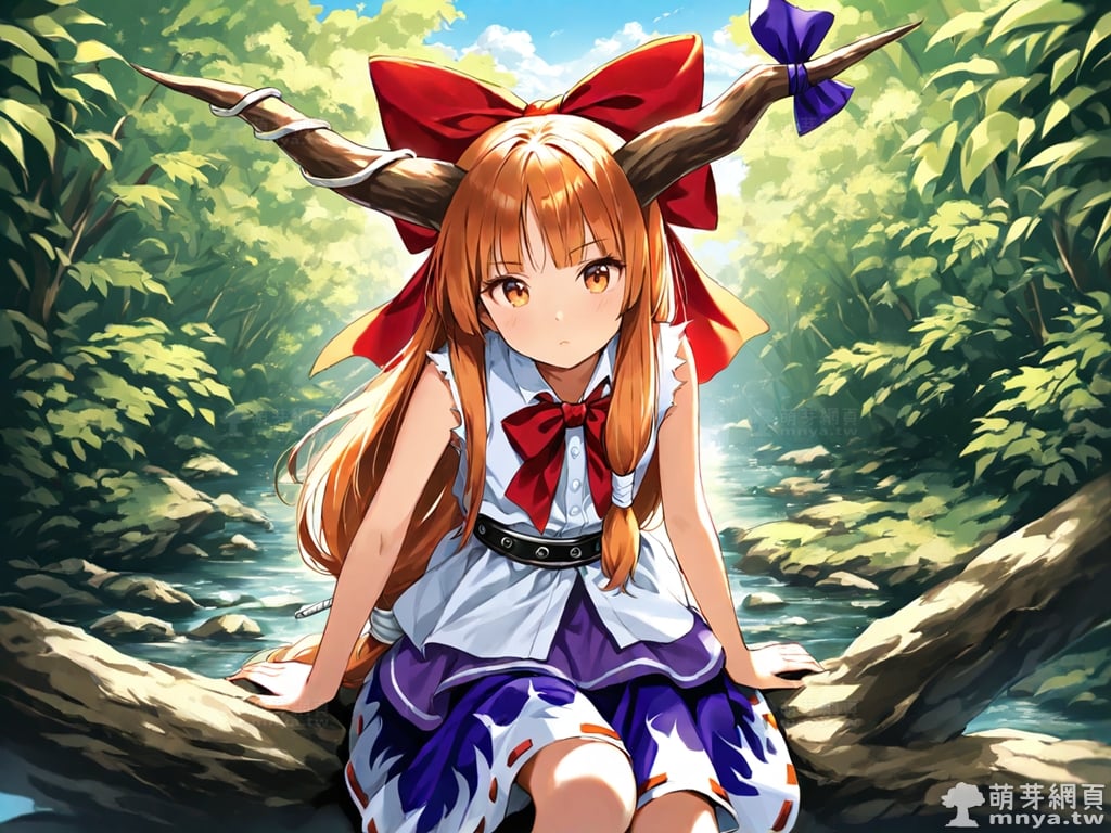 提詞文字:(masterpiece), (high quality), (high score), (great score), (year 2020), (kawaii), (loli), (photorealistic:0.1), 1girl, solo, (ibuki suika), touhou, __posture__, long hair, very long hair, low-tied long hair, orange hair, sidelocks, red bow, hair bow, bow, bangs, horns, horn ribbon, horn ornament, oni horns, orange eyes, skirt, shirt, purple skirt, white shirt, footwear bow, sleeveless, ribbon, sleeveless shirt, black footwear, shoes, ribbon-trimmed skirt, socks, red bowtie, bowtie, torn clothes, white socks, small breasts, breasts, cowboy shot, __looking__, __expression__, __background__.
