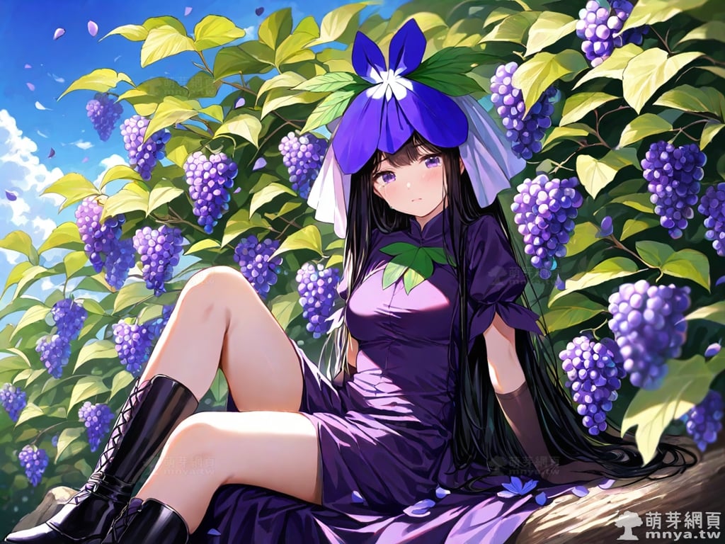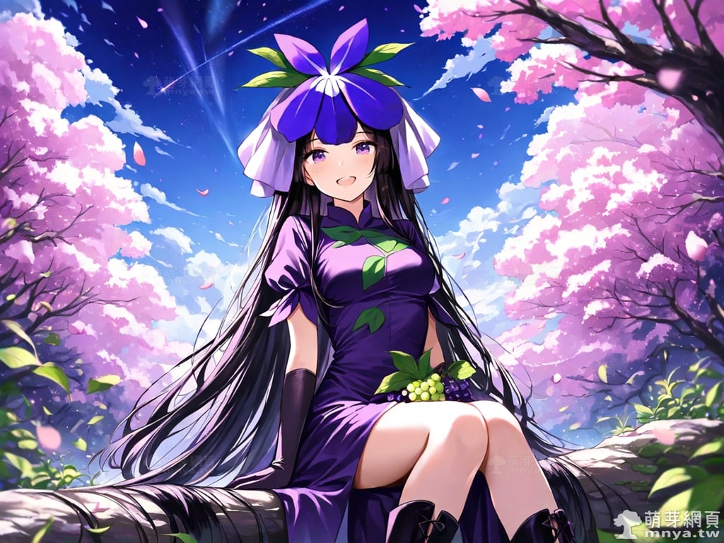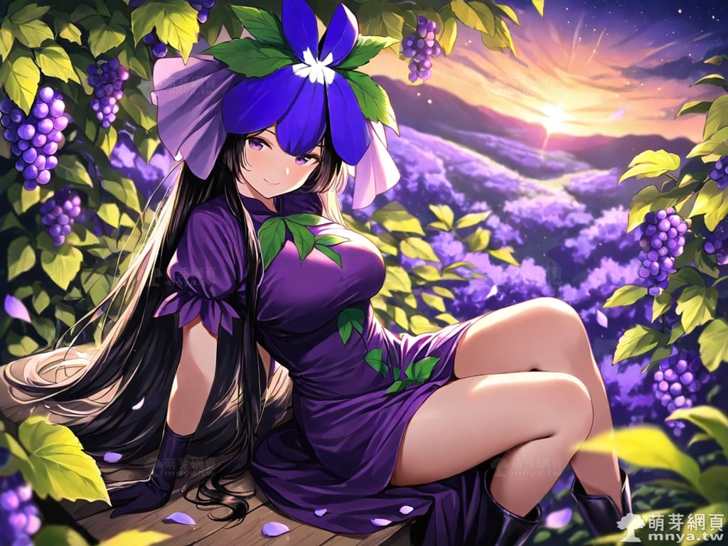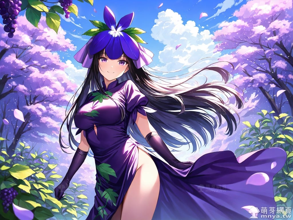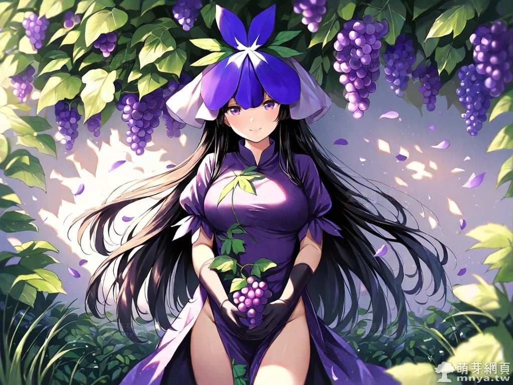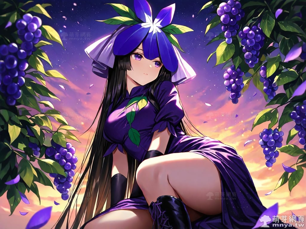 提詞文字:(masterpiece), (high quality), (high score), (great score), (year 2020), (kawaii), (loli), (photorealistic:0.1), 1girl, solo, (yomotsu hisami), touhou, __posture__, long hair, very long hair, black hair, purple eyes, elbow gloves, gloves, flower, fruit, grapes, leaf, petals, puffy short sleeves, puffy sleeves, purple petals, short sleeves, boots, large breasts, breasts, cowboy shot, __looking__, __expression__, __background__.