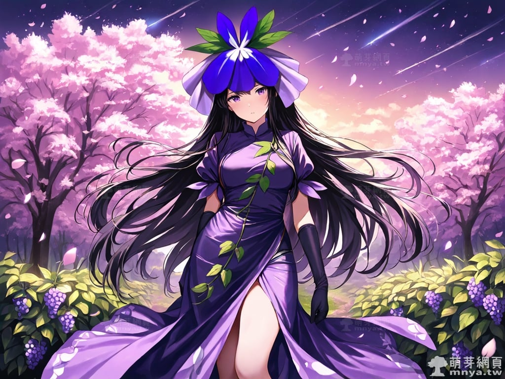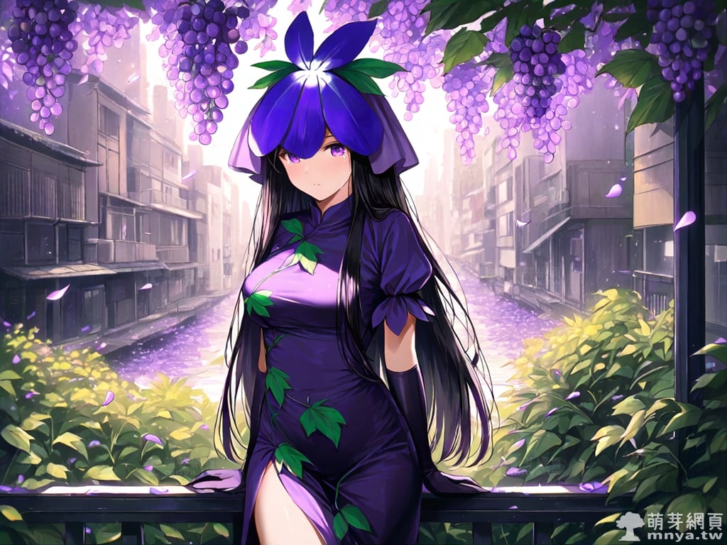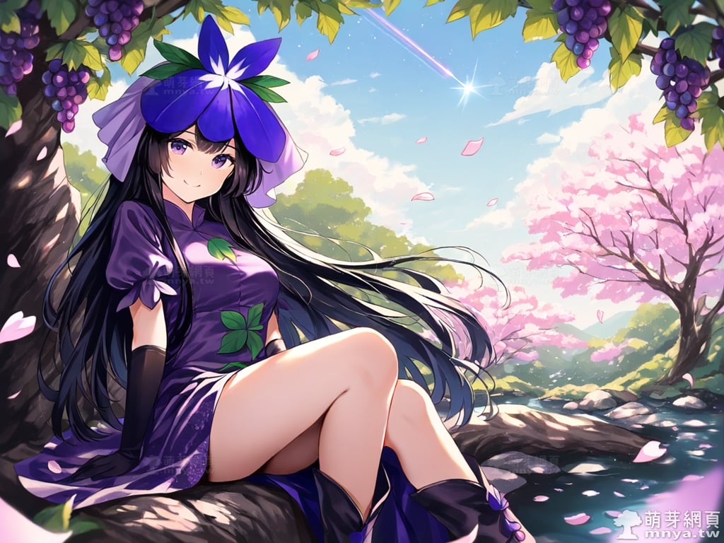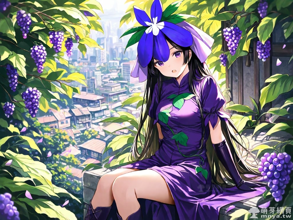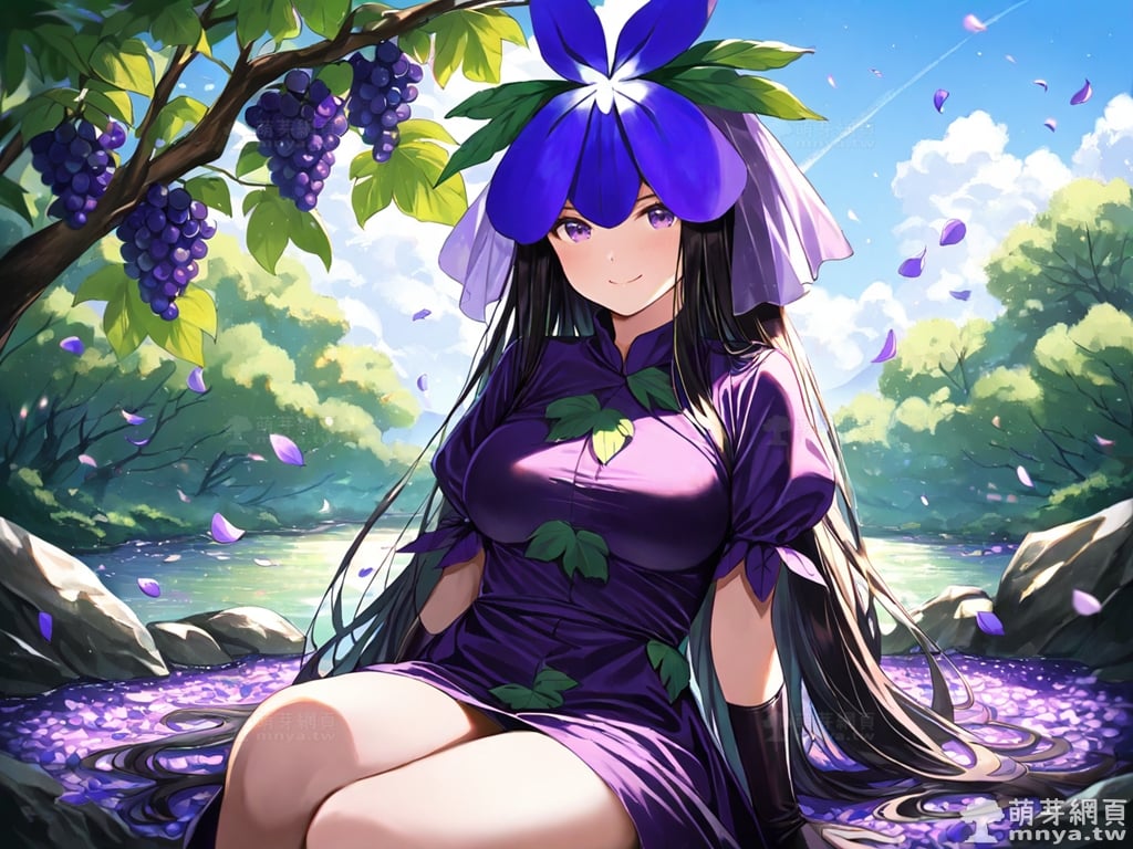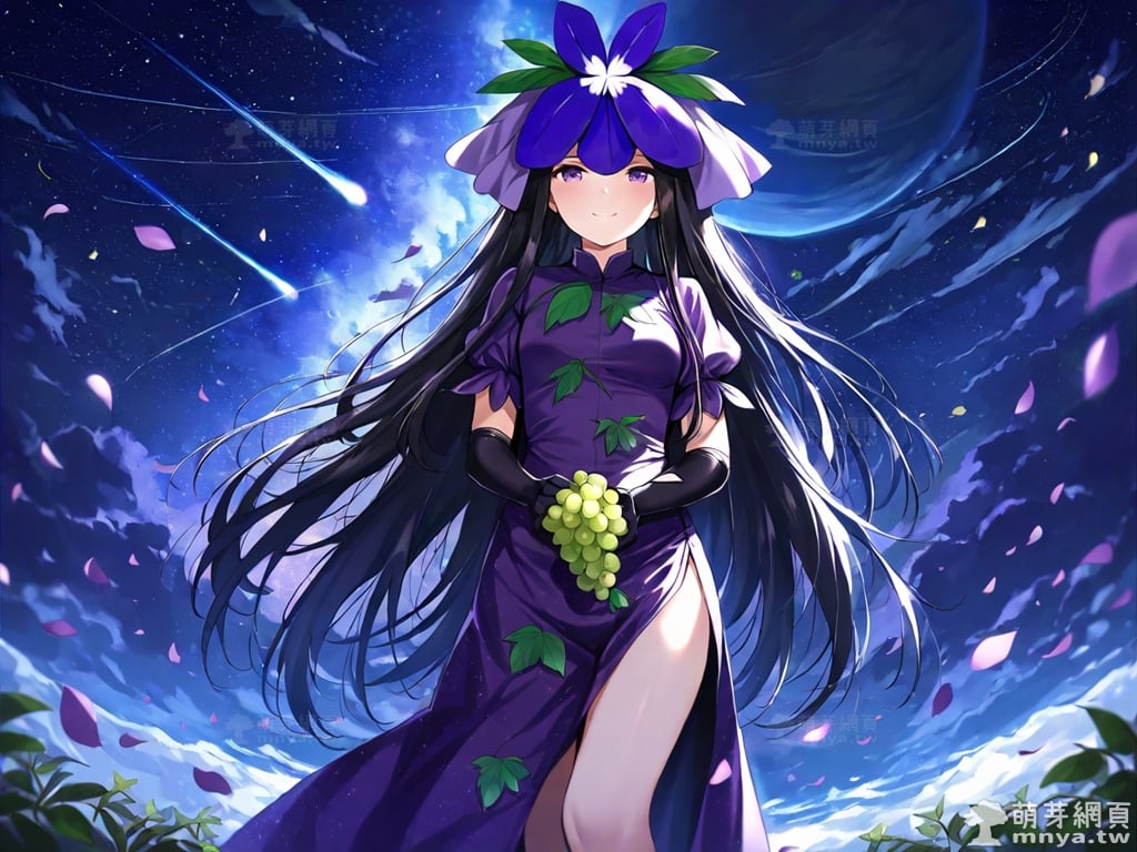 提詞文字:(masterpiece), (high quality), (high score), (great score), (year 2020), (kawaii), (loli), (photorealistic:0.1), 1girl, solo, (yomotsu hisami), touhou, __posture__, long hair, very long hair, black hair, purple eyes, elbow gloves, gloves, flower, fruit, grapes, leaf, petals, puffy short sleeves, puffy sleeves, purple petals, short sleeves, boots, large breasts, breasts, cowboy shot, __looking__, __expression__, __background__.