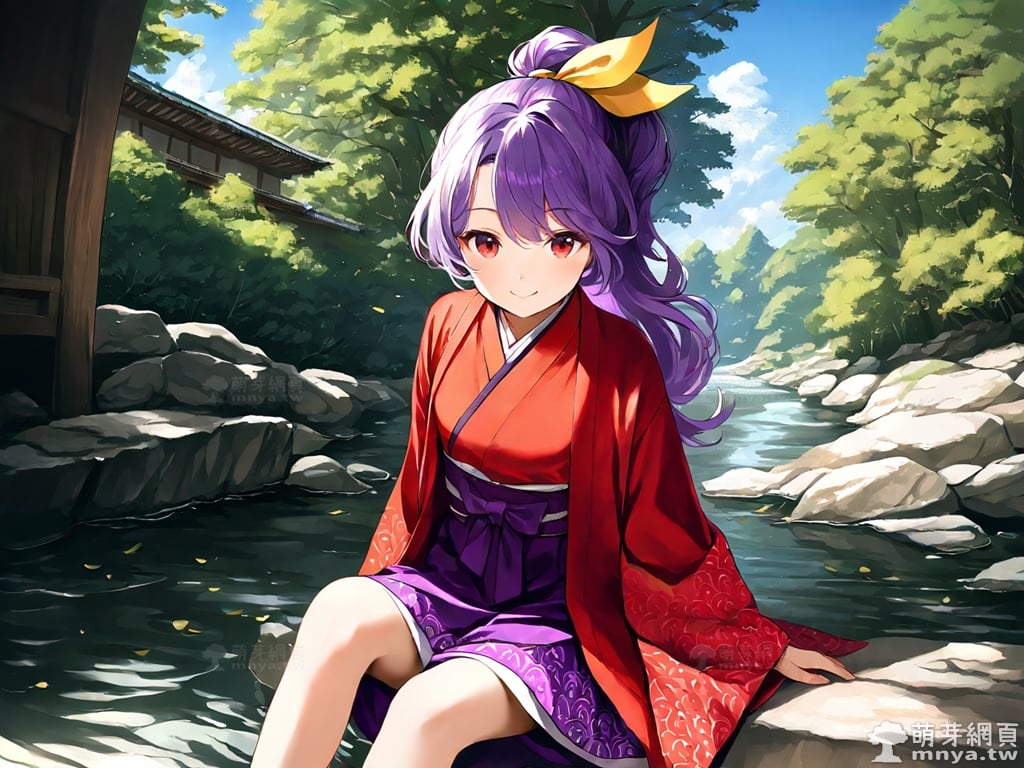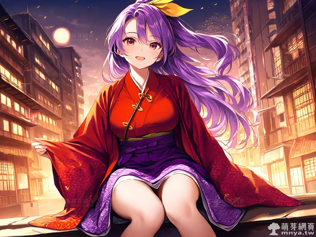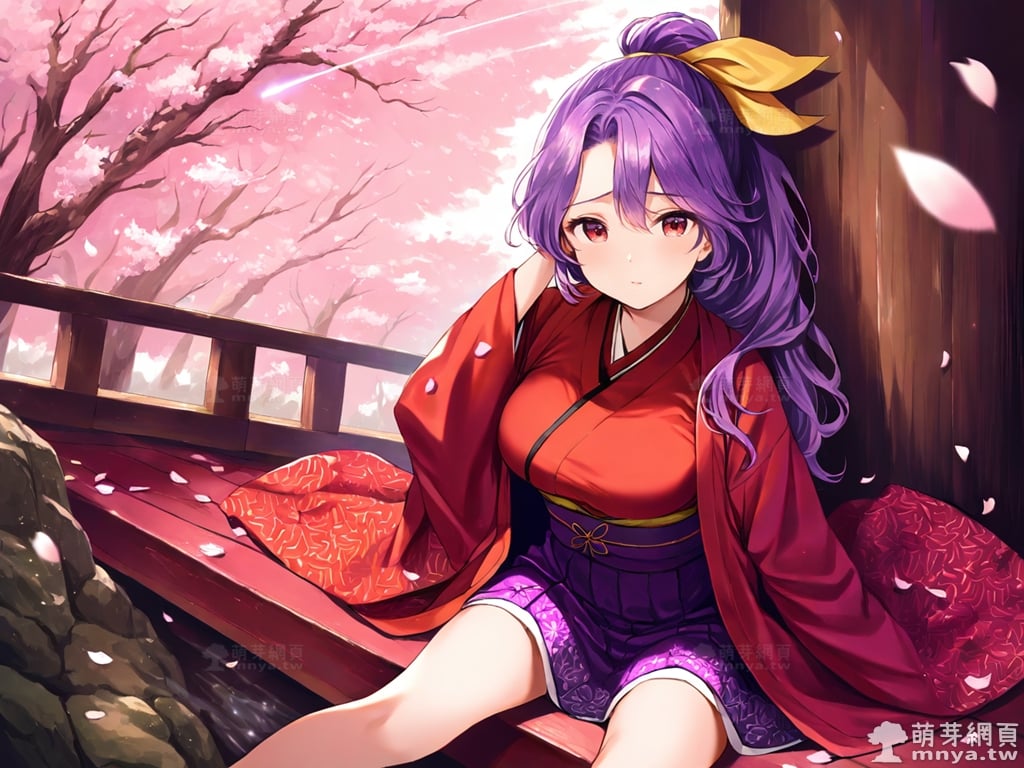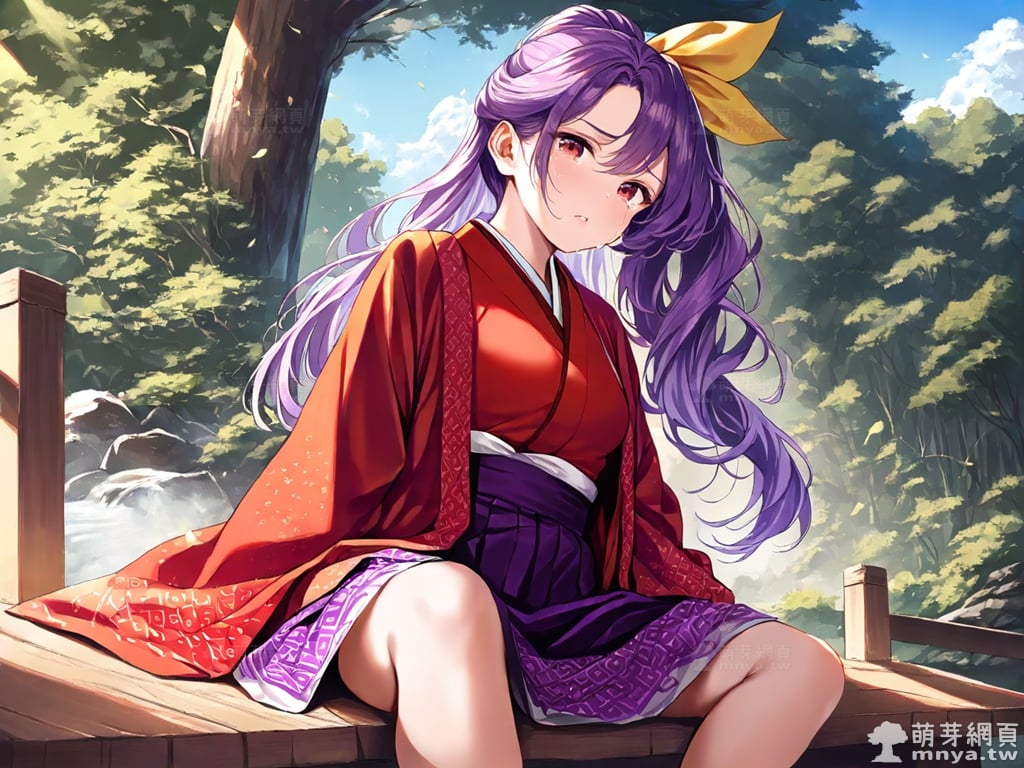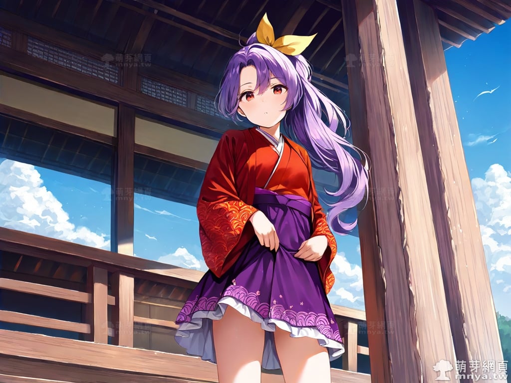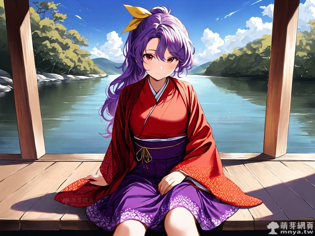 提詞文字:(masterpiece), (high quality), (high score), (great score), (year 2020), (kawaii), (loli), (photorealistic:0.1), 1girl, solo, (sannyo komakusa), (komakusa sannyo), touhou, __posture__, long hair, purple hair, intake, ponytail, yellow ribbon, hair ribbon, ribbon, hair between eyes, red eyes, haori, japanese clothes, kimono, legs apart, long sleeves, purple skirt, red kimono, skirt, wide sleeves, geta, large breasts, breasts, cowboy shot, __looking__, __expression__, __background__.
