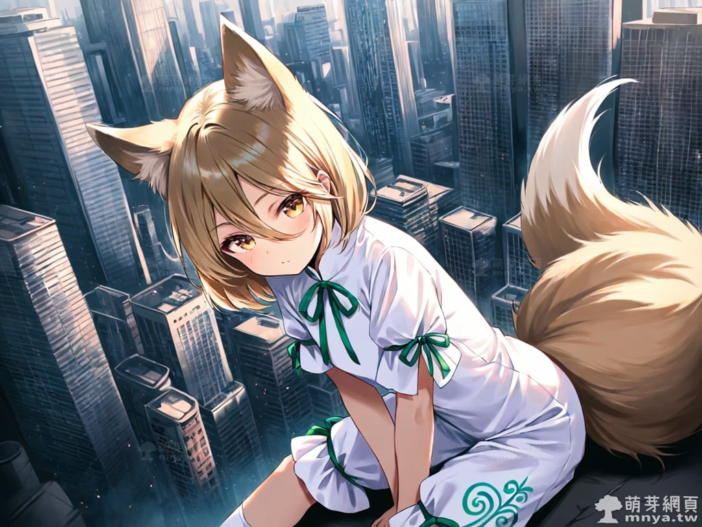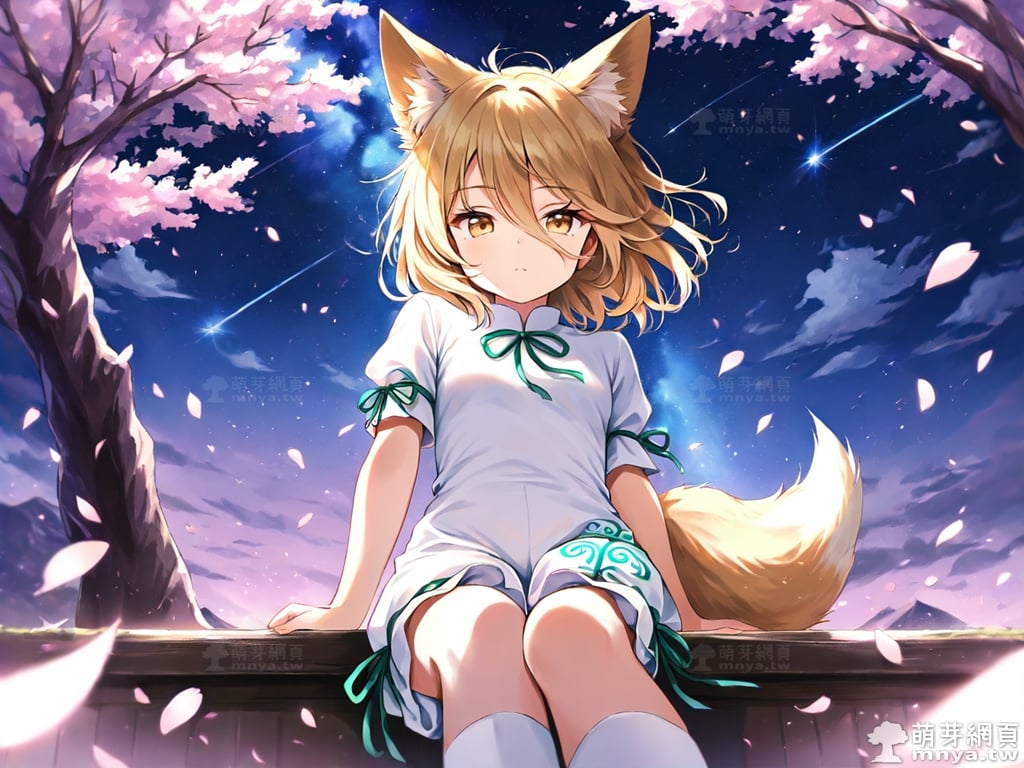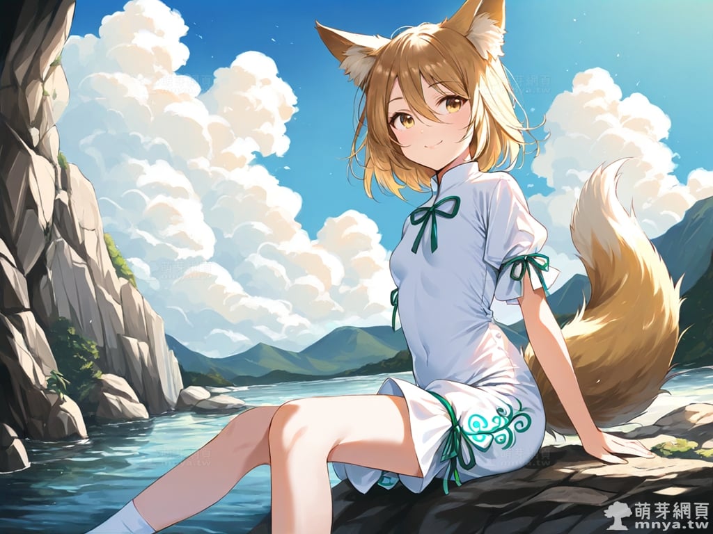 提詞文字:(masterpiece), (high quality), (high score), (great score), (year 2020), (kawaii), (loli), (photorealistic:0.1), 1girl, solo, (kudamaki tsukasa), touhou, __posture__, short hair, blonde hair, hair between eyes, yellow eyes, animal ears, fox ears, fox girl, green ribbon, ribbon, romper, short sleeves, white romper, white socks, socks, fox tail, medium breasts, breasts, cowboy shot, __looking__, __expression__, __background__.