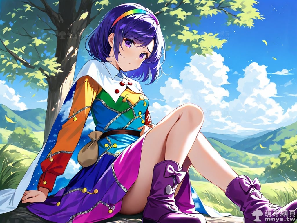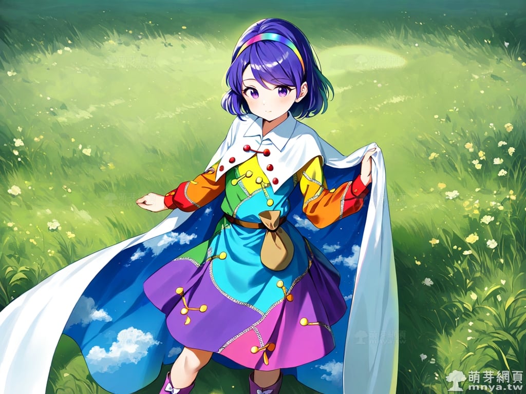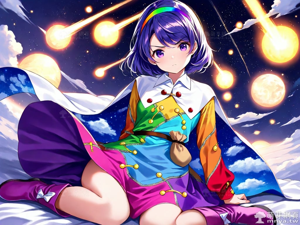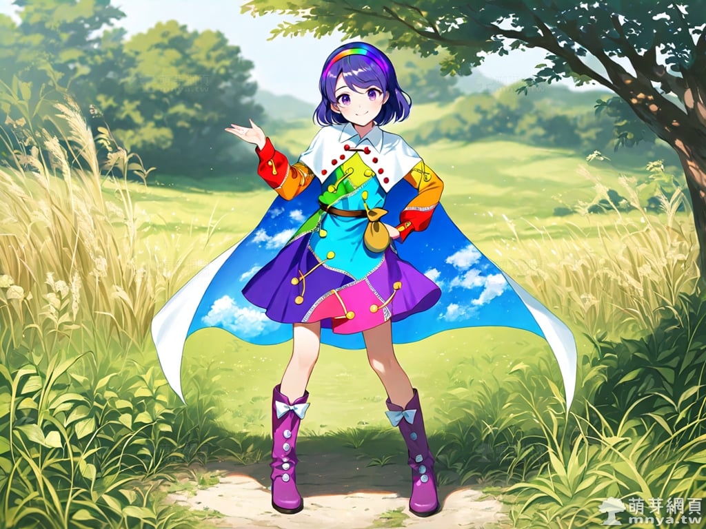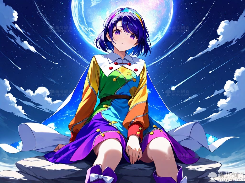 提詞文字:(masterpiece), (high quality), (high score), (great score), (year 2020), (kawaii), (loli), (photorealistic:0.1), 1girl, solo, (tenkyuu chimata), touhou, __posture__, short hair, purple hair, swept bangs, purple eyes, belt, belt pouch, boots, brown belt, cape, circle, collared cape, dress, footwear bow, full body, hairband, long sleeves, multicolored dress, multicolored hairband, patchwork clothes, pouch, puffy long sleeves, puffy sleeves, purple boots, rainbow hairband, sky print, two-sided cape, two-sided fabric, zipper pull tab, medium breasts, breasts, cowboy shot, __looking__, __expression__, __background__.