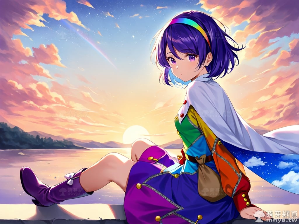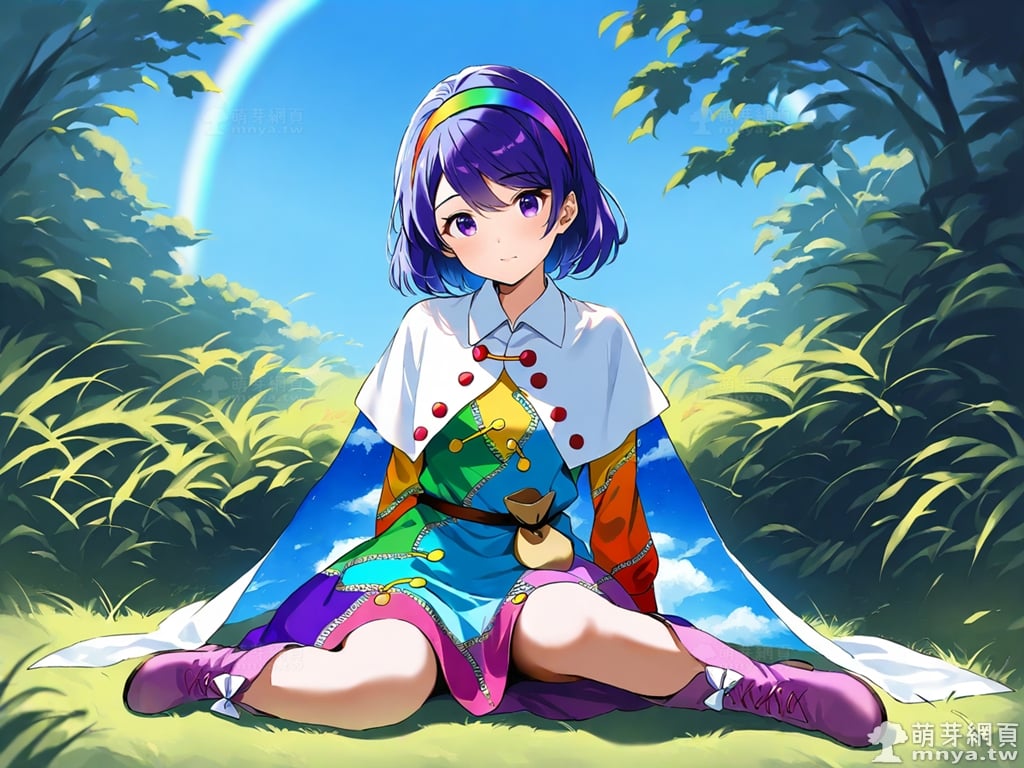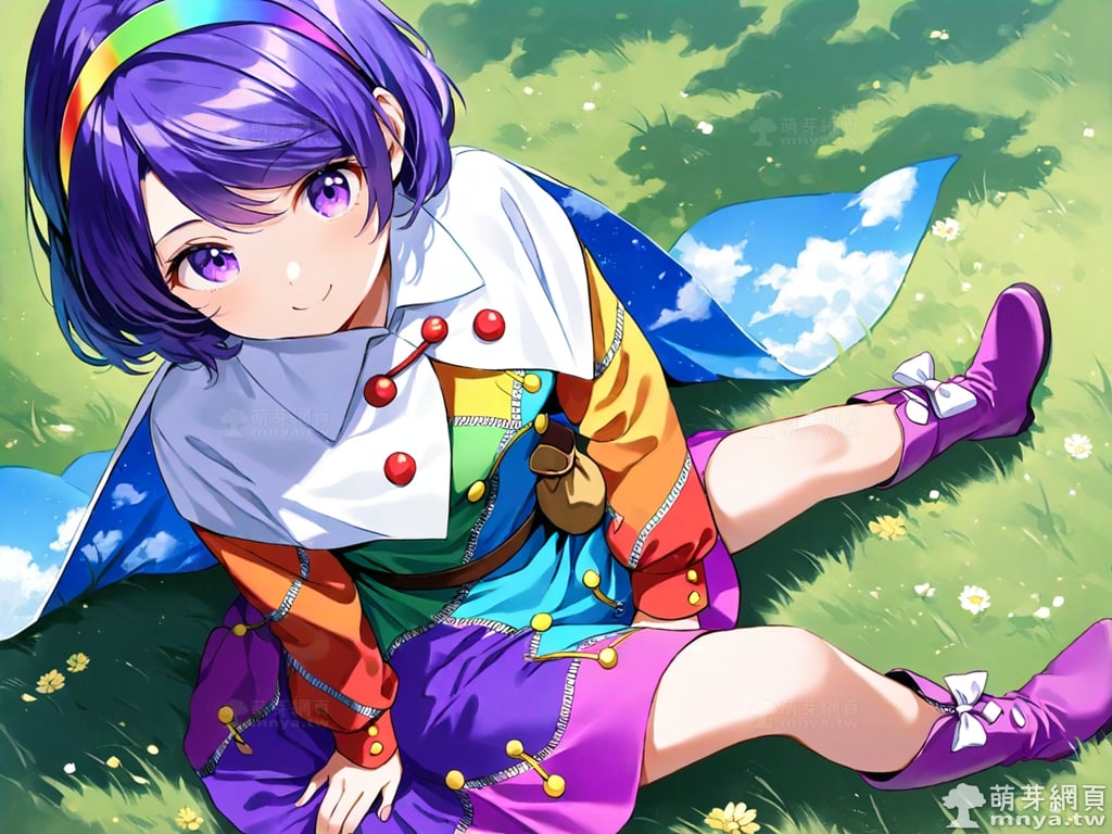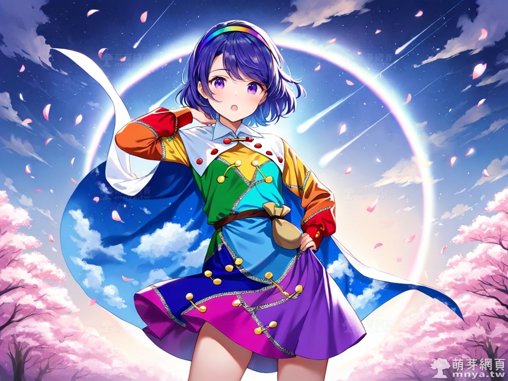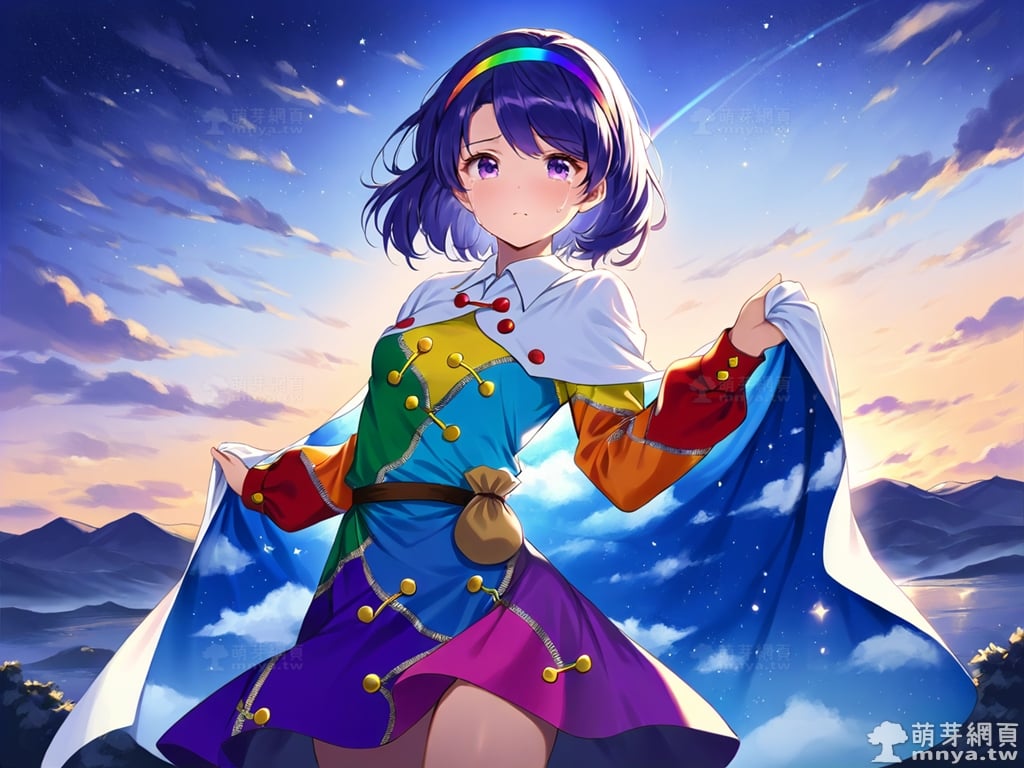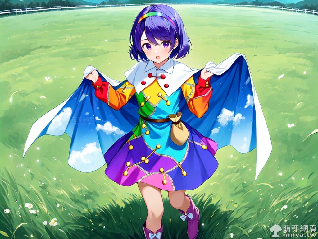 提詞文字:(masterpiece), (high quality), (high score), (great score), (year 2020), (kawaii), (loli), (photorealistic:0.1), 1girl, solo, (tenkyuu chimata), touhou, __posture__, short hair, purple hair, swept bangs, purple eyes, belt, belt pouch, boots, brown belt, cape, circle, collared cape, dress, footwear bow, full body, hairband, long sleeves, multicolored dress, multicolored hairband, patchwork clothes, pouch, puffy long sleeves, puffy sleeves, purple boots, rainbow hairband, sky print, two-sided cape, two-sided fabric, zipper pull tab, medium breasts, breasts, cowboy shot, __looking__, __expression__, __background__.