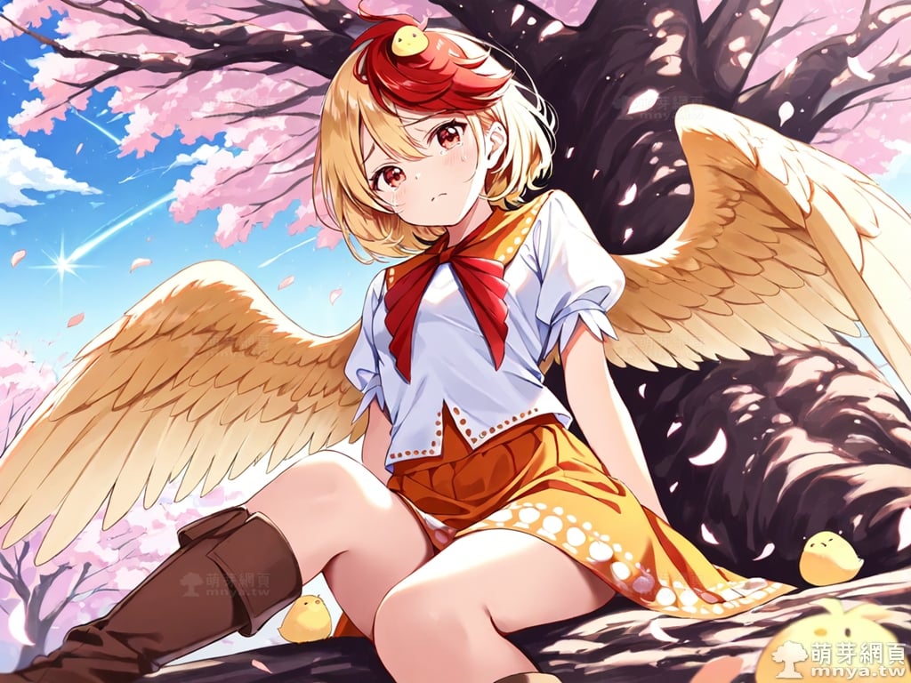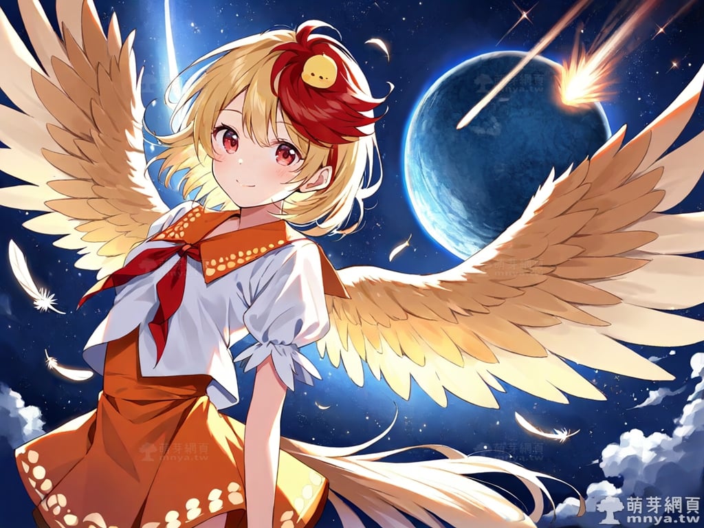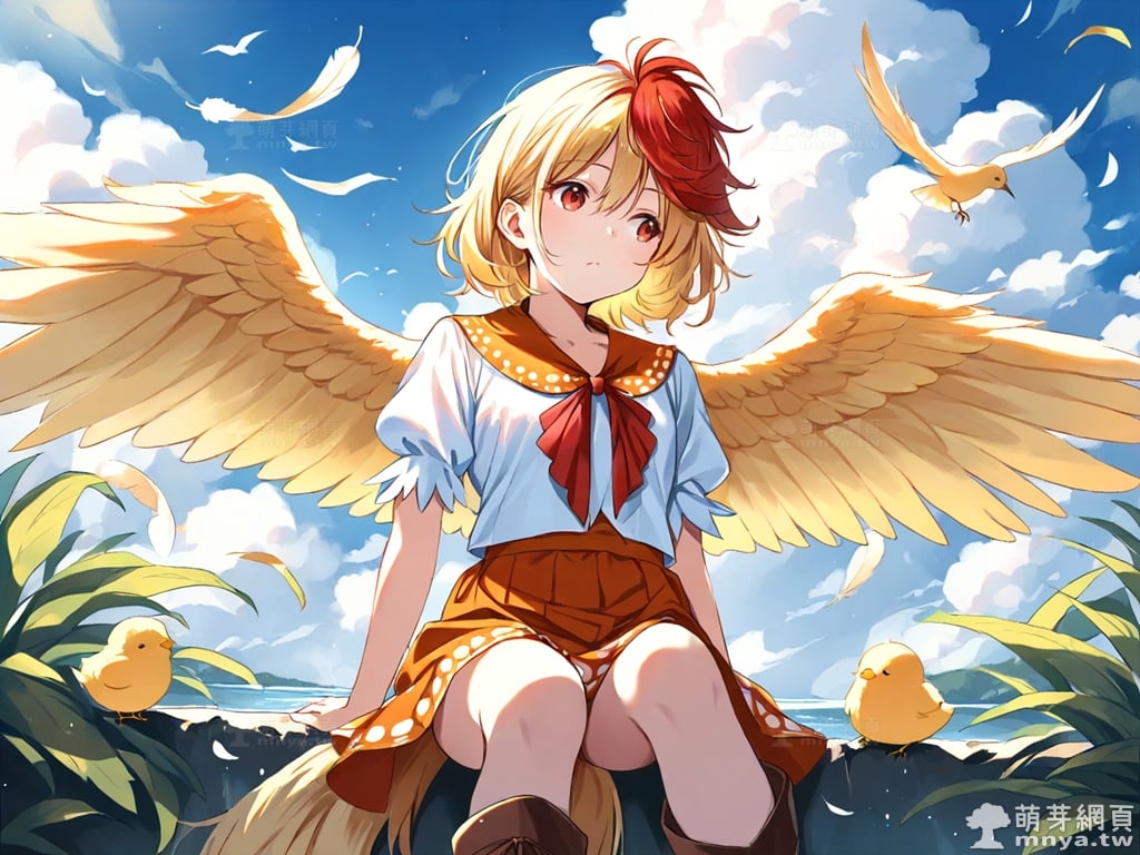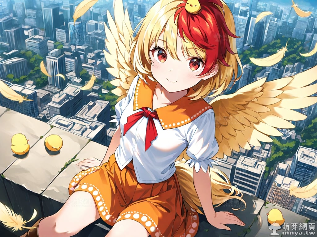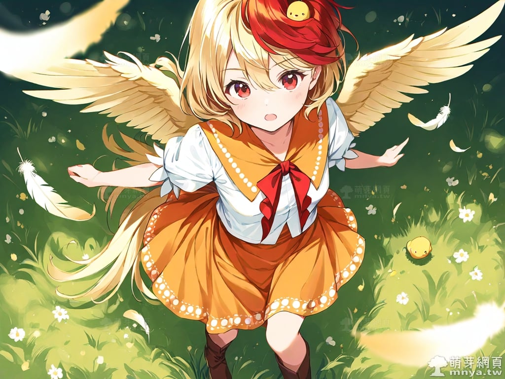 提詞文字:(masterpiece), (high quality), (high score), (great score), (year 2020), (kawaii), (loli), (photorealistic:0.1), 1girl, solo, (niwatari kutaka), touhou, __posture__, short hair, blonde hair, red hair, multicolored hair, two-tone hair, bangs, hair between eyes, red eyes, neckerchief, red neckerchief, wings, short sleeves, shirt, boots, brown footwear, white shirt, bird, on head, chick, puffy sleeves, animal on head, feathered wings, puffy short sleeves, orange skirt, skirt, yellow wings, bird wings, dress, feathers, sailor collar, bird tail, tail feathers, medium breasts, breasts, cowboy shot, __looking__, __expression__, __background__.