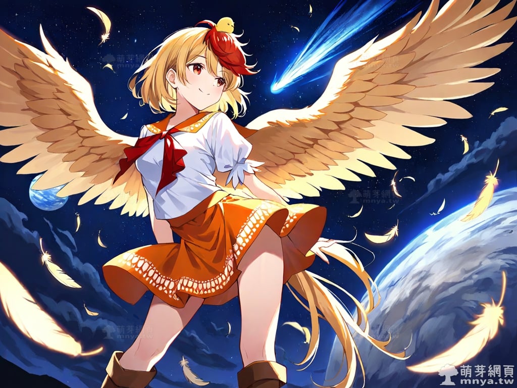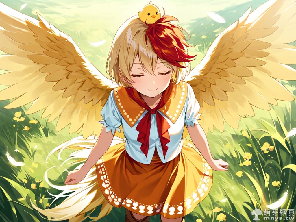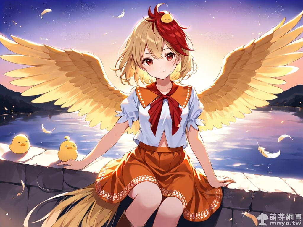 東方Project角色 AI 圖畫第九十五彈,此次的目標是「東方鬼形獸~ Wily Beast and Weakest Creature.」初次登場的「庭渡久侘歌」(庭渡 久侘歌,Niwatari Kutaka),神明,原為被人類家畜化之前的野生雞的神明——二羽渡神,居住在妖怪之山瀑布上方。她負責在地獄與鬼之國等與異界的口岸進行鬼與人類的分流,將他們分配到各自的地方,並且最近在考慮提高被家畜化的雞的地位。這位神明擁有治癒喉嚨疾病程度的能力,外型上具有顯著的特徵。她擁有一頭獨特的雙色短髮,主要為米黃色,而頭頂部分則呈現出類似雞冠的紅色髮絲,配上鮮明的紅瞳。背部生有豐滿的翅膀與尾羽,身著連衣裙搭配領結與靴子,整體形象充滿了女神的風采。此外,她被描述為有些健忘,主要活動範圍在妖怪之山與彼岸之間。使用 SDXL 模型直接生成,效果很不錯。總共產生 100 張,挑掉不合理跟瑕疵較多的有 10 張如下提供大家參考。