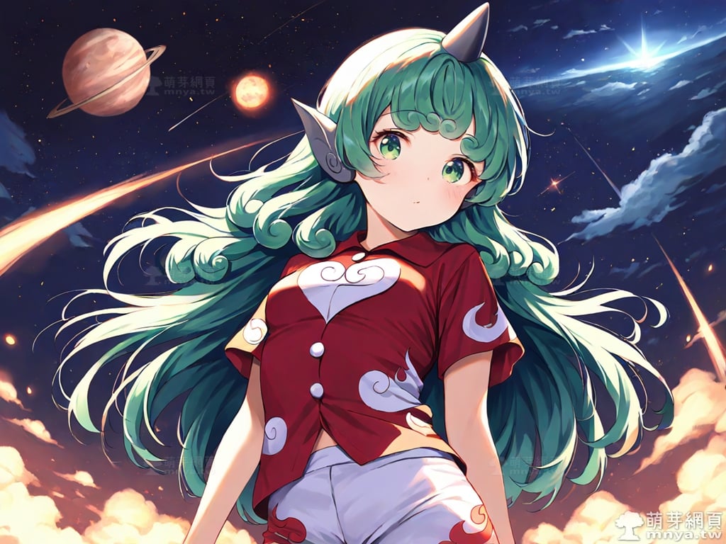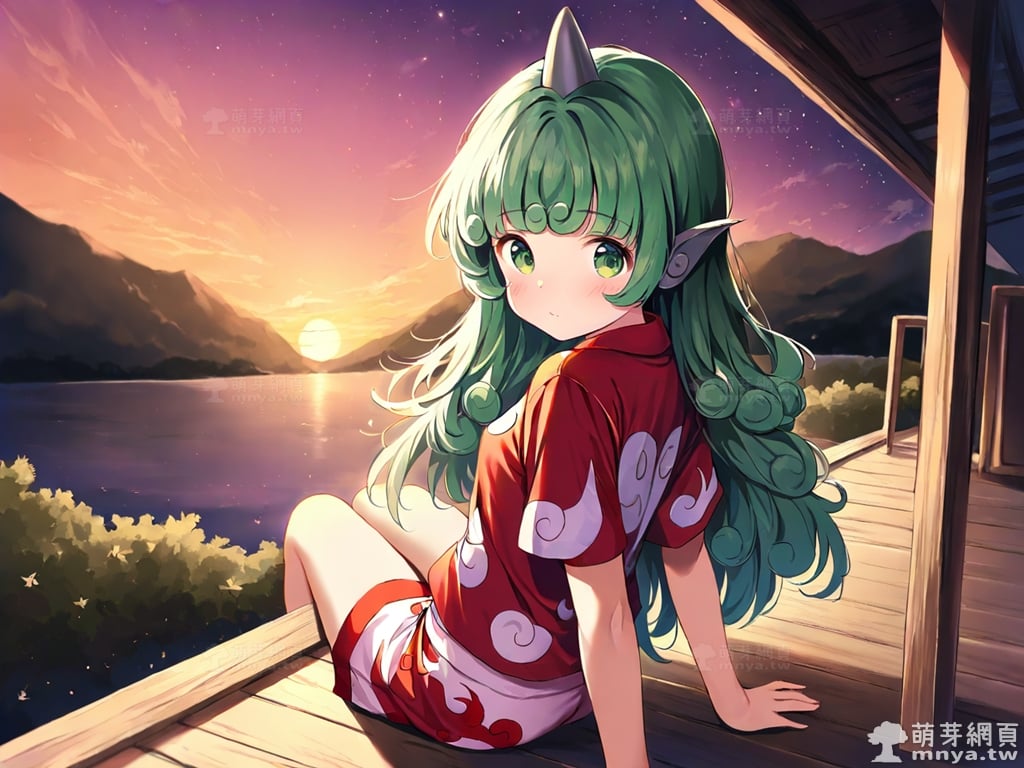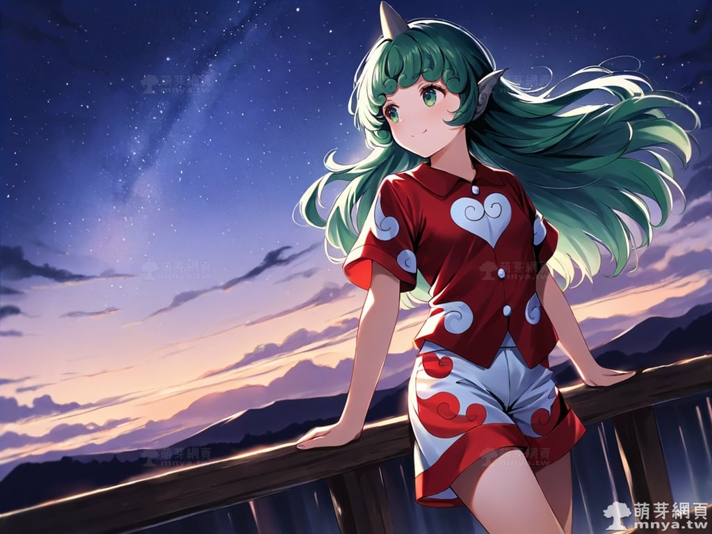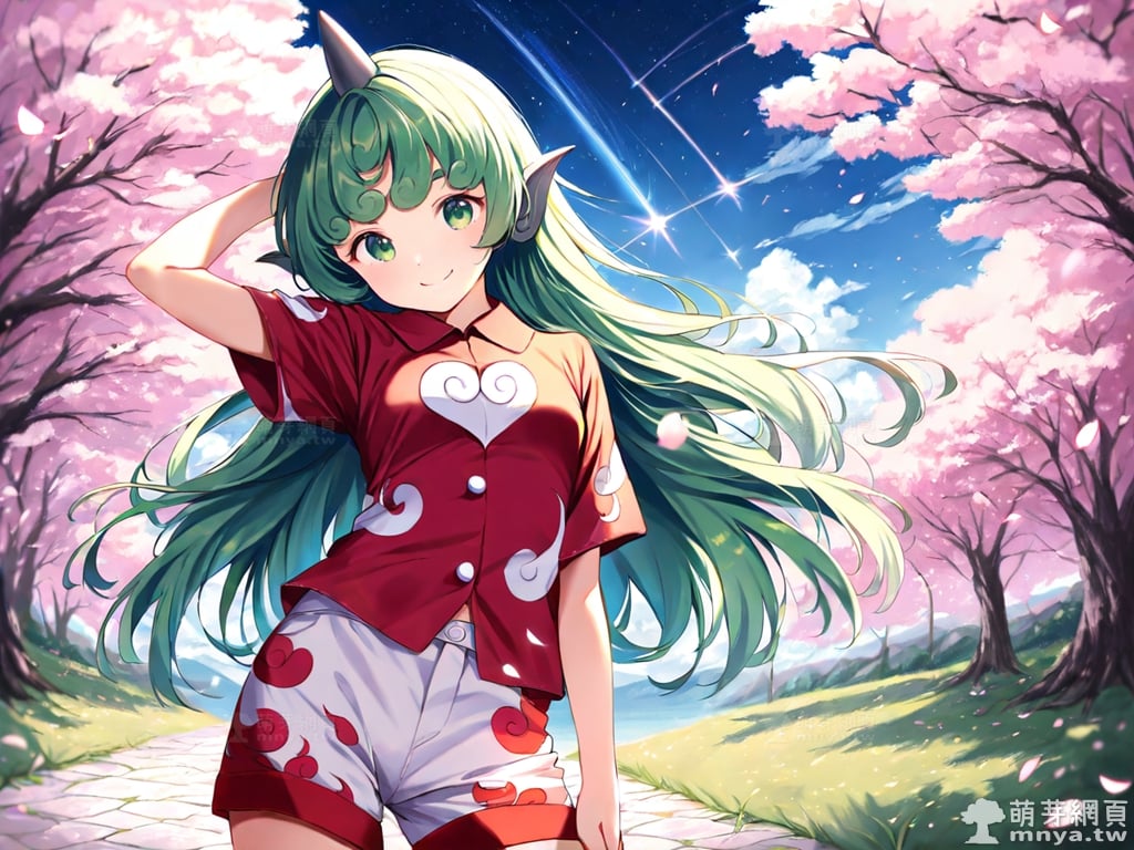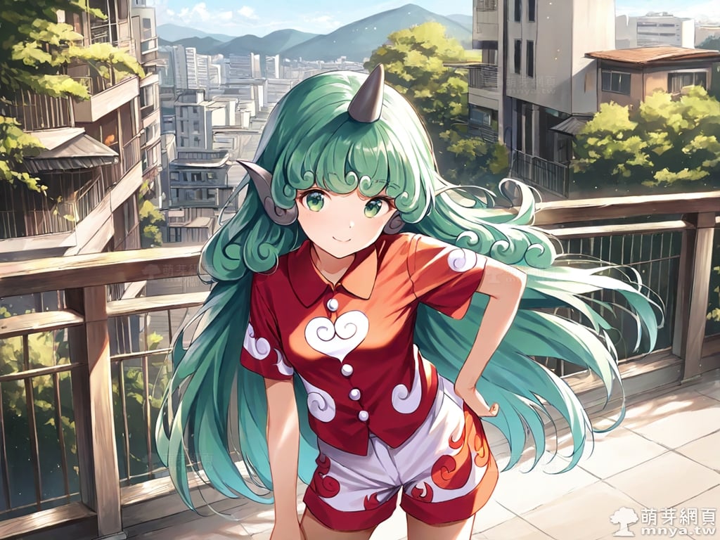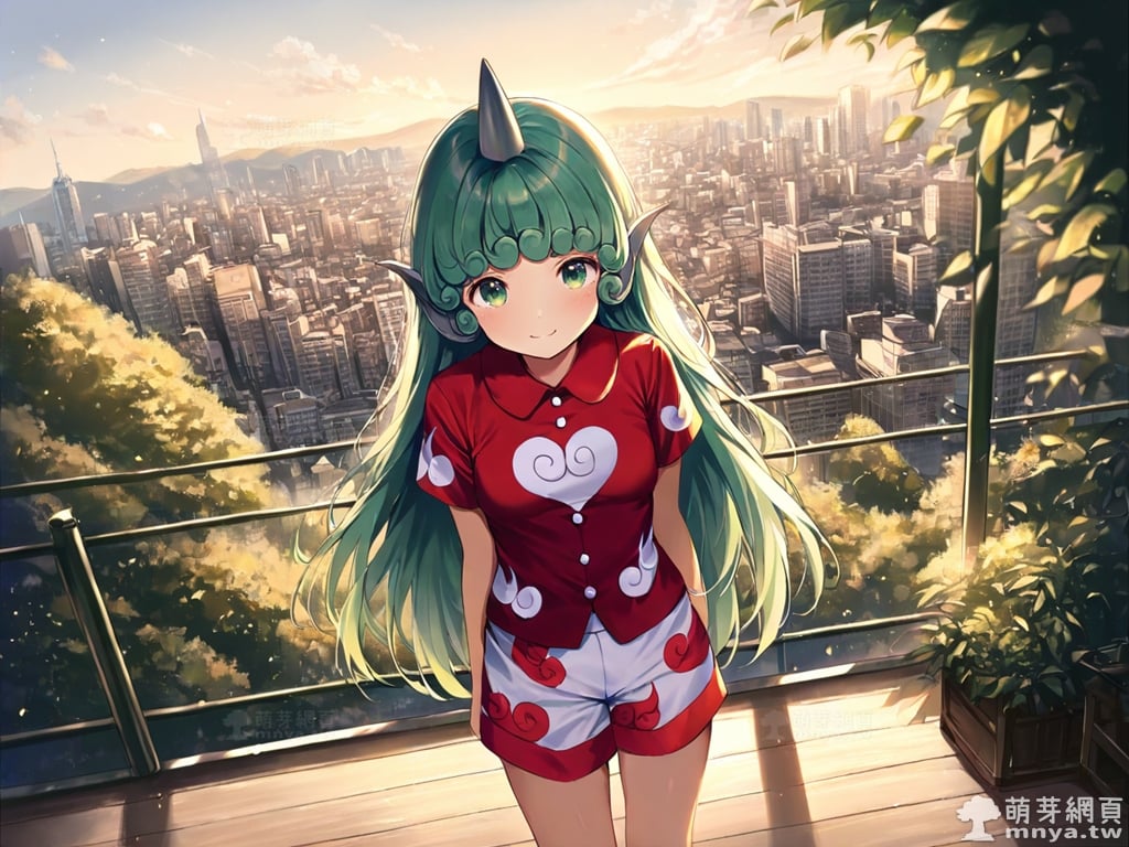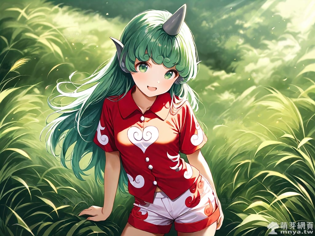 提詞文字:(masterpiece), (high quality), (high score), (great score), (year 2020), (kawaii), (loli), (photorealistic:0.1), 1girl, solo, (komano aunn), touhou, __posture__, long hair, green hair, green eyes, animal ears, buttons, single horn, horns, kariyushi shirt, komainu ears, red shirt, sandals, shirt, short sleeves, shorts, medium breasts, breasts, cowboy shot, __looking__, __expression__, __background__.