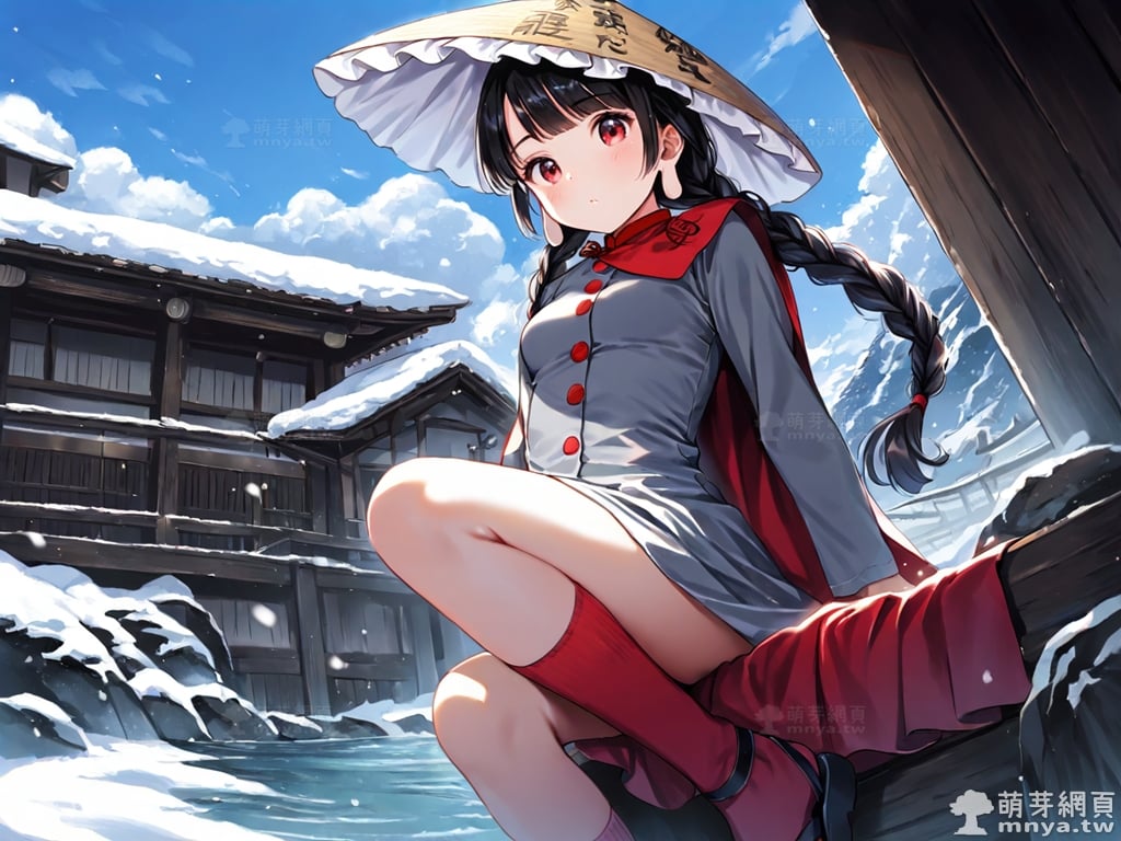 提詞文字:(masterpiece), (high quality), (high score), (great score), (year 2020), (kawaii), (loli), (photorealistic:0.1), 1girl, solo, (yatadera narumi), touhou, __posture__, long hair, black hair, braid, twin braids, hat, ajirogasa, red eyes, buttons, cape, coat, grey coat, long earlobes, red cape, red socks, sandals, snow, socks, medium breasts, breasts, cowboy shot, __looking__, __expression__, __background__.