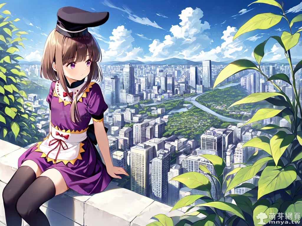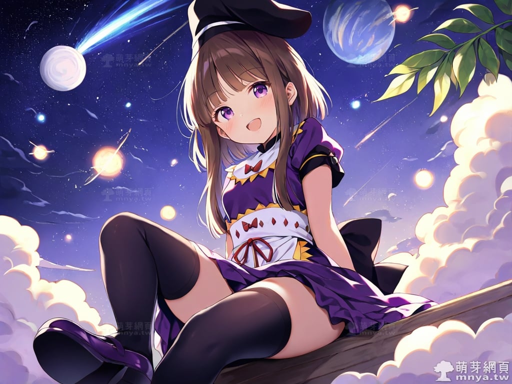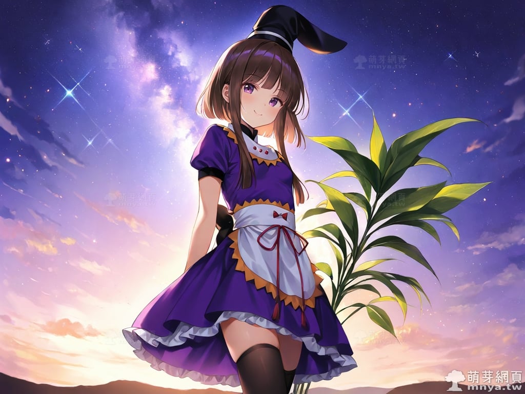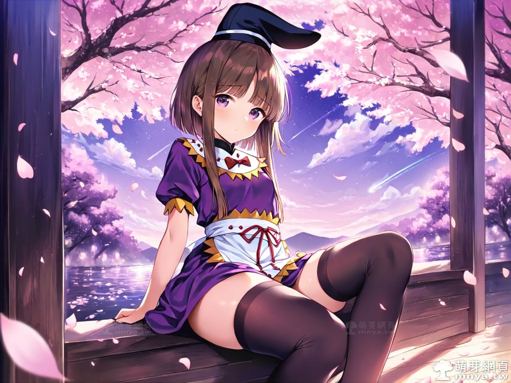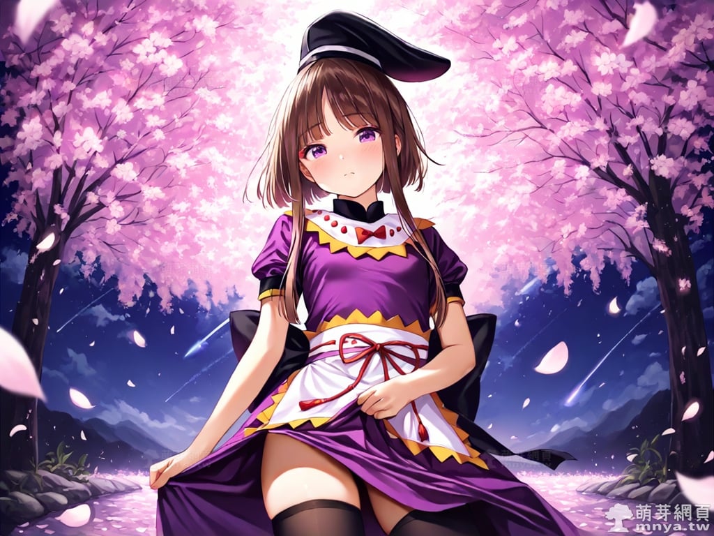 提詞文字:(masterpiece), (high quality), (high score), (great score), (year 2020), (kawaii), (loli), (photorealistic:0.1), 1girl, solo, (nishida satono), touhou, __posture__, short hair, short hair with long locks, brown hair, purple eyes, black hat, black thighhighs, dress, hat, mary janes, myouga (plant), purple dress, purple shoes, shoes, short sleeves, waist apron, tate eboshi, thighhighs, small breasts, breasts, cowboy shot, __looking__, __expression__, __background__.