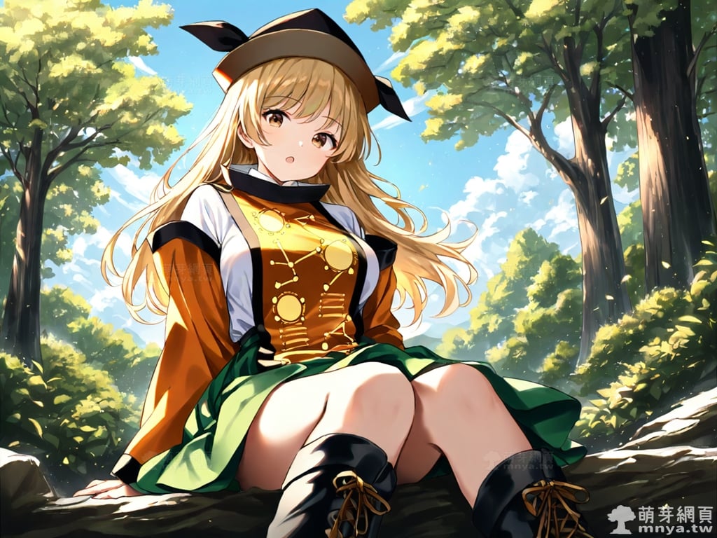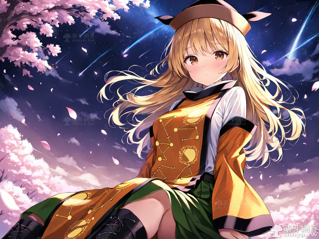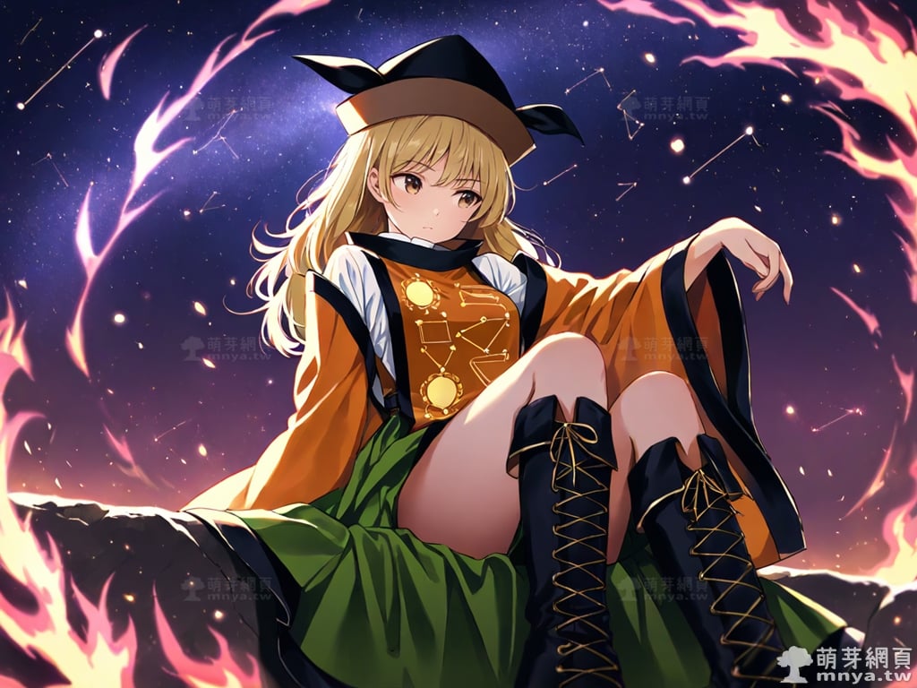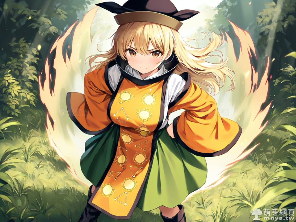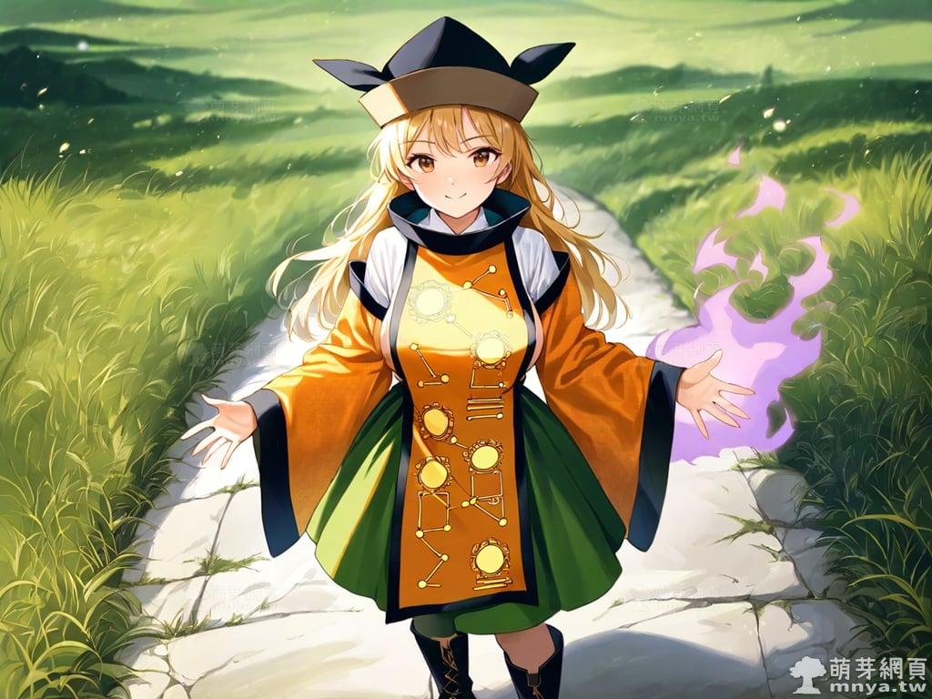 提詞文字:(masterpiece), (high quality), (high score), (great score), (year 2020), (kawaii), (loli), (photorealistic:0.1), 1girl, solo, (matara okina), touhou, __posture__, long hair, blonde hair, brown eyes, aura, black hat, constellation print, detached sleeves, green skirt, hat, long sleeves, orange sleeves, skirt, black boots, boots, large breasts, breasts, cowboy shot, __looking__, __expression__, __background__.