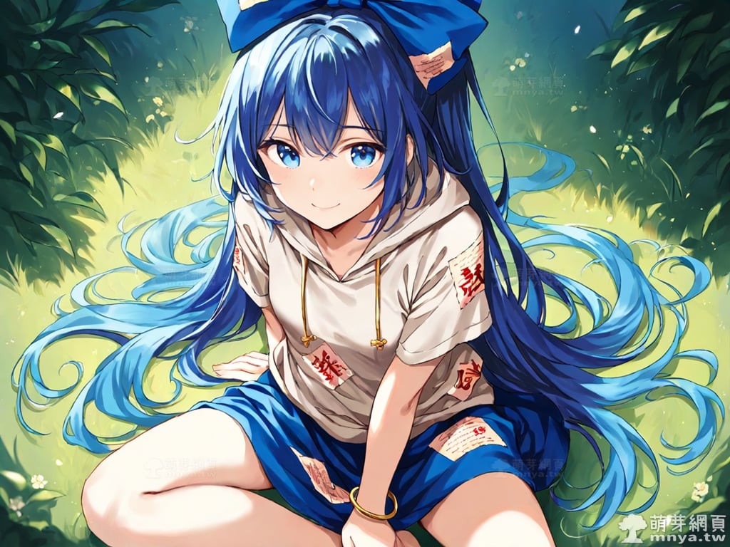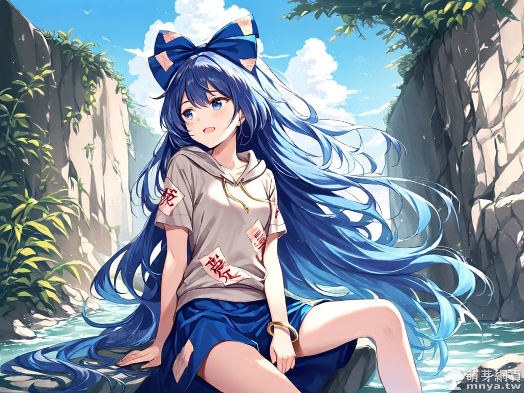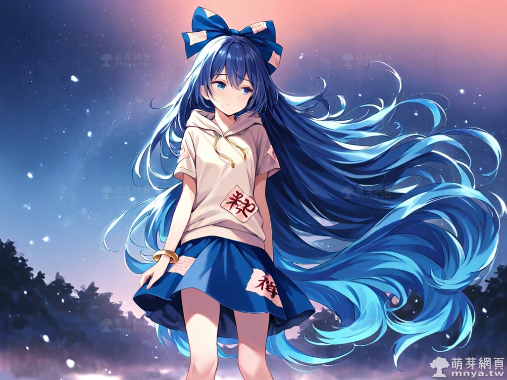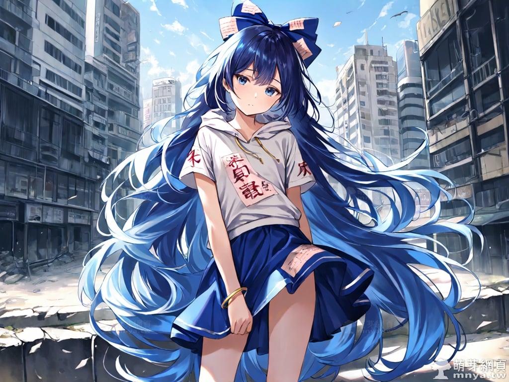 提詞文字:(masterpiece), (high quality), (high score), (great score), (year 2020), (kawaii), (loli), (photorealistic:0.1), 1girl, solo, (yorigami shion), touhou, __posture__, long hair, very long hair, absurdly long hair, blue hair, blue bow, hair bow, bow, blue eyes, blue skirt, bracelet, damaged, hood, hoodie, jewelry, short sleeves, skirt, barefoot, medium breasts, breasts, cowboy shot, __looking__, __expression__, __background__.