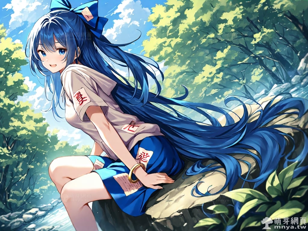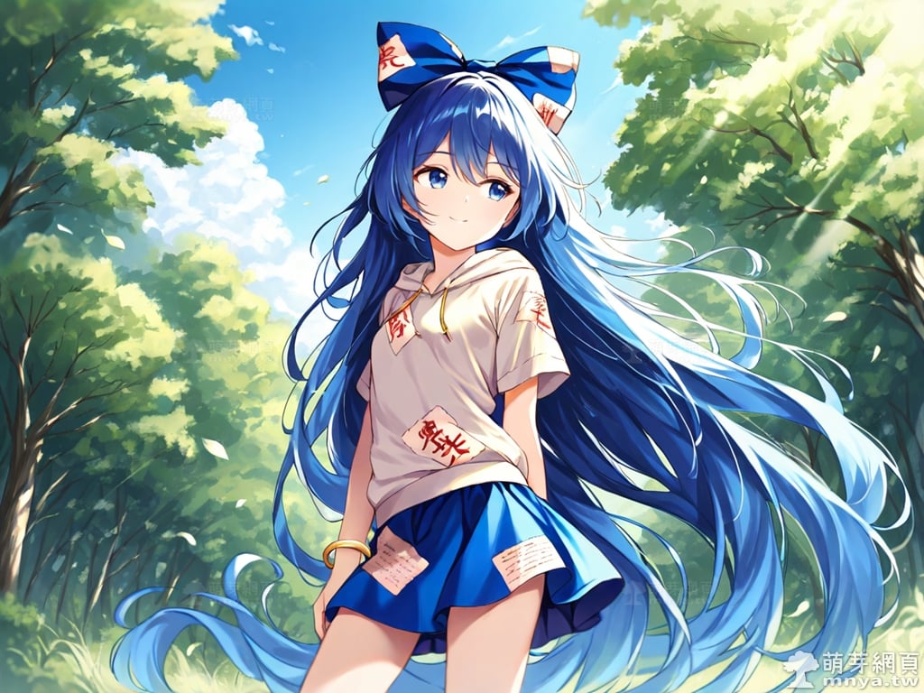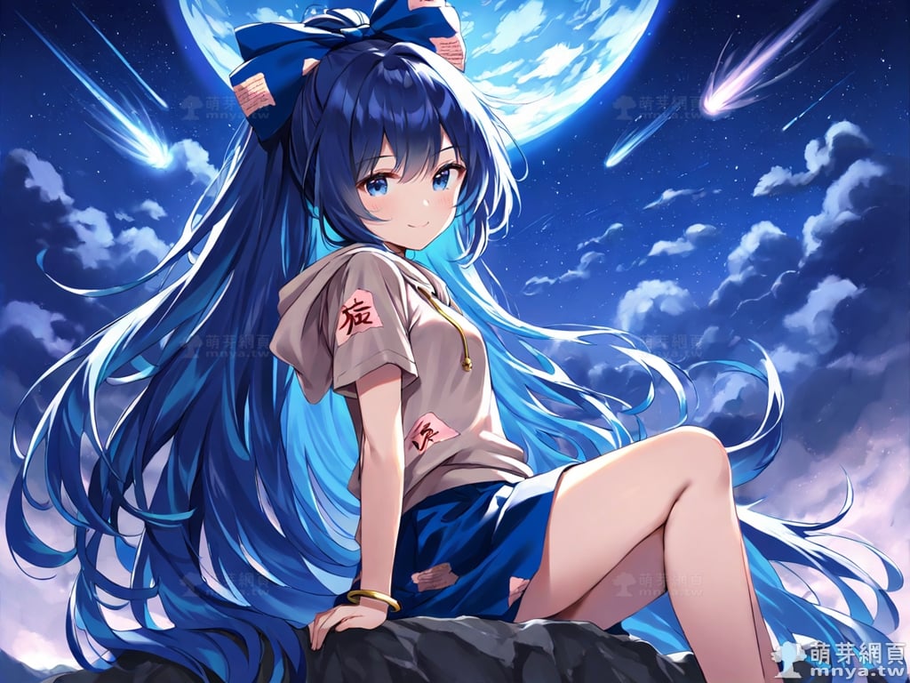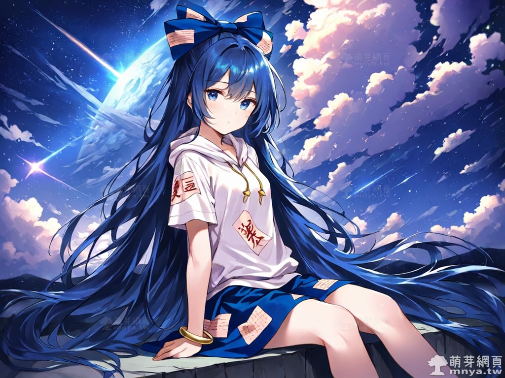 提詞文字:(masterpiece), (high quality), (high score), (great score), (year 2020), (kawaii), (loli), (photorealistic:0.1), 1girl, solo, (yorigami shion), touhou, __posture__, long hair, very long hair, absurdly long hair, blue hair, blue bow, hair bow, bow, blue eyes, blue skirt, bracelet, damaged, hood, hoodie, jewelry, short sleeves, skirt, barefoot, medium breasts, breasts, cowboy shot, __looking__, __expression__, __background__.