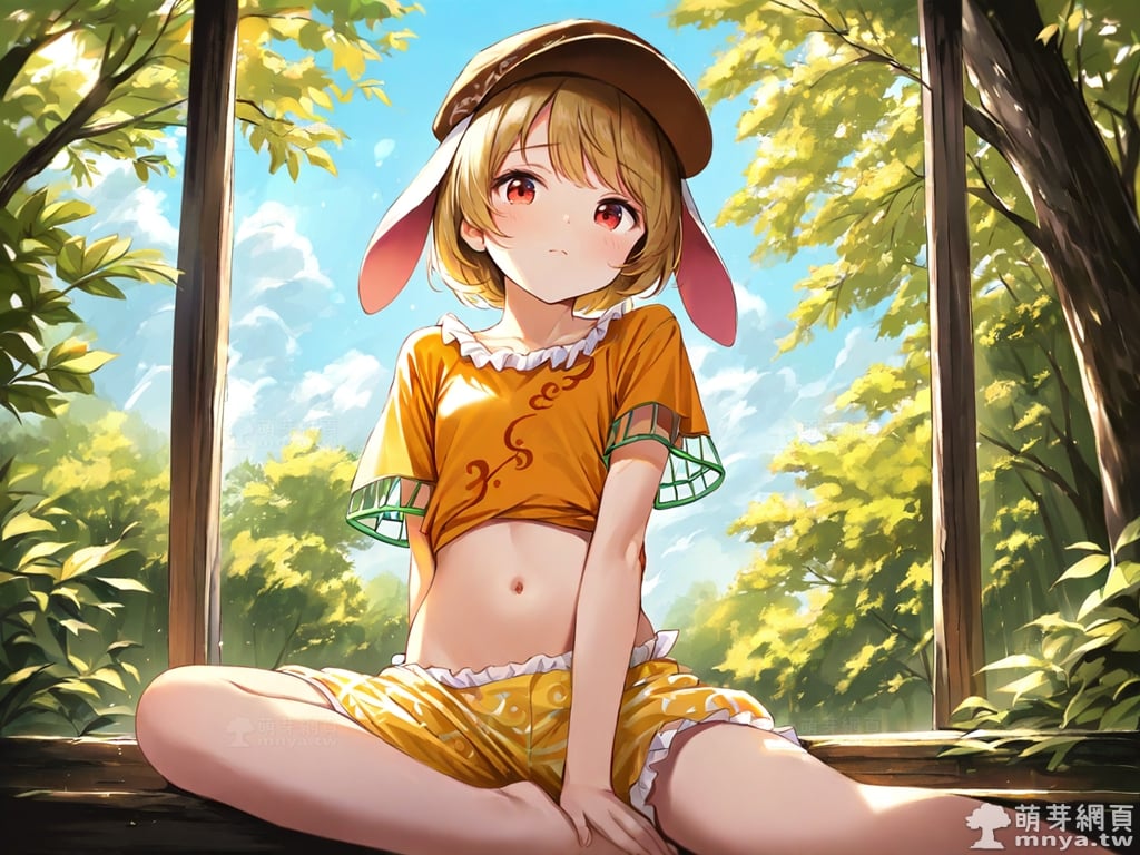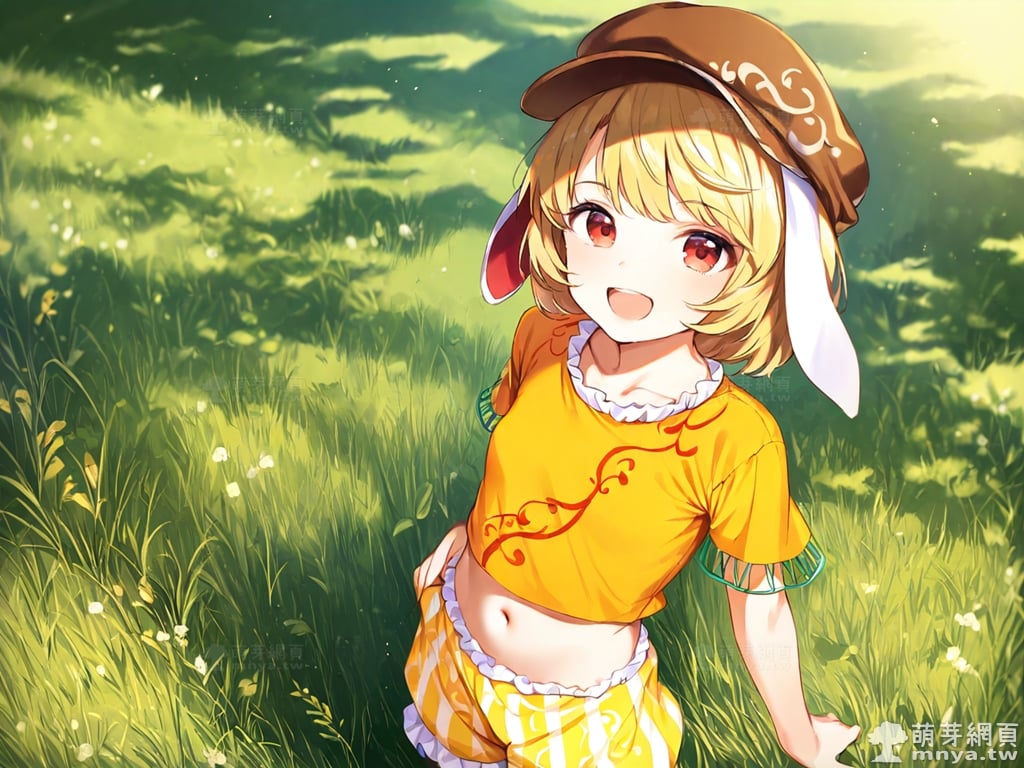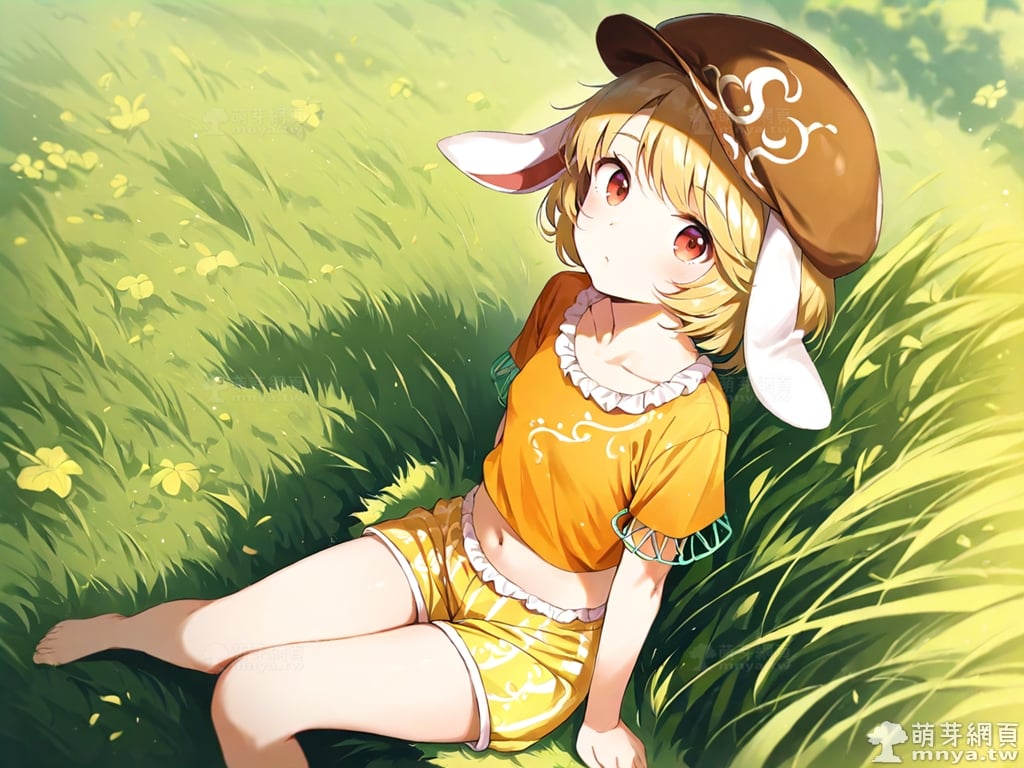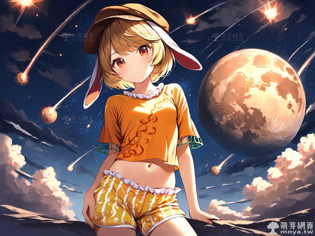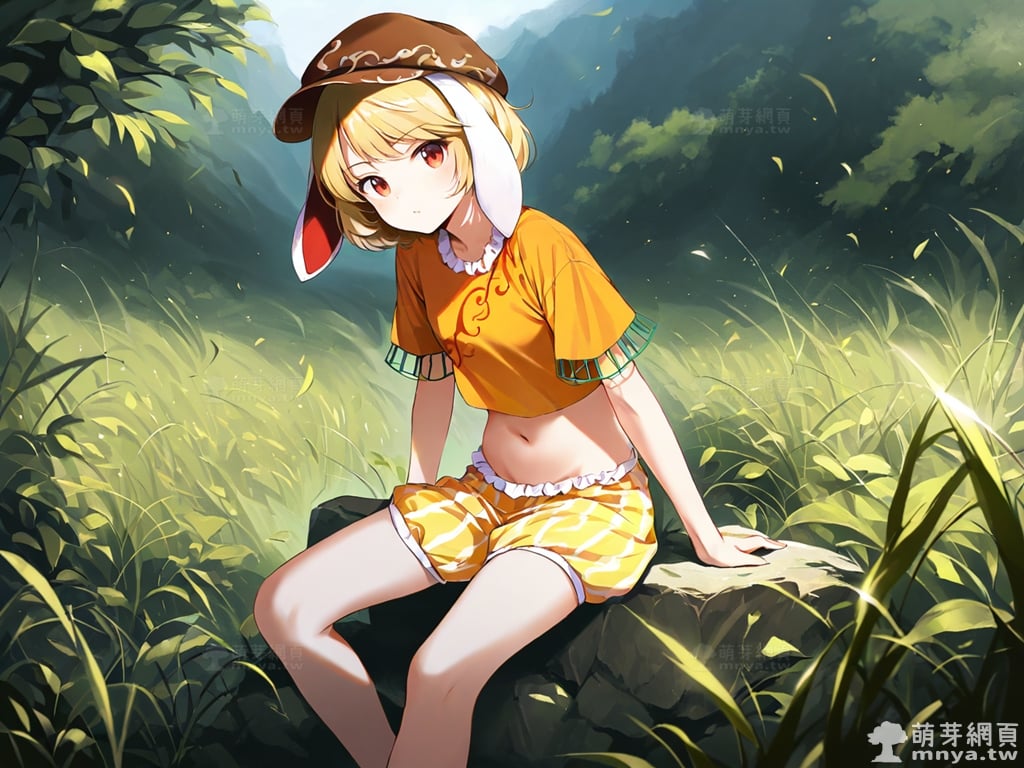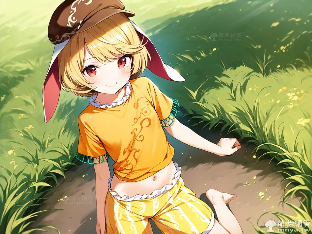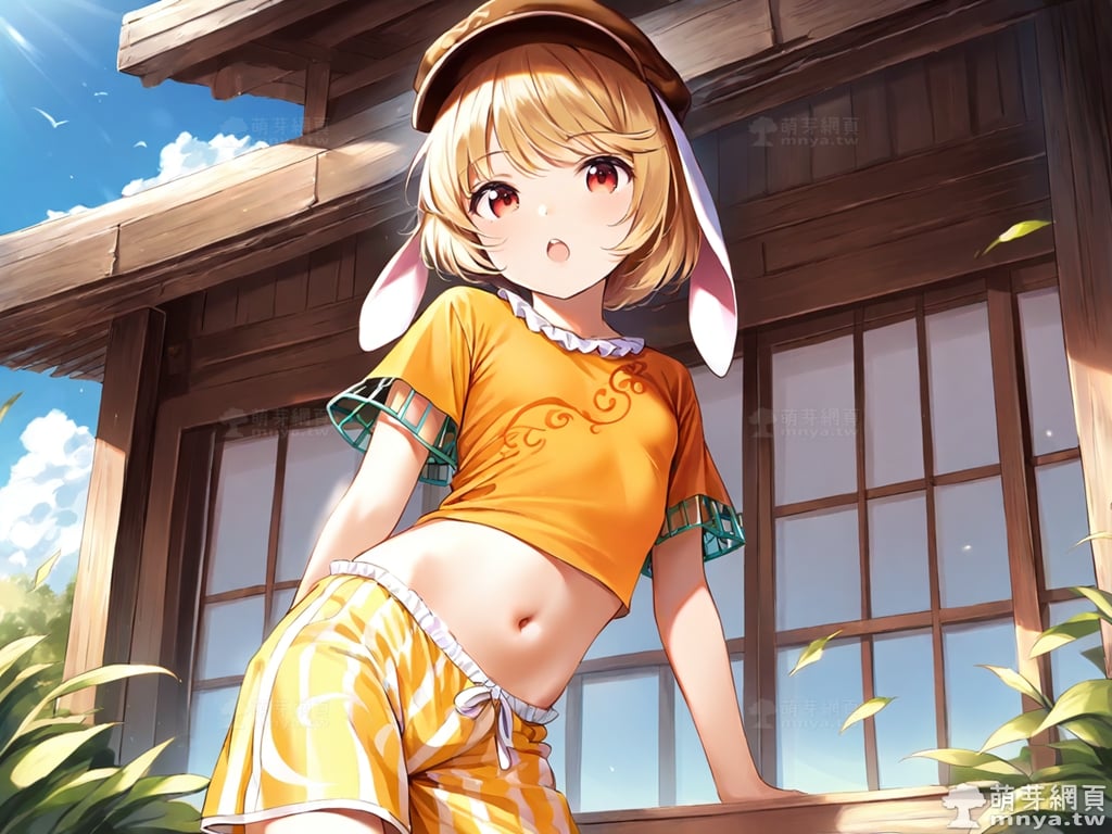 提詞文字:(masterpiece), (high quality), (high score), (great score), (year 2020), (kawaii), (loli), (photorealistic:0.1), 1girl, solo, (ringo \(touhou\)), touhou, __posture__, short hair, blonde hair, red eyes, animal ears, flat cap, floppy ears, hat, midriff, navel, orange shirt, rabbit ears, shirt, short sleeves, shorts, barefoot, small breasts, breasts, cowboy shot, __looking__, __expression__, __background__.