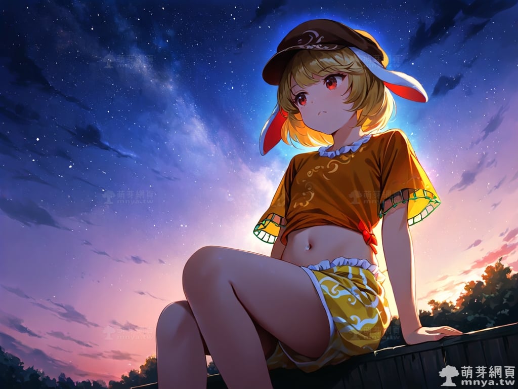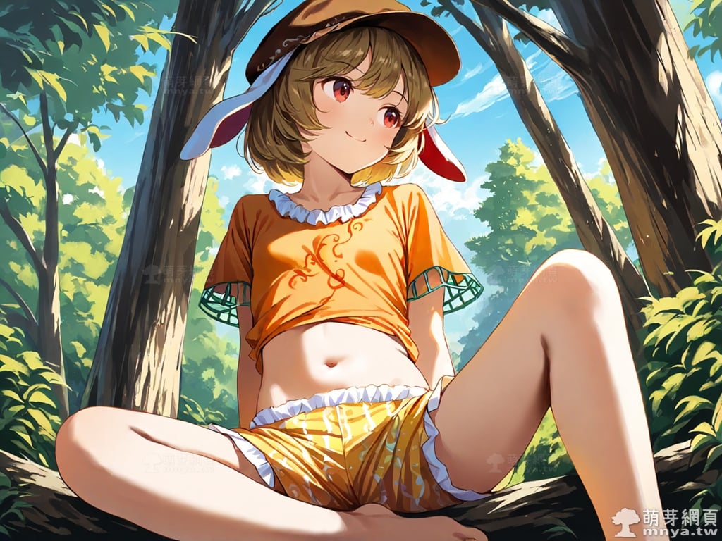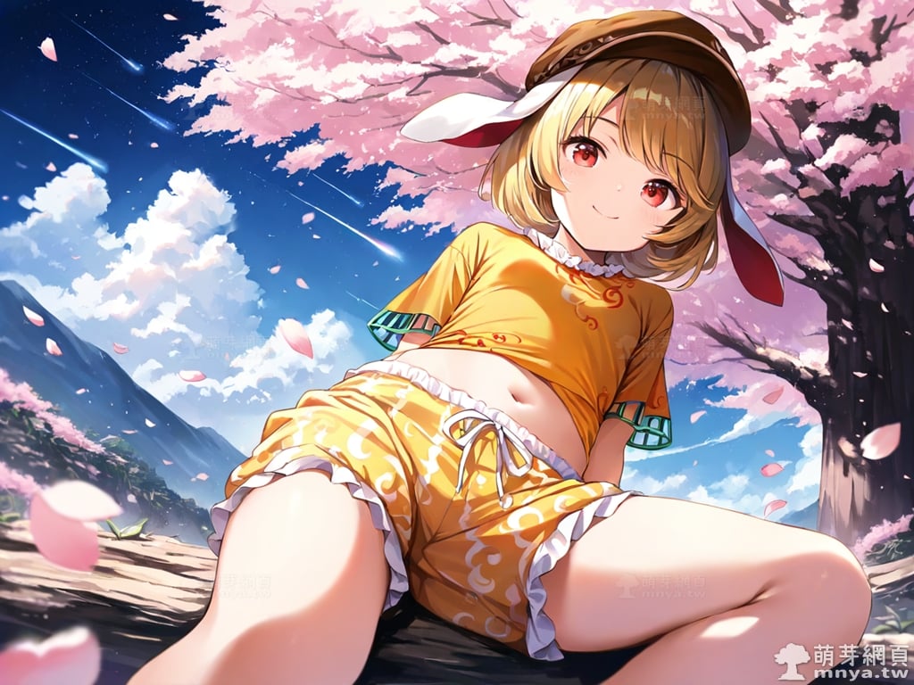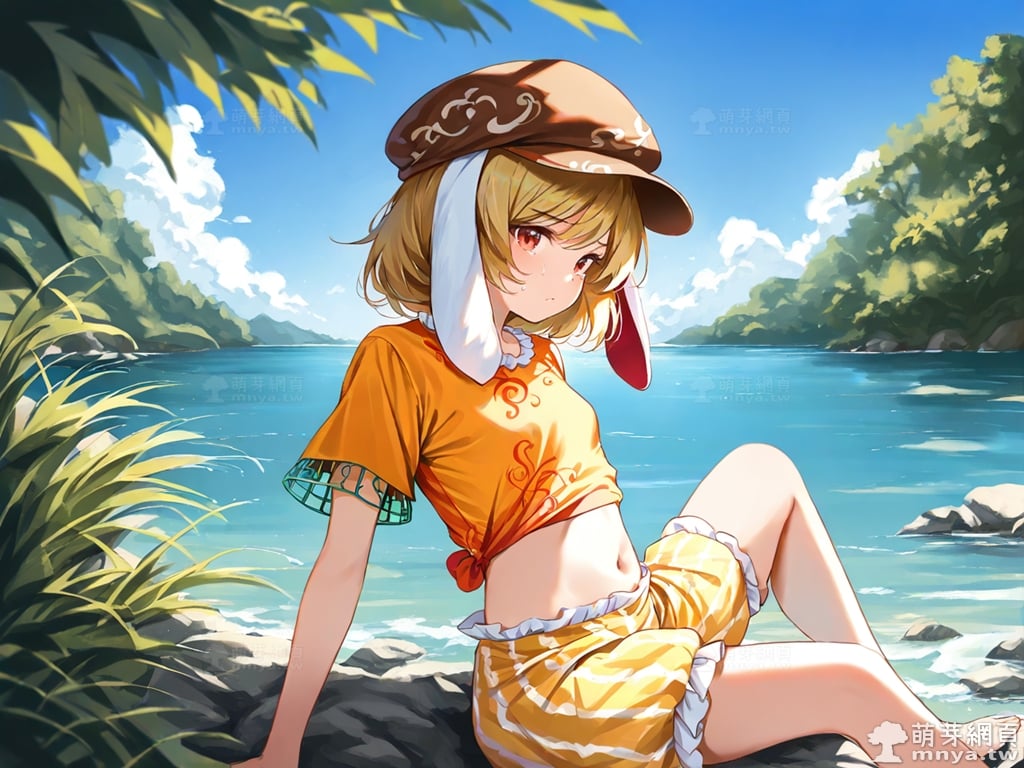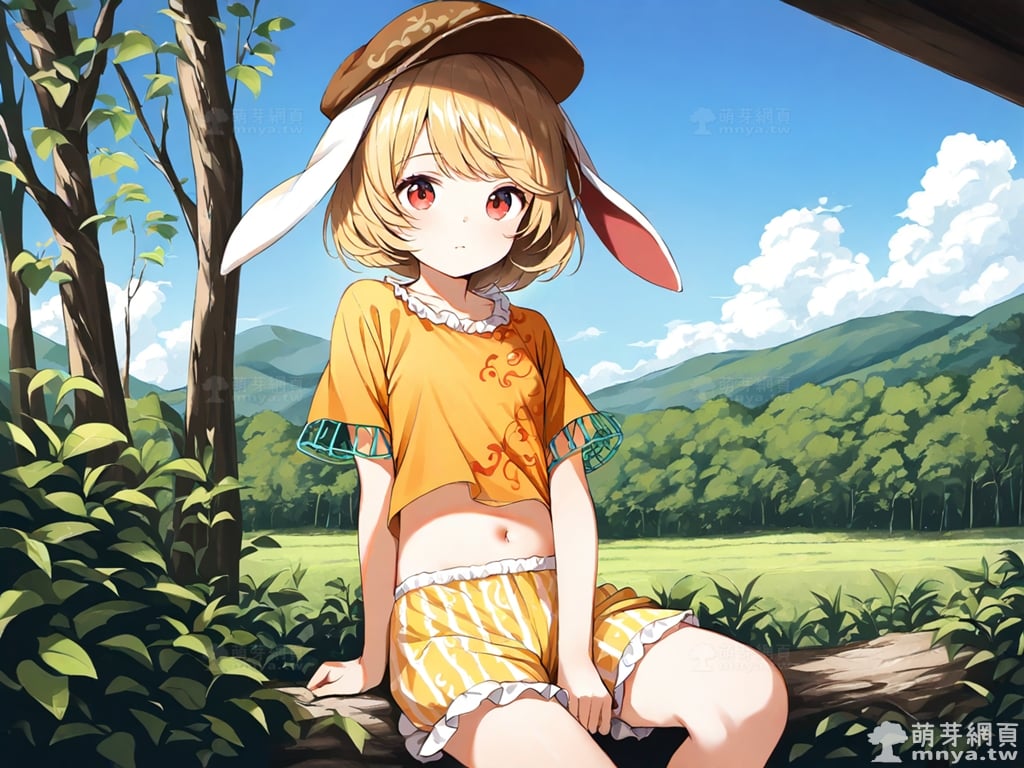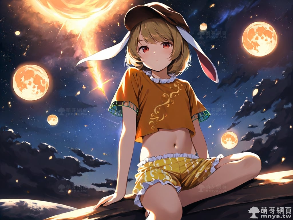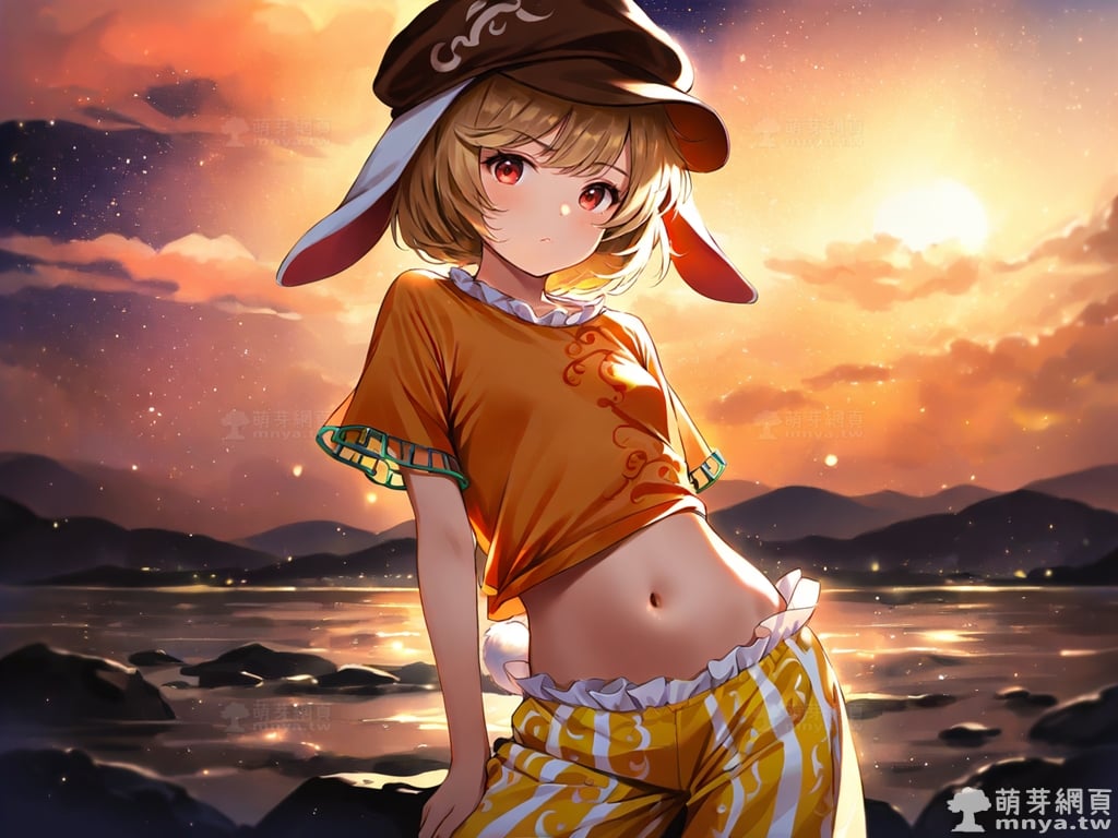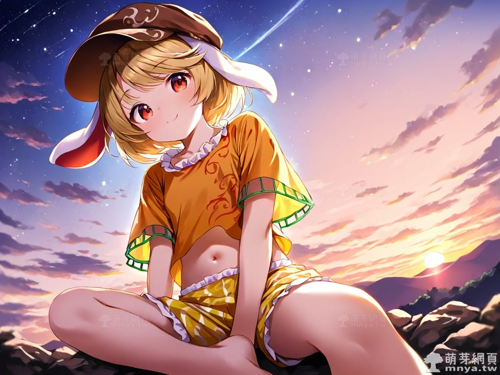 提詞文字:(masterpiece), (high quality), (high score), (great score), (year 2020), (kawaii), (loli), (photorealistic:0.1), 1girl, solo, (ringo \(touhou\)), touhou, __posture__, short hair, blonde hair, red eyes, animal ears, flat cap, floppy ears, hat, midriff, navel, orange shirt, rabbit ears, shirt, short sleeves, shorts, barefoot, small breasts, breasts, cowboy shot, __looking__, __expression__, __background__.
