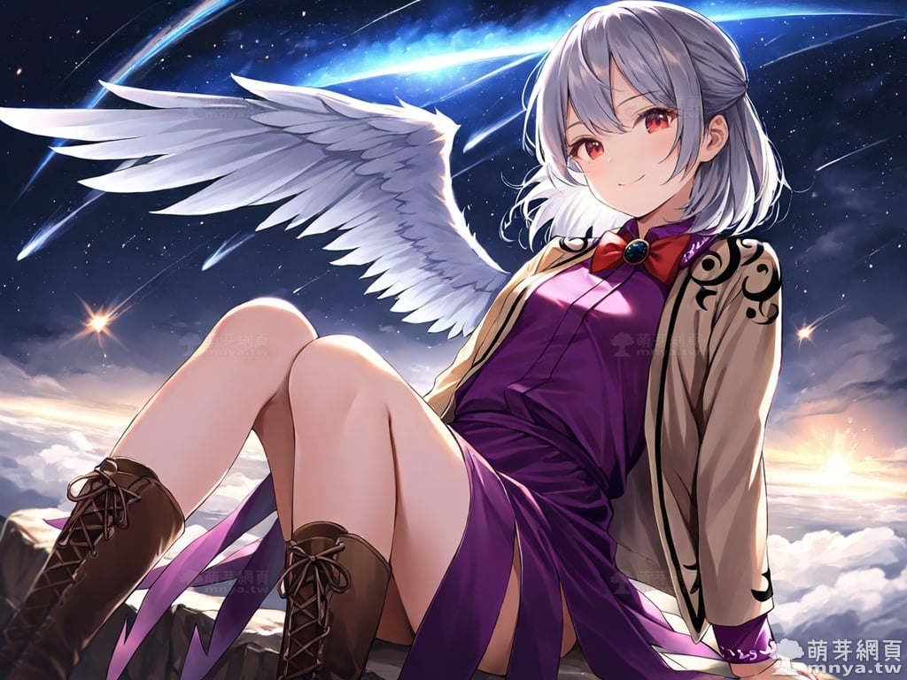 提詞文字:(masterpiece), (high quality), (high score), (great score), (year 2020), (kawaii), (loli), (photorealistic:0.1), 1girl, solo, (kishin sagume), touhou, __posture__, short hair, grey hair, red eyes, boots, bow, bowtie, brown boots, brown jacket, dress, jacket, long sleeves, open clothes, open jacket, purple dress, red bow, red bowtie, single wing, white wings, wings, medium breasts, breasts, cowboy shot, __looking__, __expression__, __background__.