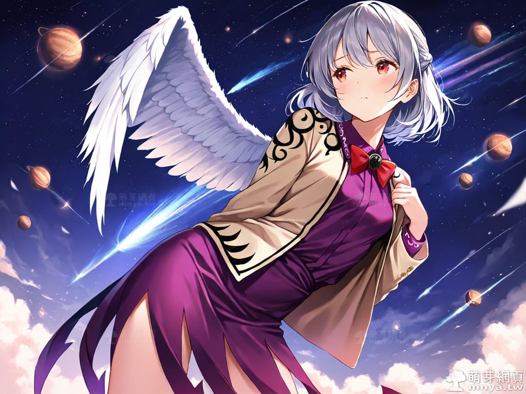 東方Project角色 AI 圖畫第一百一十二彈,此次的目標是「東方紺珠傳~ Legacy of Lunatic Kingdom.」初次登場的「稀神探女」(稀神 サグメ,Kishin Sagume),月之都的高官,身為月人,她擁有從口中說出便可使事態逆轉的能力,但也因此平時沉默寡言。她曾參與「月之都遷都計畫」的制定,並以其能力製作了靈異珠投放到幻想鄉,之後也曾親自前往幻想鄉的永遠亭拜訪月之賢者八意永琳。從外型上看,她擁有一頭亮麗的銀色短髮,以及引人注目的紅色瞳孔。她常穿著短裙、搭配領結、皮鞋和短靴,而她最大的特徵是那對顯眼的單邊翅膀。她的主要活動範圍在月之都,並隸屬於月之都。使用 SDXL 模型直接生成,效果很不錯。總共產生 100 張,挑掉不合理跟瑕疵較多的有 12 張如下提供大家參考。