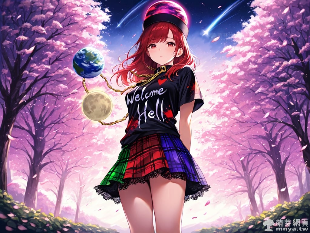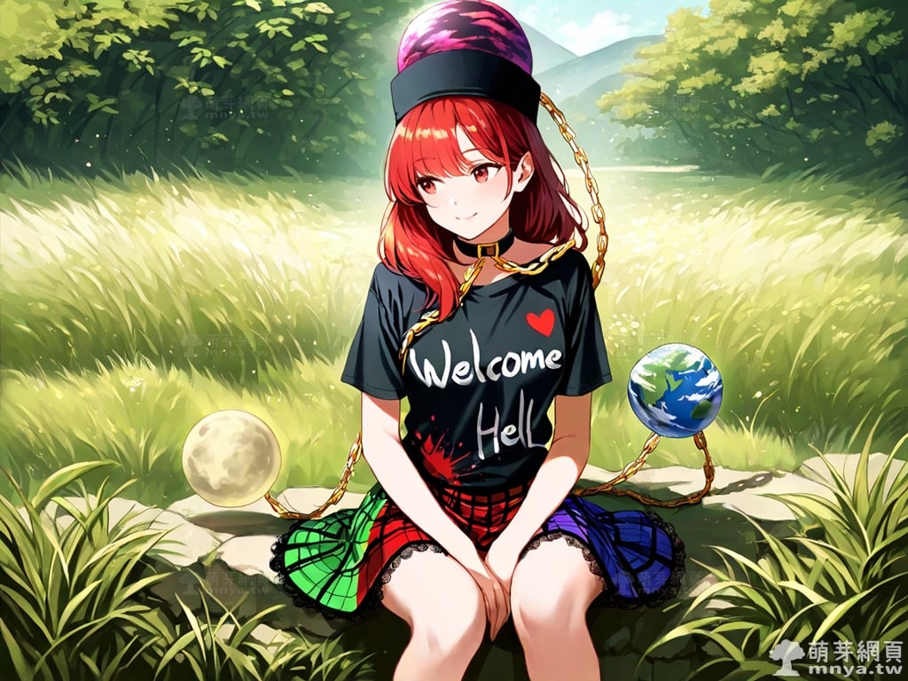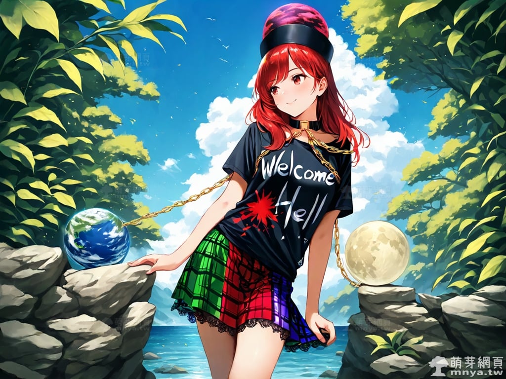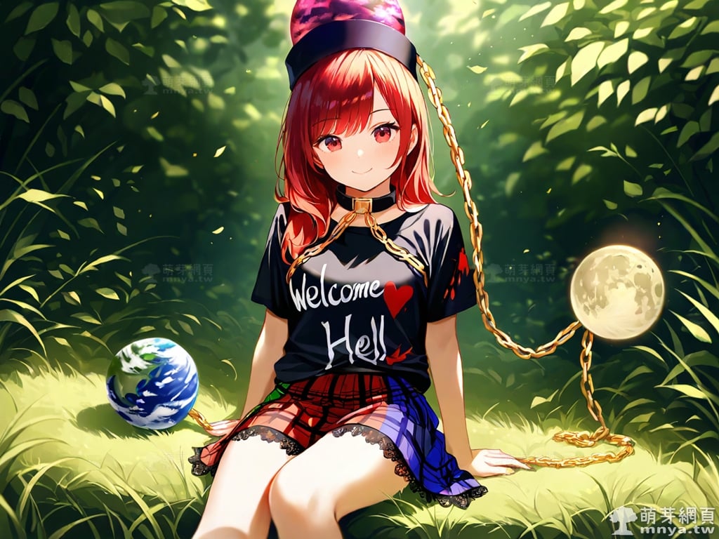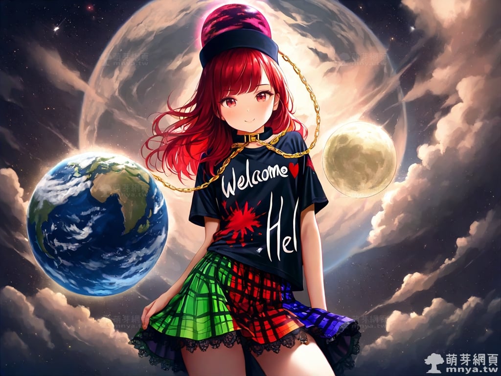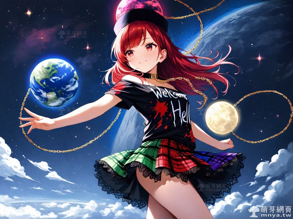 提詞文字:(masterpiece), (high quality), (high score), (great score), (year 2020), (kawaii), (loli), (photorealistic:0.1), 1girl, solo, (hecatia lapislazuli), touhou, __posture__, long hair, red hair, red eyes, black shirt, chain, gold chain, clothes writing, hat, multicolored skirt, shirt, lace trim, lace-trimmed skirt, skirt, short sleeves, english text, moon \(ornament\), earth \(ornament\), bare legs, barefoot, large breasts, breasts, cowboy shot, __looking__, __expression__, __background__.