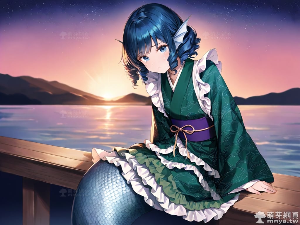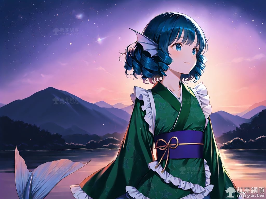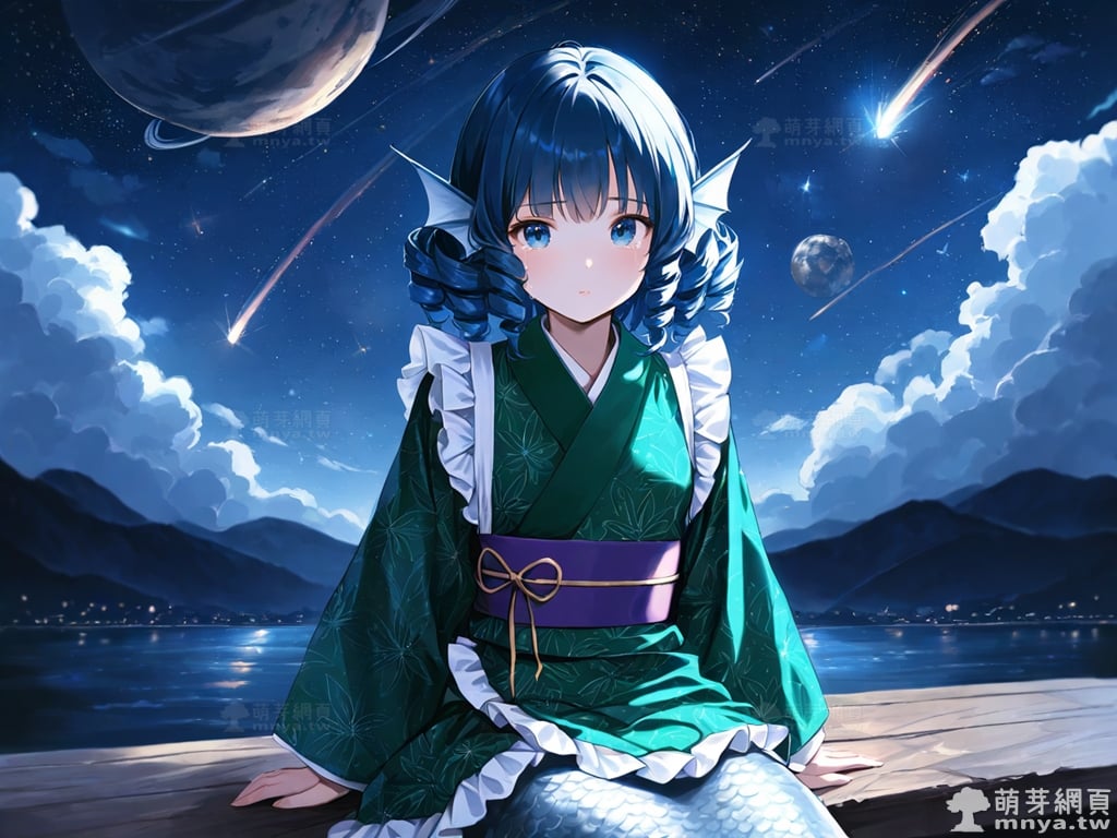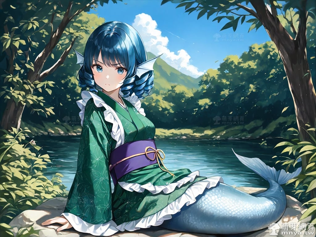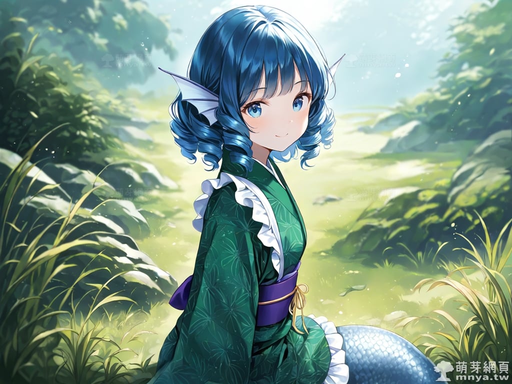 提詞文字:(masterpiece), (high quality), (high score), (great score), (year 2020), (kawaii), (loli), (photorealistic:0.1), 1girl, solo, (wakasagihime), touhou, __posture__, short hair, sidelocks, drill sidelocks, blue hair, drill hair, blue eyes, head fins, fins, green kimono, japanese clothes, kimono, frilled kimono, mermaid, monster girl, pale skin, medium breasts, breasts, cowboy shot, __looking__, __expression__, __background__.