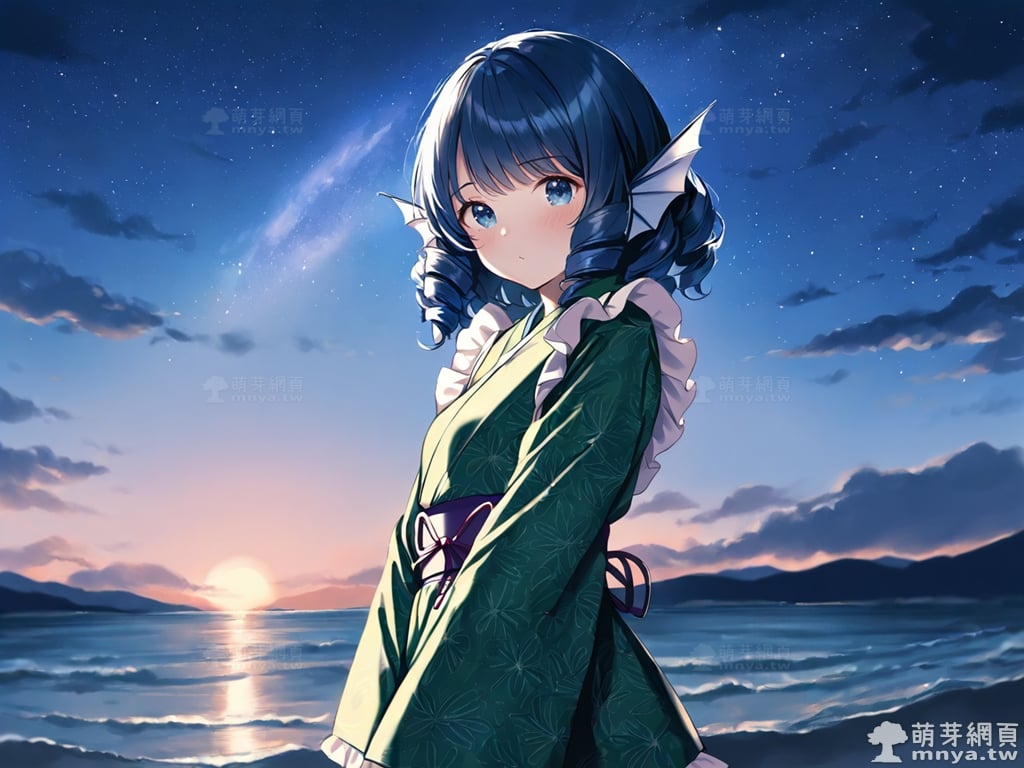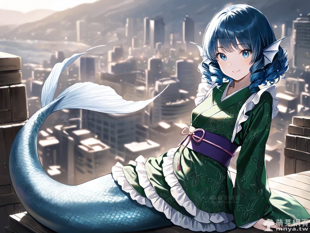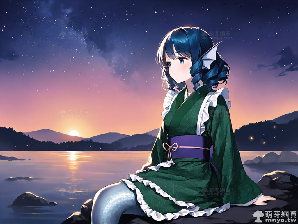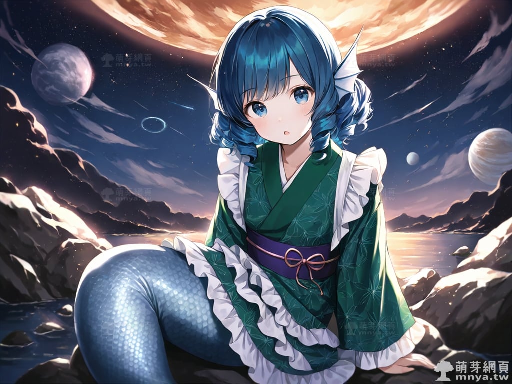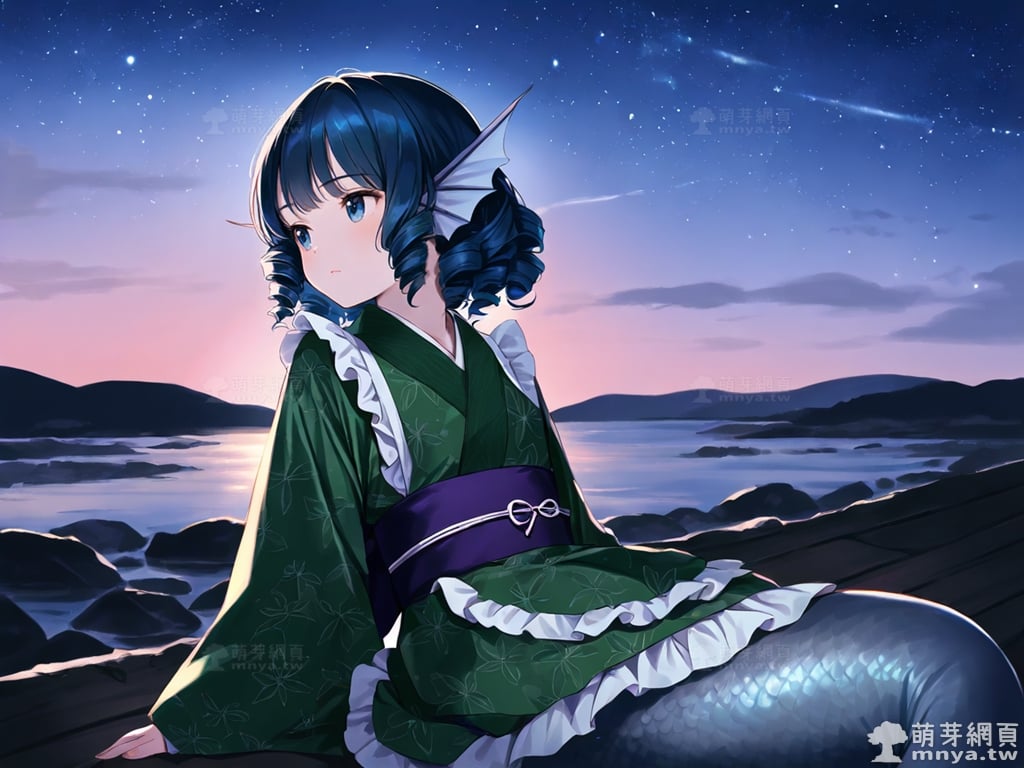 提詞文字:(masterpiece), (high quality), (high score), (great score), (year 2020), (kawaii), (loli), (photorealistic:0.1), 1girl, solo, (wakasagihime), touhou, __posture__, short hair, sidelocks, drill sidelocks, blue hair, drill hair, blue eyes, head fins, fins, green kimono, japanese clothes, kimono, frilled kimono, mermaid, monster girl, pale skin, medium breasts, breasts, cowboy shot, __looking__, __expression__, __background__.