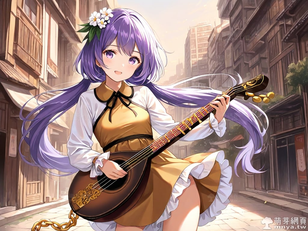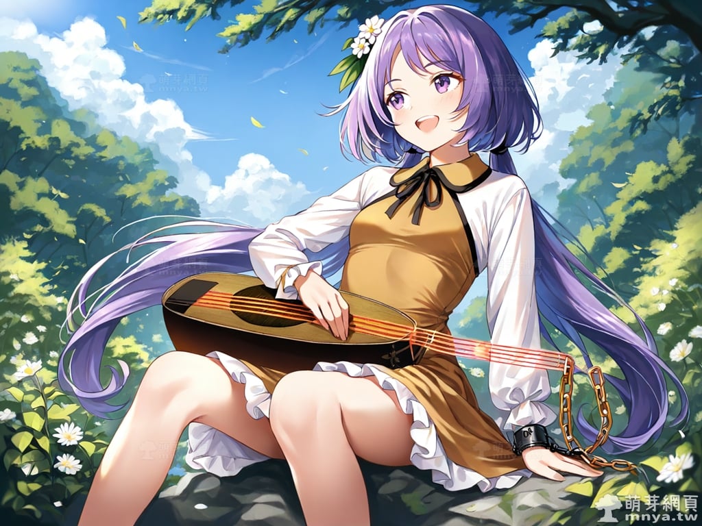 提詞文字:(masterpiece), (high quality), (high score), (great score), (year 2020), (kawaii), (loli), (photorealistic:0.1), 1girl, solo, (tsukumo benben), touhou, __posture__, long hair, purple hair, twintails, low twintails, hair flower, white flower, flower, hair ornament, purple eyes, barefoot, biwa lute, black ribbon, brown dress, chain, collared dress, cuffs, dress, frilled dress, frills, gold chain, instrument, long sleeves, music, playing instrument, ribbon, short dress, bare legs, white sleeves, medium breasts, breasts, cowboy shot, __looking__, __expression__, __background__.