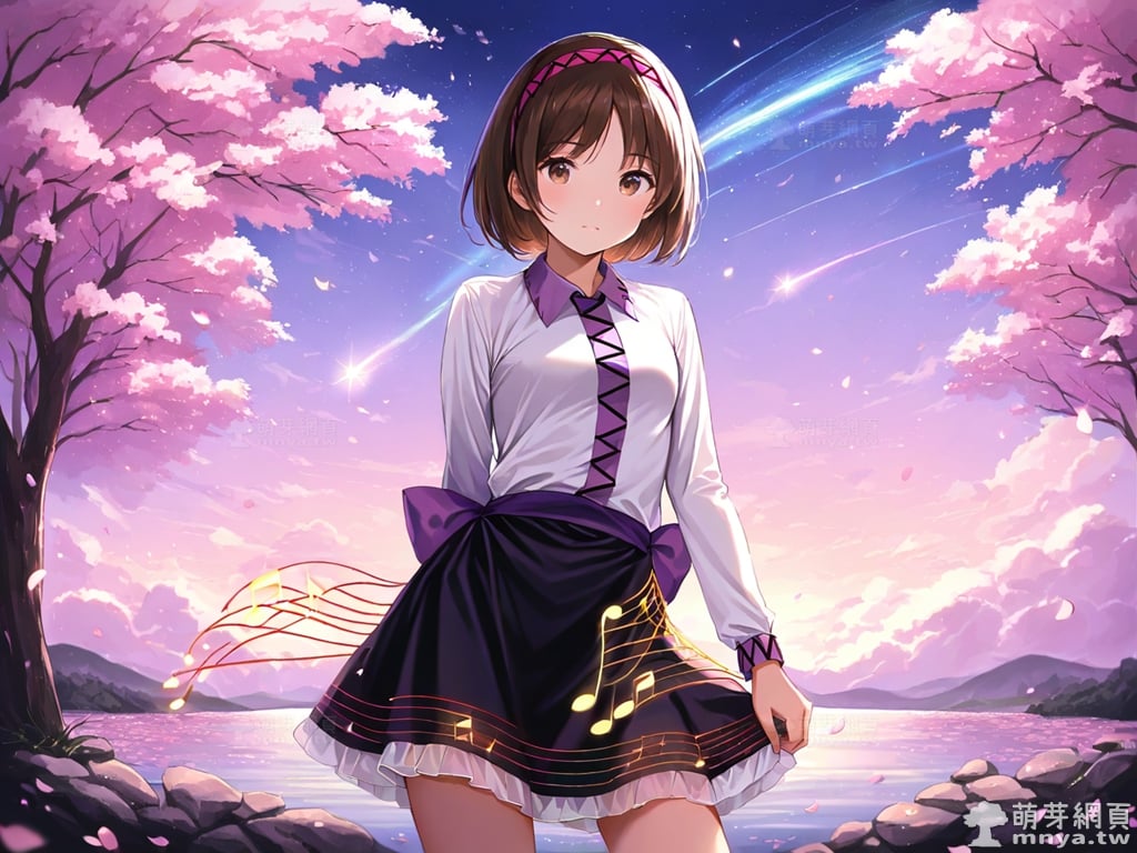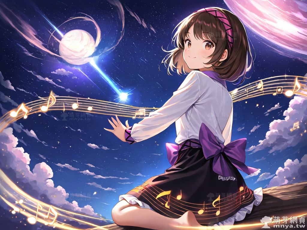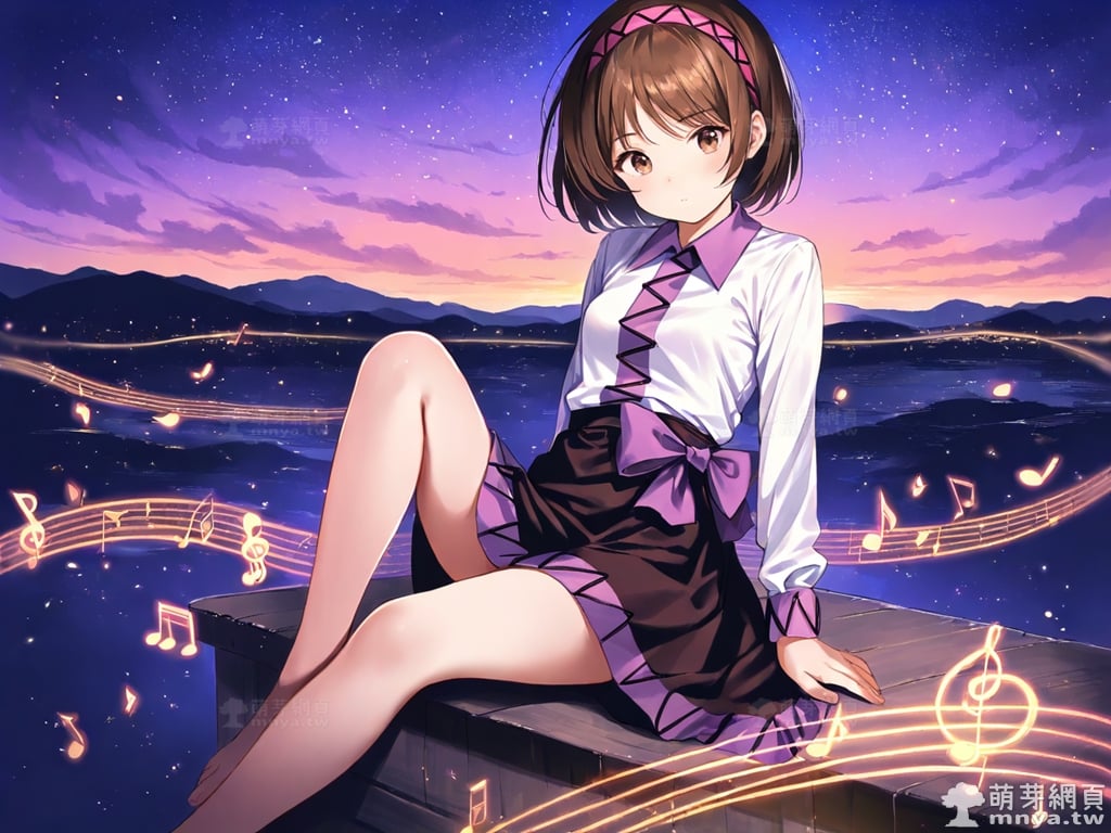 提詞文字:(masterpiece), (high quality), (high score), (great score), (year 2020), (kawaii), (loli), (photorealistic:0.1), 1girl, solo, (tsukumo yatsuhashi), touhou, __posture__, short hair, brown hair, pink hairband, hairband, brown eyes, black skirt, collared shirt, long sleeves, musical note, purple bow, waist bow, bow, white shirt, shirt, skirt, tsukumogami, barefoot, medium breasts, breasts, cowboy shot, __looking__, __expression__, __background__.
