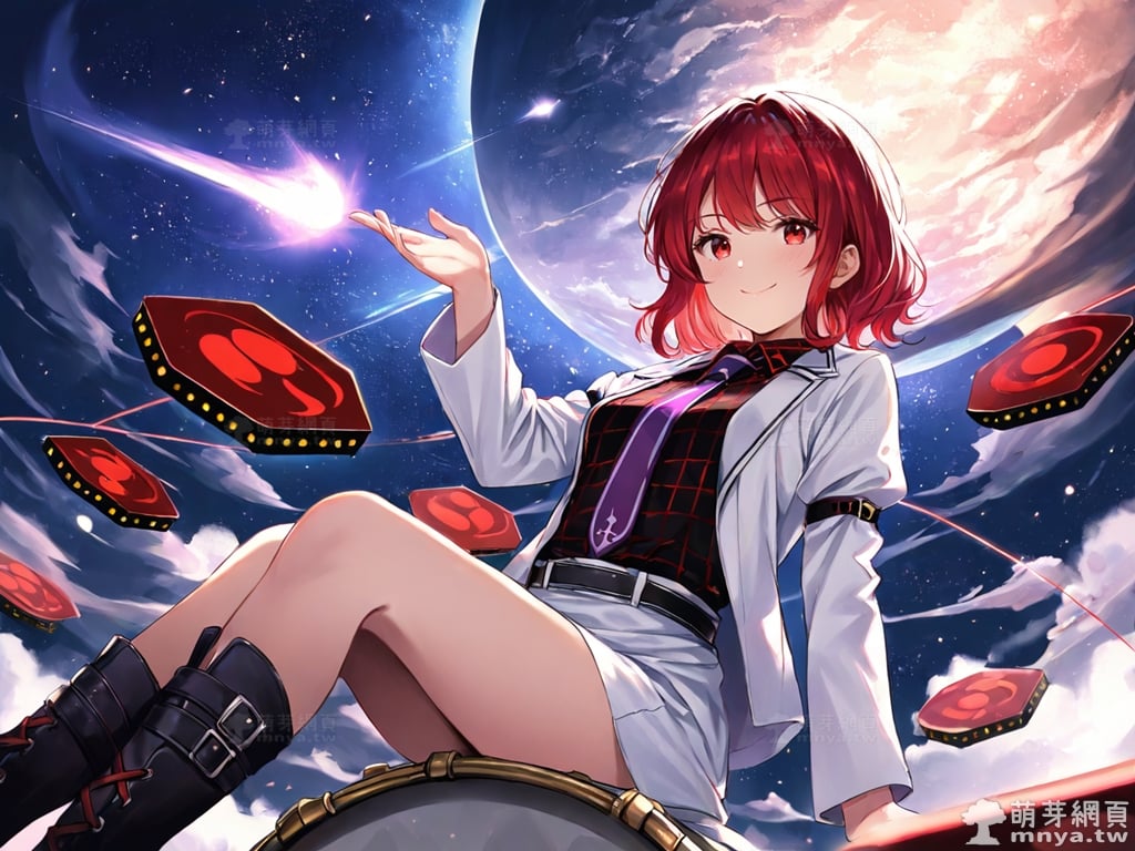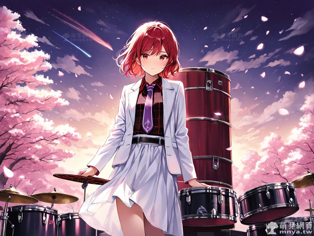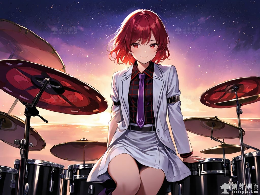 提詞文字:(masterpiece), (high quality), (high score), (great score), (year 2020), (kawaii), (loli), (photorealistic:0.1), 1girl, solo, (horikawa raiko), touhou, __posture__, short hair, red hair, red eyes, suit jacket , jacket, white skirt, skirt, necktie, open clothes, open jacket, white jacket, purple necktie, boots, mitsudomoe \(shape\), tsukumogami, drum, drum set, instrument, medium breasts, breasts, cowboy shot, __looking__, __expression__, __background__.
