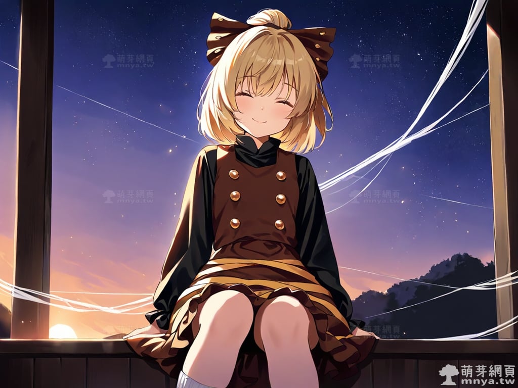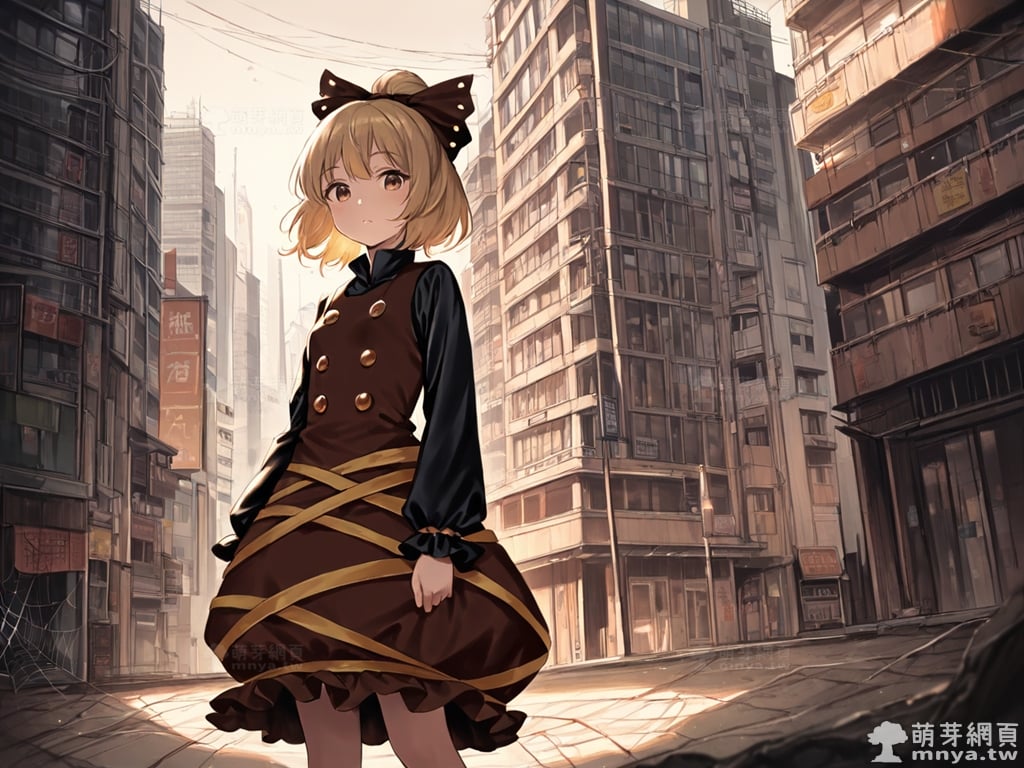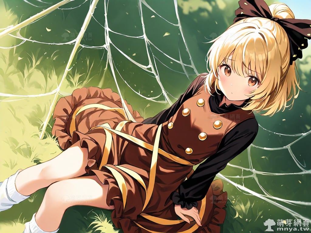 提詞文字:(masterpiece), (high quality), (high score), (great score), (year 2020), (kawaii), (loli), (photorealistic:0.1), 1girl, solo, (kurodani yamame), touhou, __posture__, short hair, blonde hair, ponytail, bow, hair bow, brown eyes, brown dress, dress, long sleeves, sleeveless dress, sleeveless, socks, silk, spider web, small breasts, breasts, cowboy shot, __looking__, __expression__, __background__.