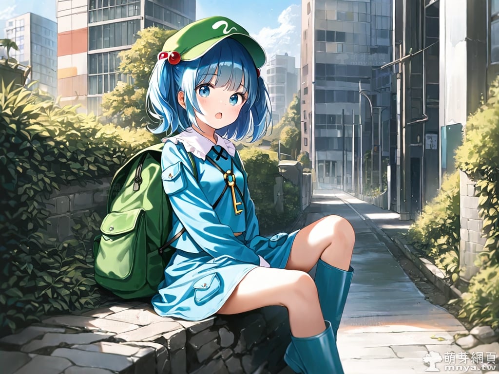提詞文字:(masterpiece), (high quality), (high score), (great score), (year 2020), (kawaii), (loli), (photorealistic:0.1), 1girl, solo, (kawashiro nitori), touhou, __posture__, short hair, blue hair, twintails, two side up, hair bobbles, hair ornament, blue eyes, backpack, bag, boots, flat cap, hat, knee boots, long sleeves, rubber boots, small breasts, breasts, cowboy shot, __looking__, __expression__, __background__.