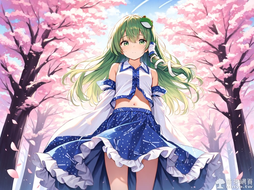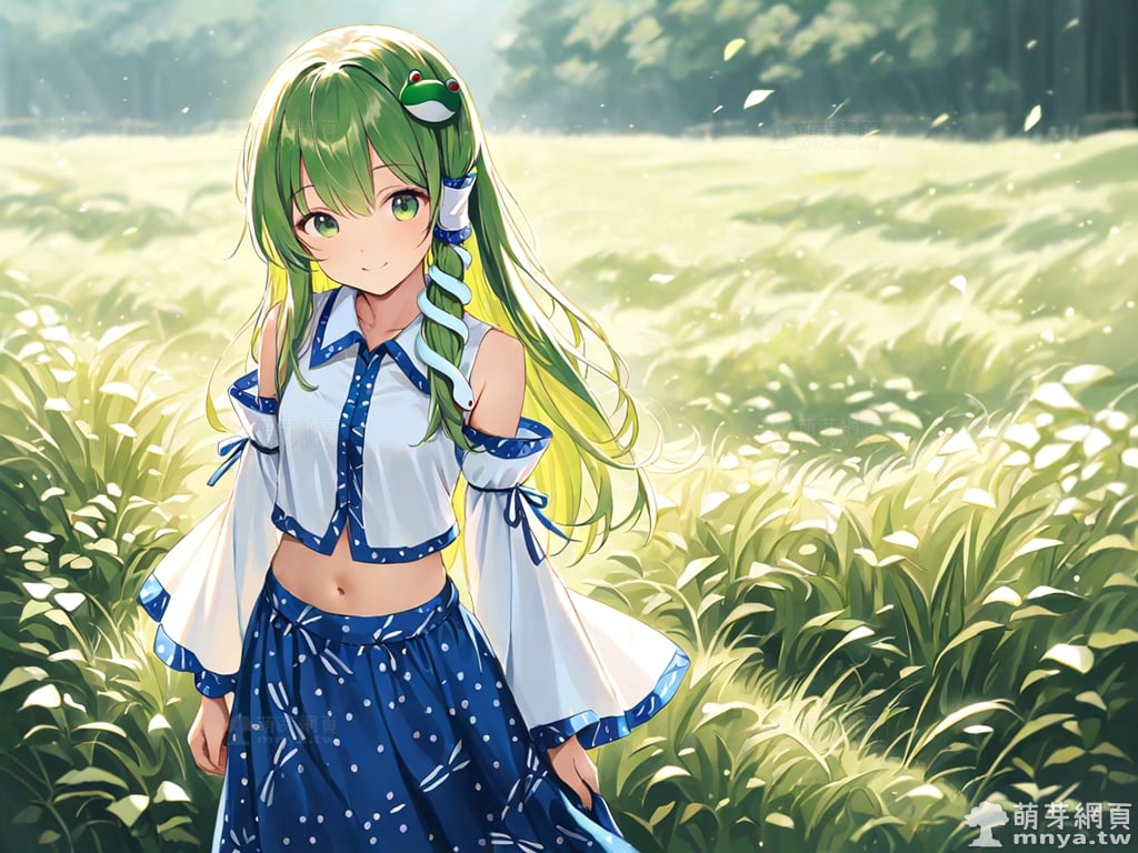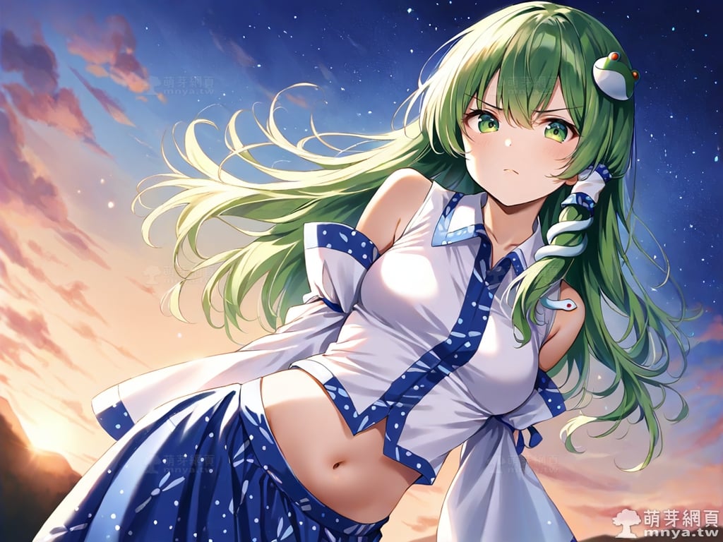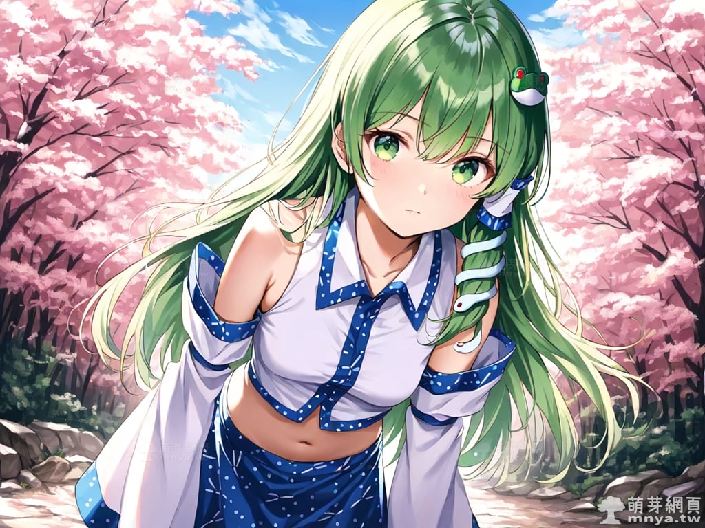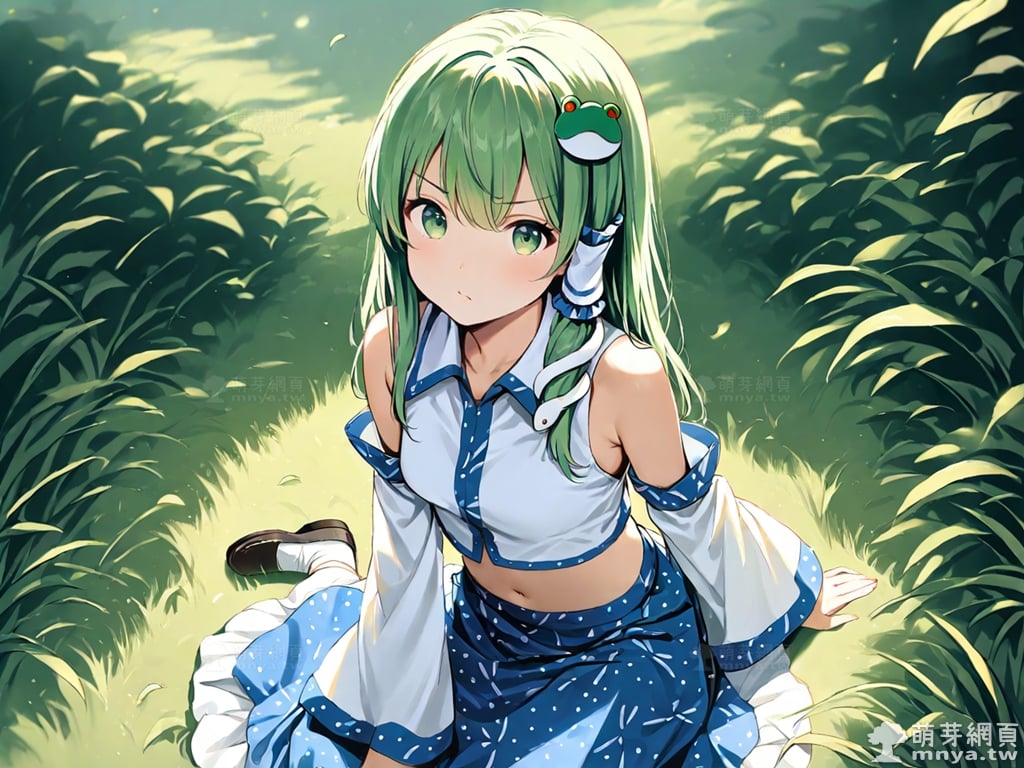 提詞文字:(masterpiece), (high quality), (high score), (great score), (year 2020), (kawaii), (loli), (photorealistic:0.1), 1girl, solo, (kochiya sanae), touhou, __posture__, long hair, green hair, hair ornament, frog hair ornament, single hair tube, hair tubes, snake hair ornament, sidelocks, hair between eyes, green eyes, bare shoulders, blue skirt, collarbone, collared shirt, covered collarbone, crop top, detached sleeves, long skirt, long sleeves, midriff, navel, shirt, skirt, socks, white shirt, white socks, wide sleeves, shoes, medium breasts, breasts, cowboy shot, __looking__, __expression__, __background__.