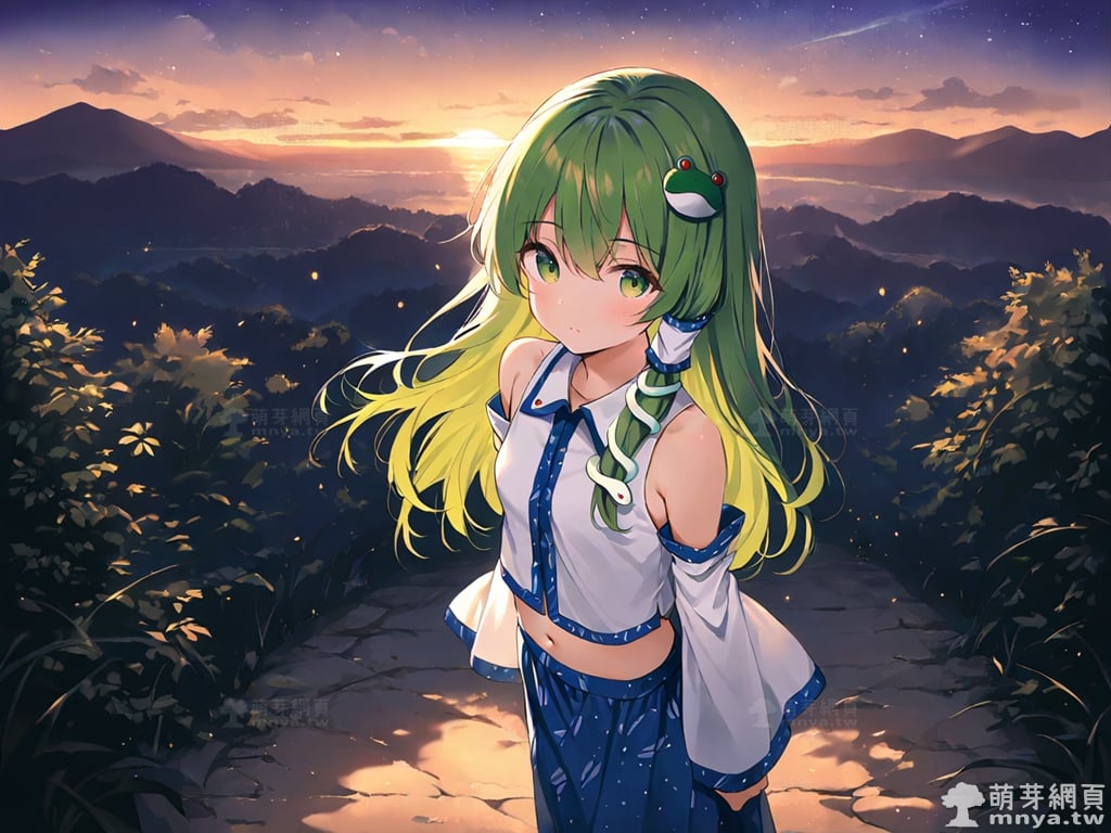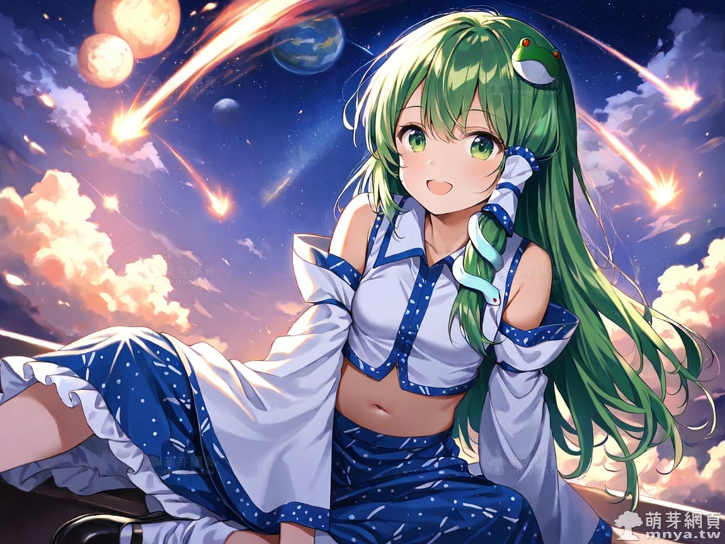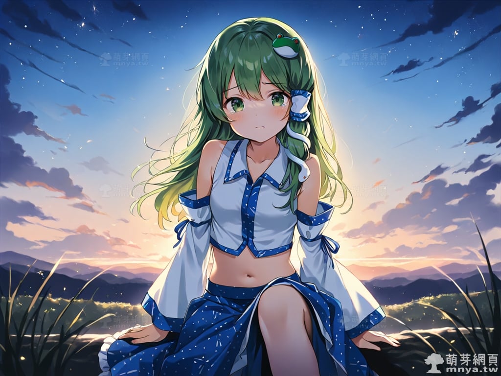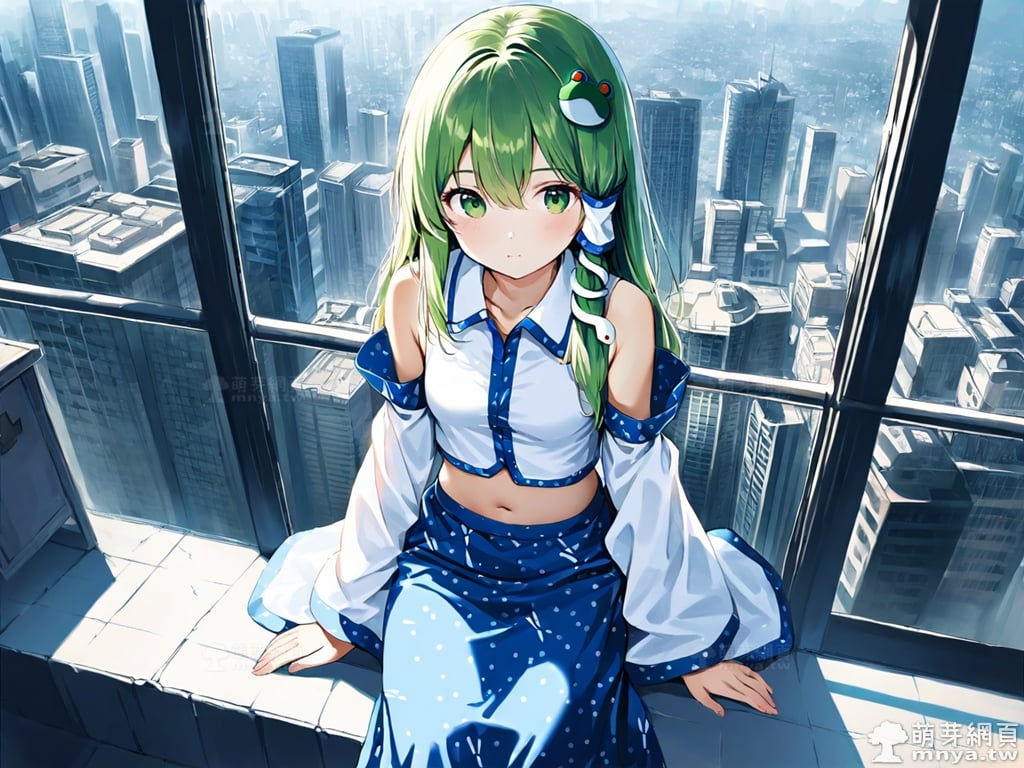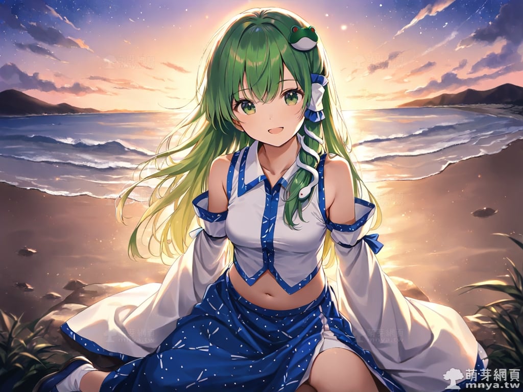 提詞文字:(masterpiece), (high quality), (high score), (great score), (year 2020), (kawaii), (loli), (photorealistic:0.1), 1girl, solo, (kochiya sanae), touhou, __posture__, long hair, green hair, hair ornament, frog hair ornament, single hair tube, hair tubes, snake hair ornament, sidelocks, hair between eyes, green eyes, bare shoulders, blue skirt, collarbone, collared shirt, covered collarbone, crop top, detached sleeves, long skirt, long sleeves, midriff, navel, shirt, skirt, socks, white shirt, white socks, wide sleeves, shoes, medium breasts, breasts, cowboy shot, __looking__, __expression__, __background__.