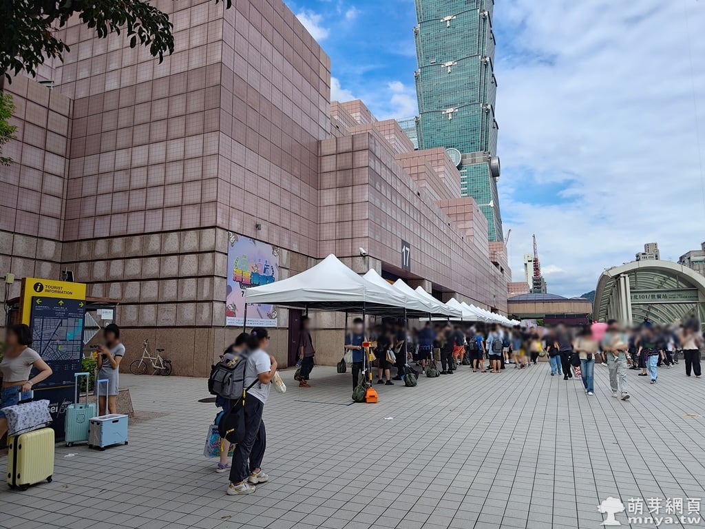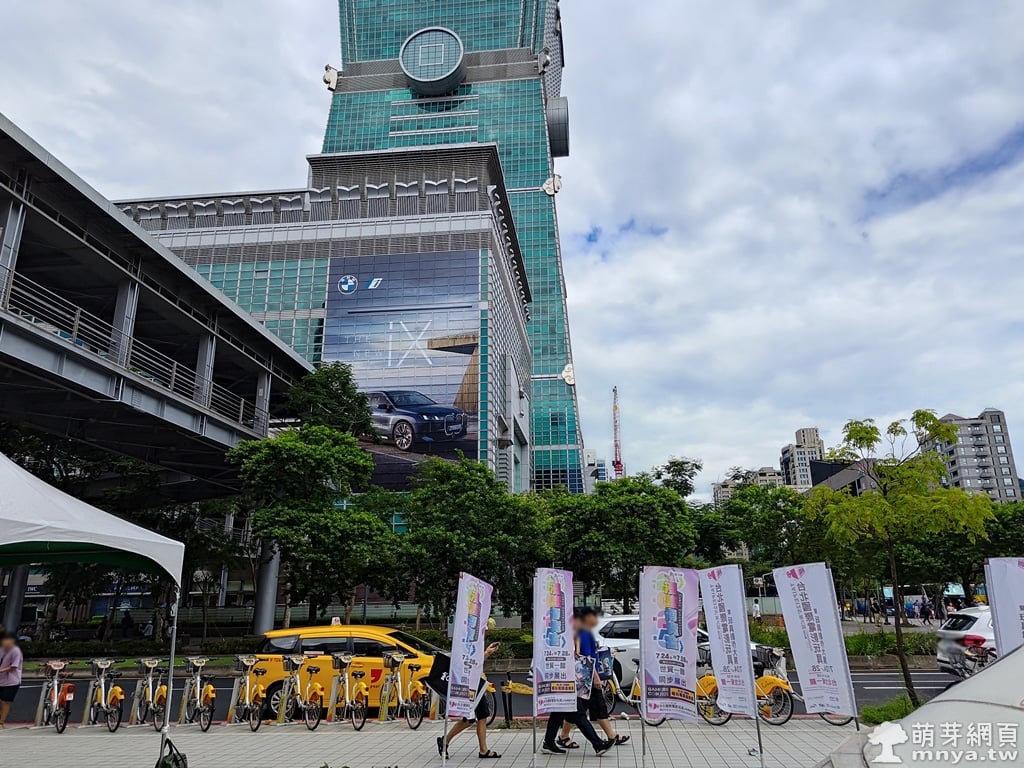 ▲ 台北101腳下熱鬧非凡,不只有 YouBike、計程車,還能看到漫畫博覽會的旗幟與指示,充滿活動氛圍。