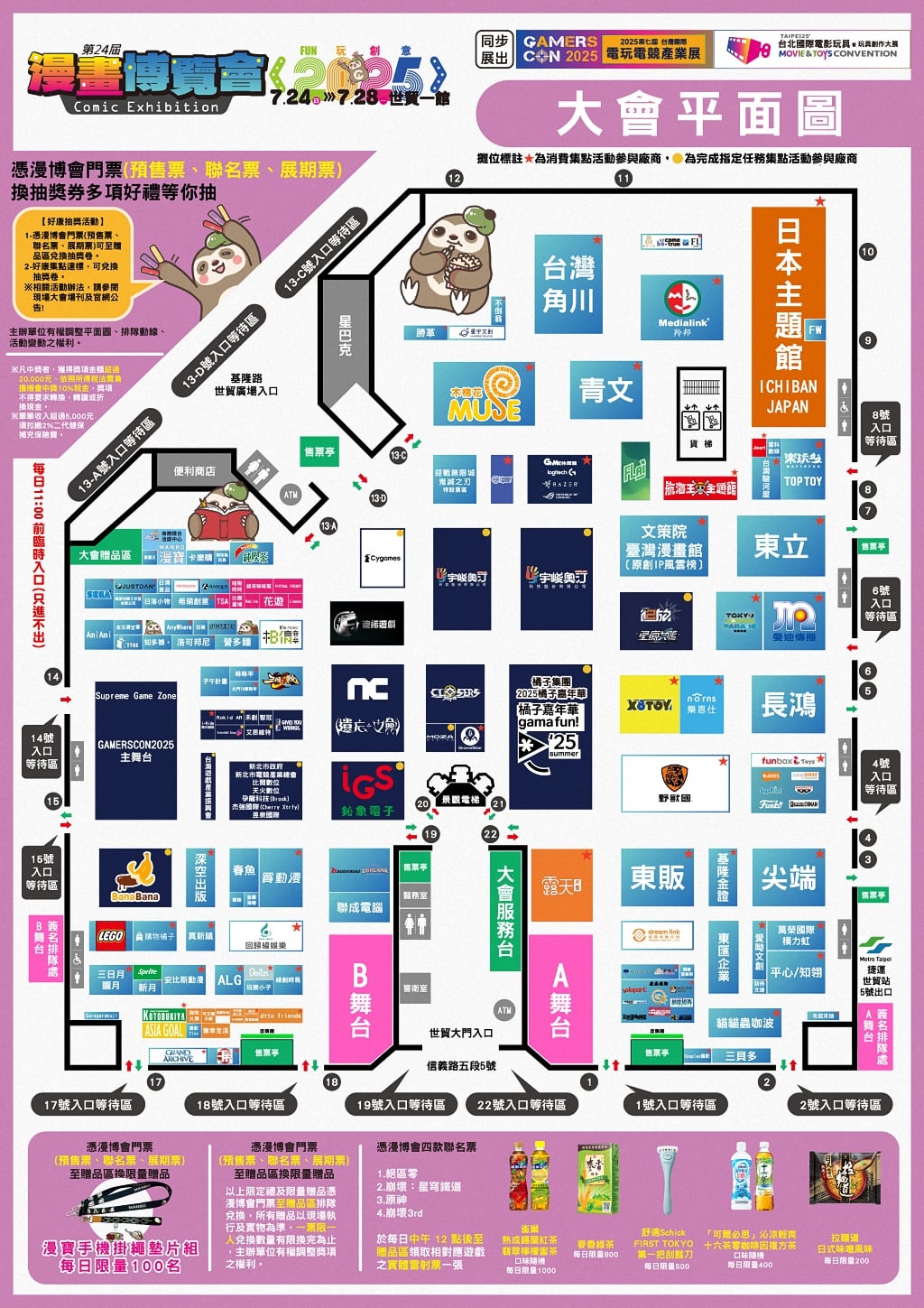 第24屆漫畫博覽會於 2025 年 7 月 24 日(週四)至 28 日(週一)在台北世貿展覽一館熱鬧登場,每天上午 10 點至下午 6 點開放參觀。活動地點位於北市信義路五段5號,交通便利,是台灣年度最受矚目的動漫盛事之一。主辦單位貼心規劃,120 公分(含)以下兒童在家長陪同下可免費入場,身障朋友及 65 歲以上長者同樣享有免費入場優惠,只需於 10:30 後憑證由正門入場,而陪同者則需購票。現場提醒來賓妥善保管財物,並呼籲大家共同維護展場環境,切勿隨意丟棄垃圾或 DM,讓每位漫迷都能有愉快的參觀體驗。