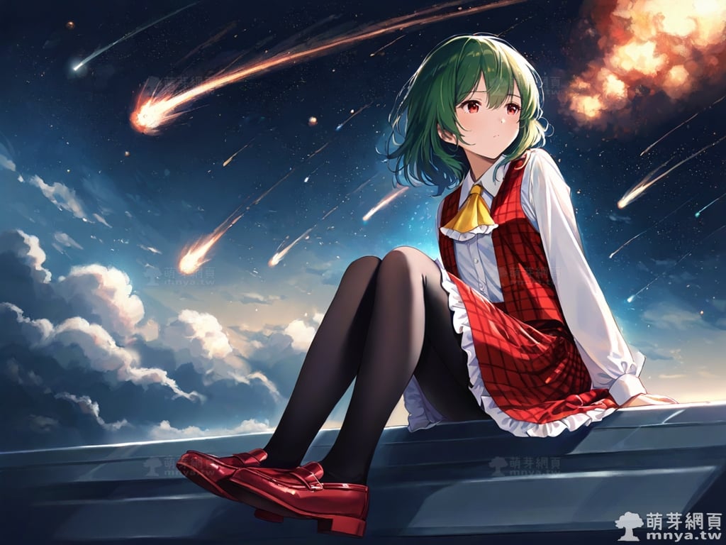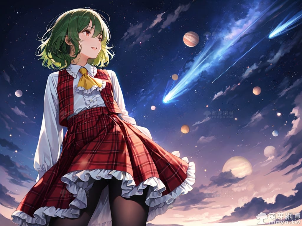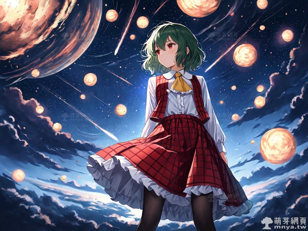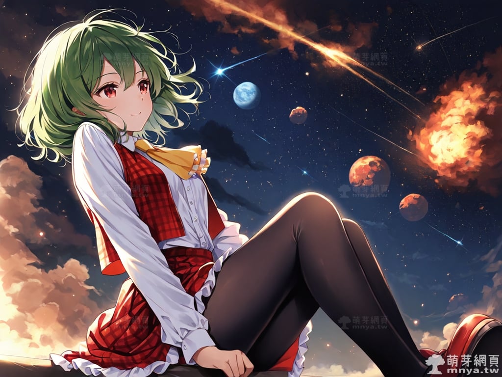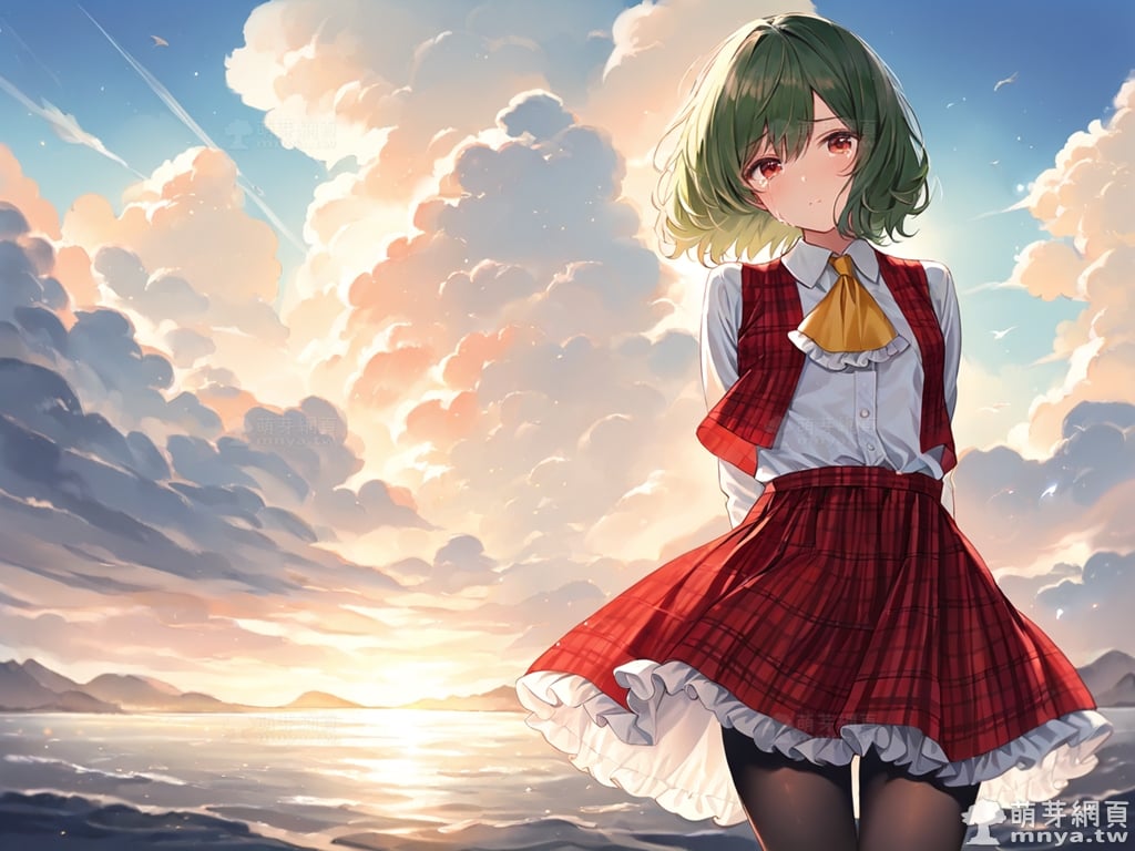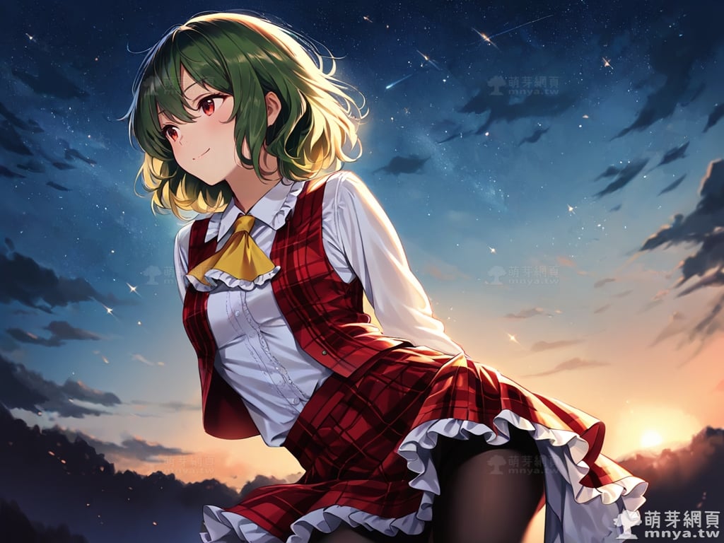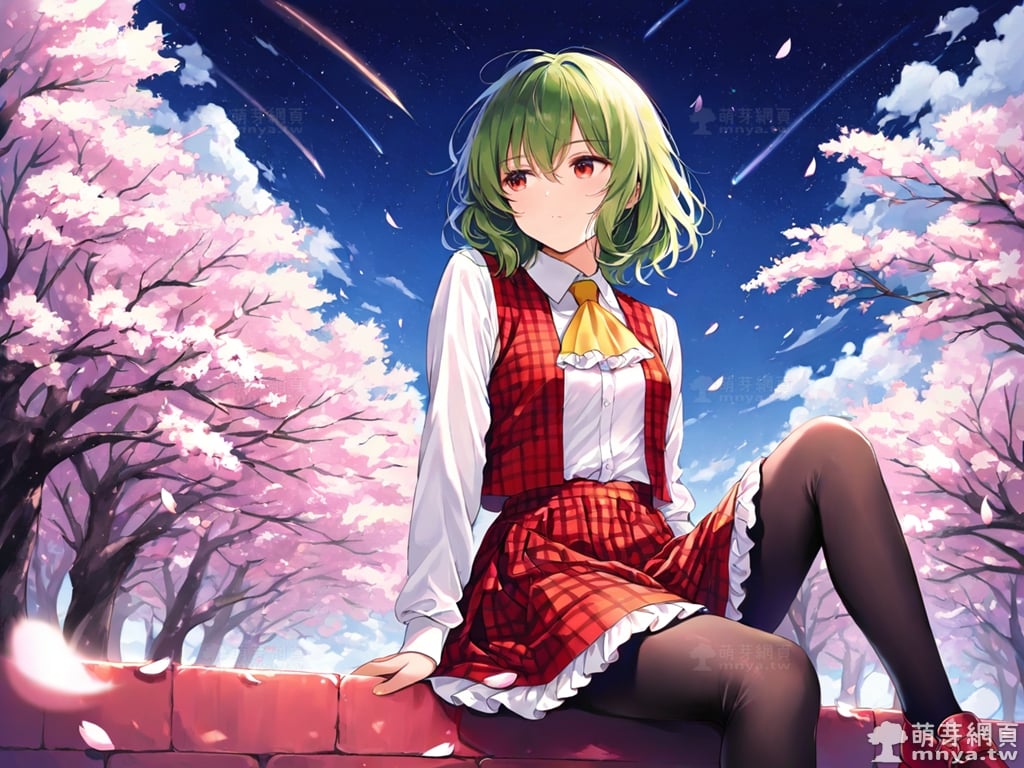 提詞文字:(masterpiece), (high quality), (high score), (great score), (year 2020), (kawaii), (loli), (photorealistic:0.1), 1girl, solo, (kazami yuuka), touhou, __posture__, short hair, green hair, hair between eyes, red eyes, ascot, black pantyhose, frilled skirt, frills, pantyhose, plaid clothes, plaid skirt, plaid vest, red shoes, red skirt, red vest, shirt, short hair, skirt, vest, white shirt, yellow ascot, shoes, medium breasts, breasts, cowboy shot, __looking__, __expression__, __background__.